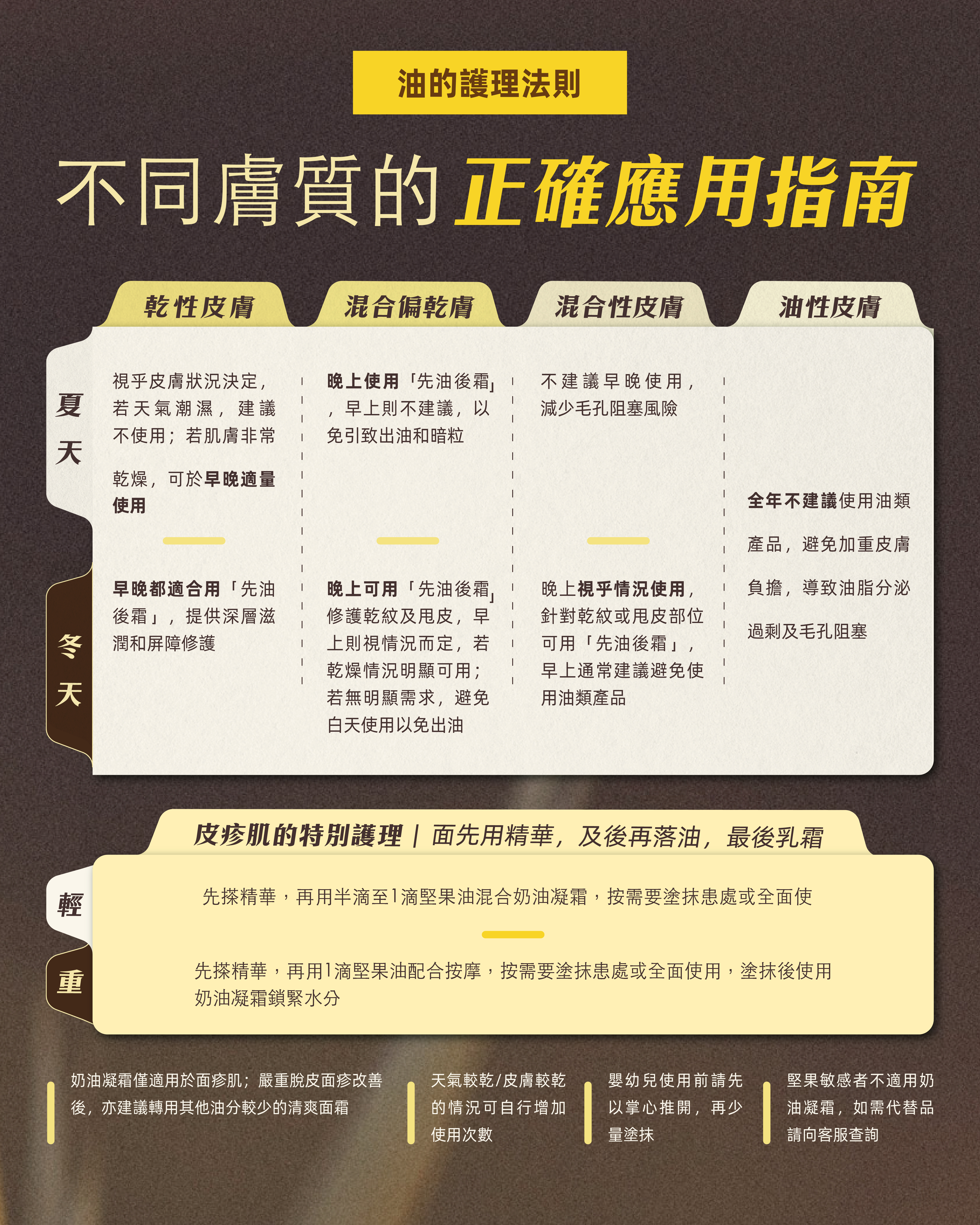 要改善乾敏肌的結構性乾燥缺水,需要持續配合正確的護膚程序,記住「先油後霜」或 「先霜後油」口訣。針對面疹肌或需加強日常護理的乾性/混乾肌膚,宜用「先油後霜」,深層滋潤與表層鎖水雙管齊下,提升滋潤效果。不過,混合性肌膚於乾燥的冬季可能需要調整護膚程序,建議「先霜後油」,通過先用保水力高的面霜打底,減低油分直接被吸收,再補上滋潤性強的護膚油,從而大大減低油分阻塞毛孔的風險,避免誘發暗粒。