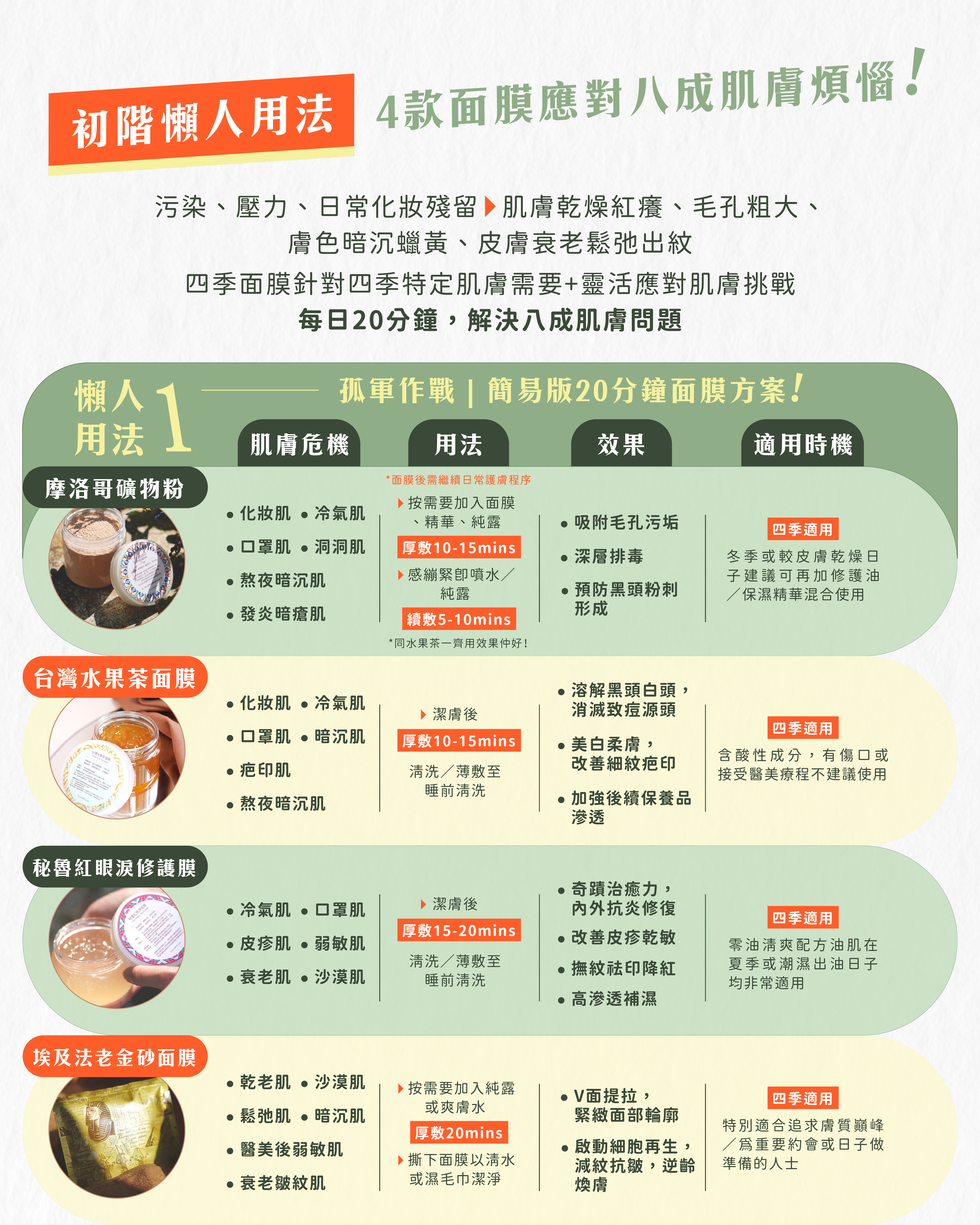身土深明不同人對皮膚有不同追求,有人願意去美容院花費萬元進行療程,有人連基本護膚都覺麻煩,於是研究出將美容院級保養濃縮的四季面膜系列——深層潔淨的摩洛哥礦物粉和台灣水果茶面膜、修護保濕兼具的紅眼淚修護膜、即時緊緻V面逆齡的埃及法老金砂面膜,通過靈活的組合使用,讓用家不用再硬食買極都不夠用的護膚品,亦不需再為天價美容院療程肉赤,在家隨時進行專業級保養,省下時間金錢,實現自主家居保養,全方位解決肌膚問題。
