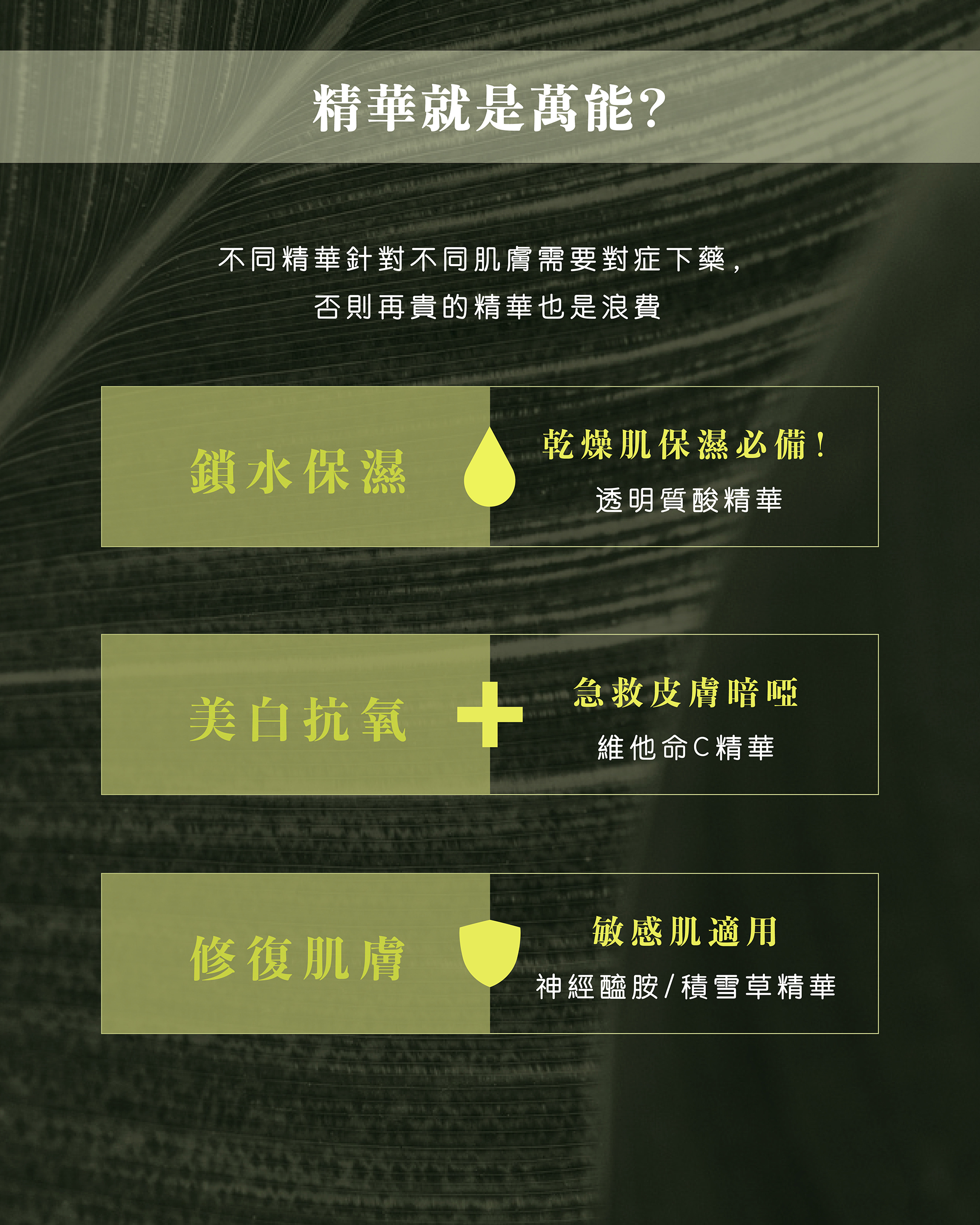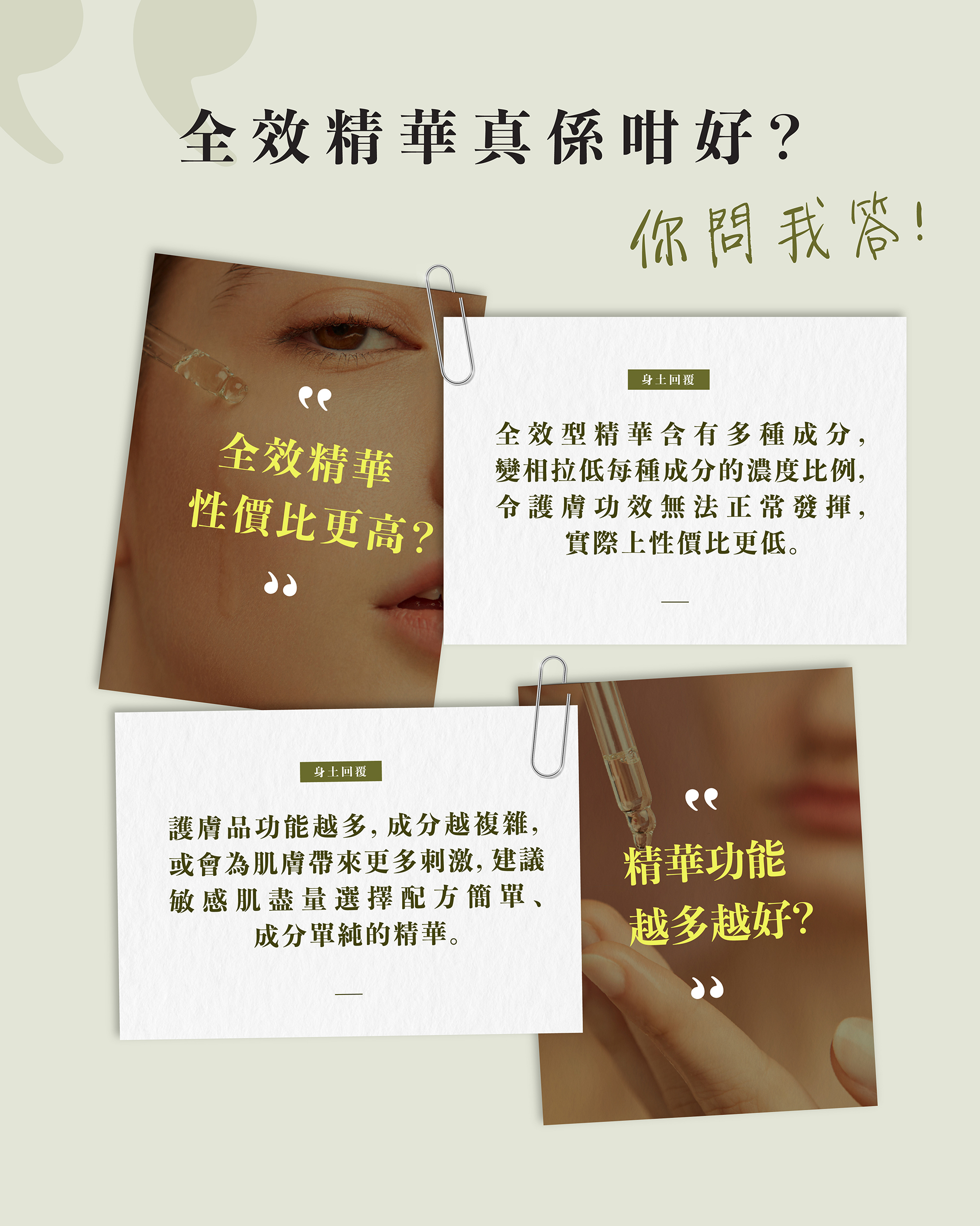 試想想,市面上可以買到有齊洗頭、焗油和洗身功能的「All in one沐浴洗頭水」,方便快捷,價錢又比逐支買便宜,但你會安心使用嗎?全效精華也是同樣道理,而且還要用於更敏感脆弱的面部肌膚上!全效型的精華驟眼看似方便,但事實是,護膚品功能越多,成分就越複雜,越有機會為敏感肌帶來刺激,再者,一支精華的成分和濃度有限,難以深層保濕、美白,同時又要滿足修復敏感泛紅和抗老祛斑等多重需求,肌膚的問題需要「針對性」護理,而非單靠一支「全效」產品。要揀啱精華,重點針對,先可以最大化精華功效。