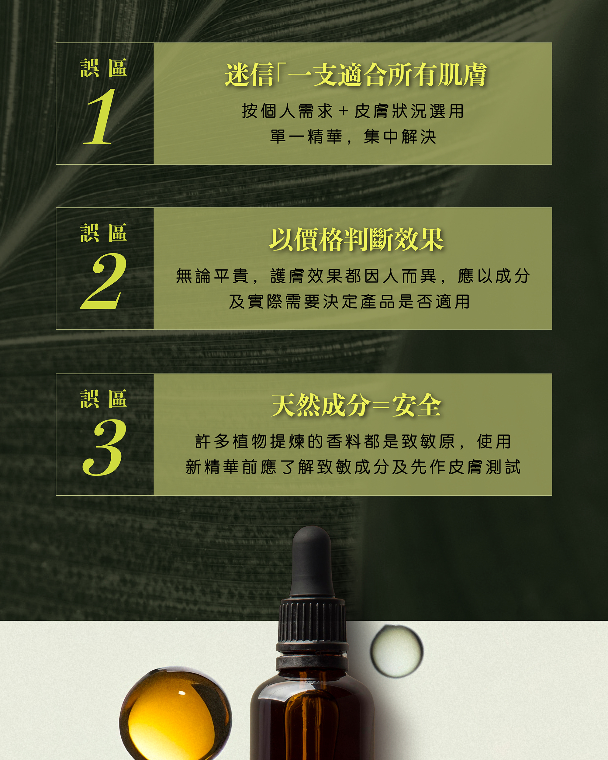 市面上有多種不同類型的精華,揀錯精華不只嘥錢嘥時間,分分鐘仲會引起過敏,變相貼錢買難受。到底要如何挑選適合自己的精華?馬上拆解三個常見的「精華誤區」,助你避開精華陷阱:
