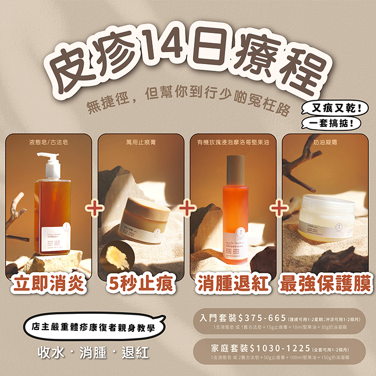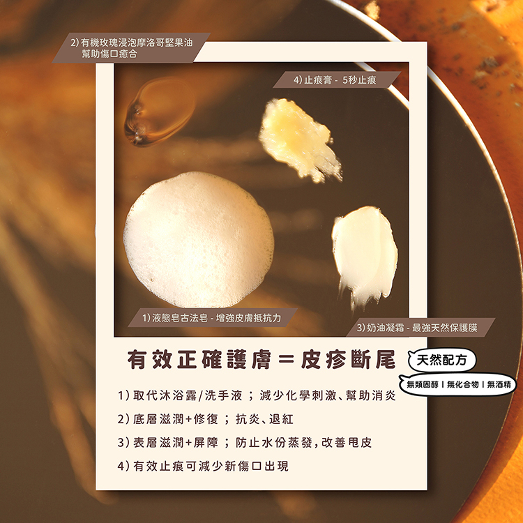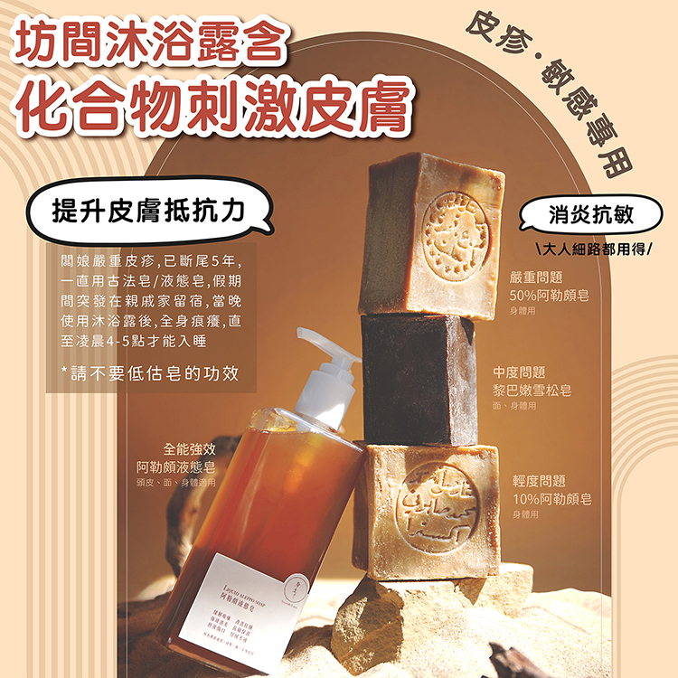 要根治皮疹問題,第一步是避免使用容易致敏的沐浴露,轉用集潔淨、消炎和滋潤於一身的產品輔助,斷絕皮疹循環。身土不二出品的皮疹皂針對不同需要的患者而設,當中阿勒坡硬皂僅以純淨月桂果油、橄欖油和橡木水古法製作,月桂果油具高度抗炎抗菌和滋潤能力,特別適合敏感肌與皮疹肌使用。阿勒坡硬皂度數越高,代表所含的月桂果油比例越高,滋潤度越高,舒緩皮疹的速度亦越快