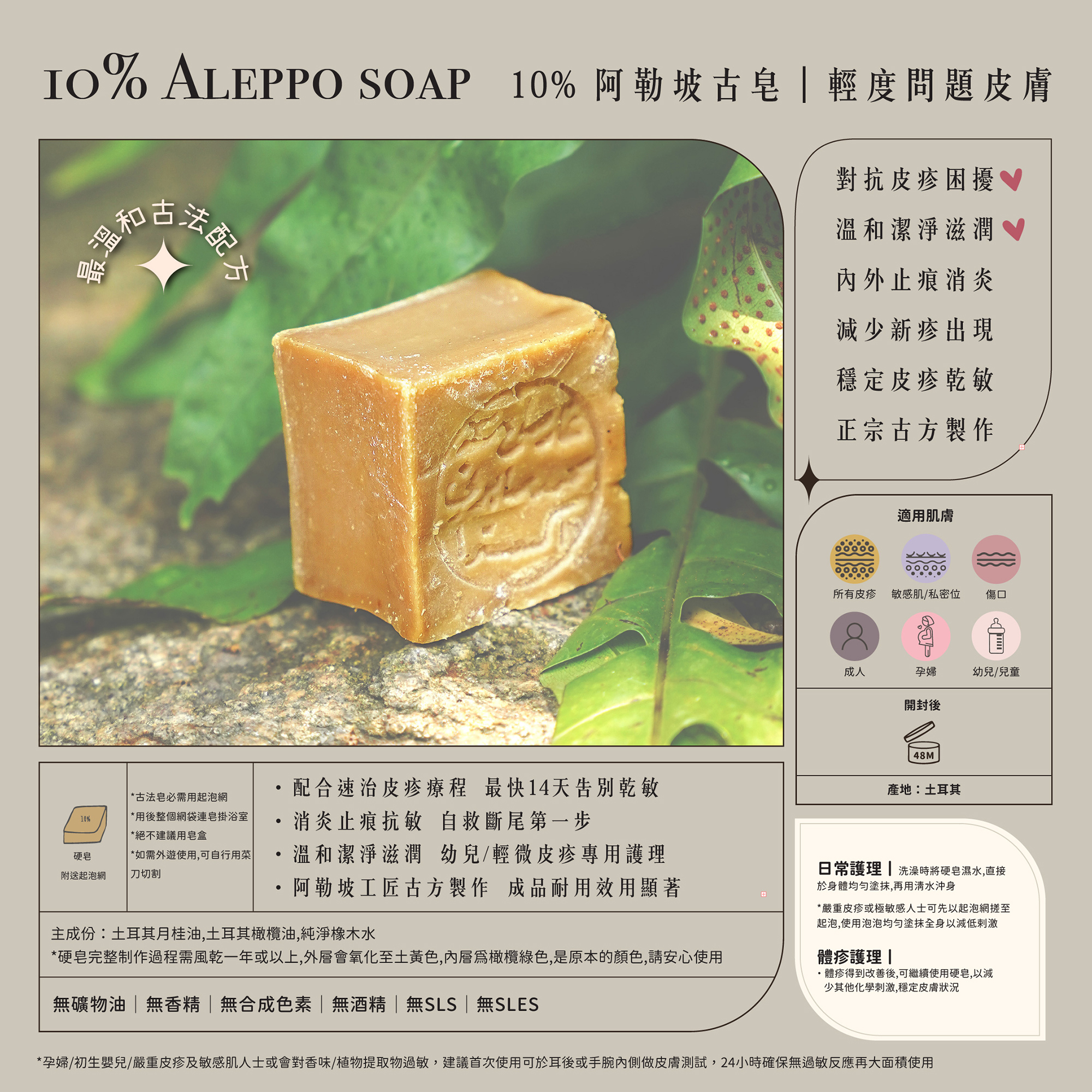 10%阿勒坡古皂含有10%月桂果油,修復皮膚底層發炎紅腫,滋潤皮膚表面屏障,改善乾敏症狀,內外止痕,減少新疹出現,同時促進舊疹消炎癒合,是根治皮疹及維持皮膚穩定的必備產品