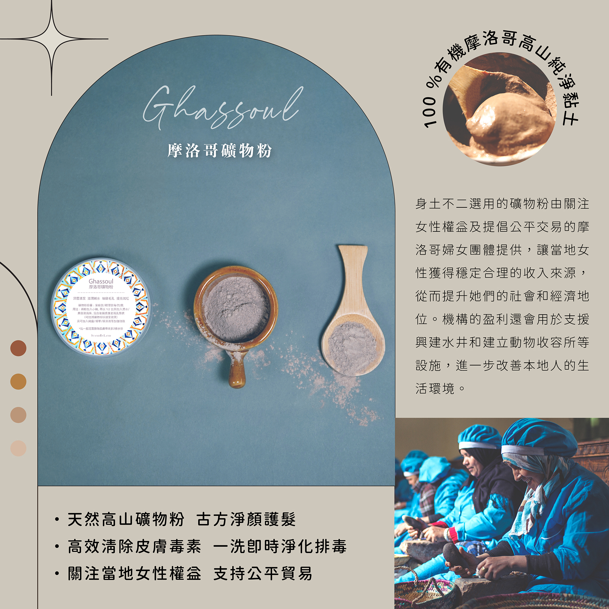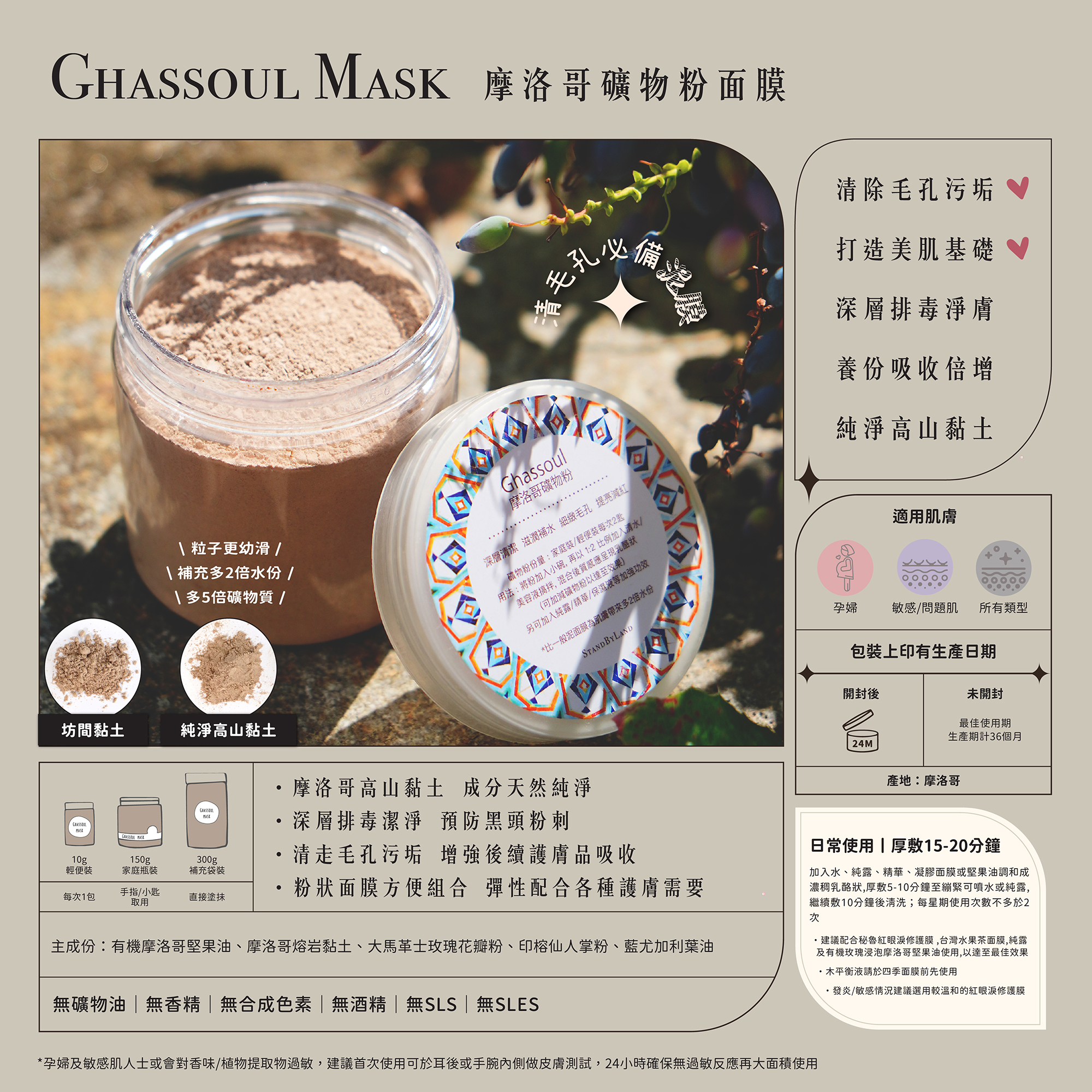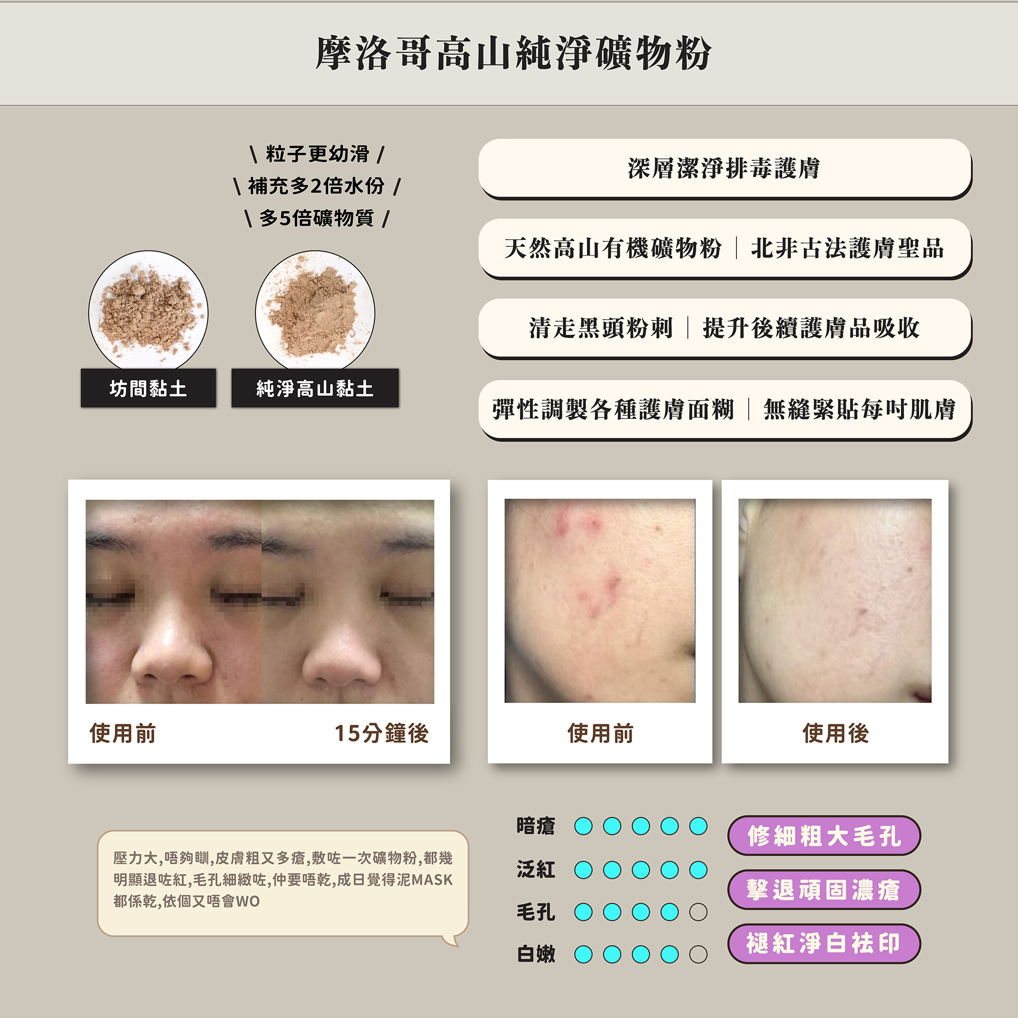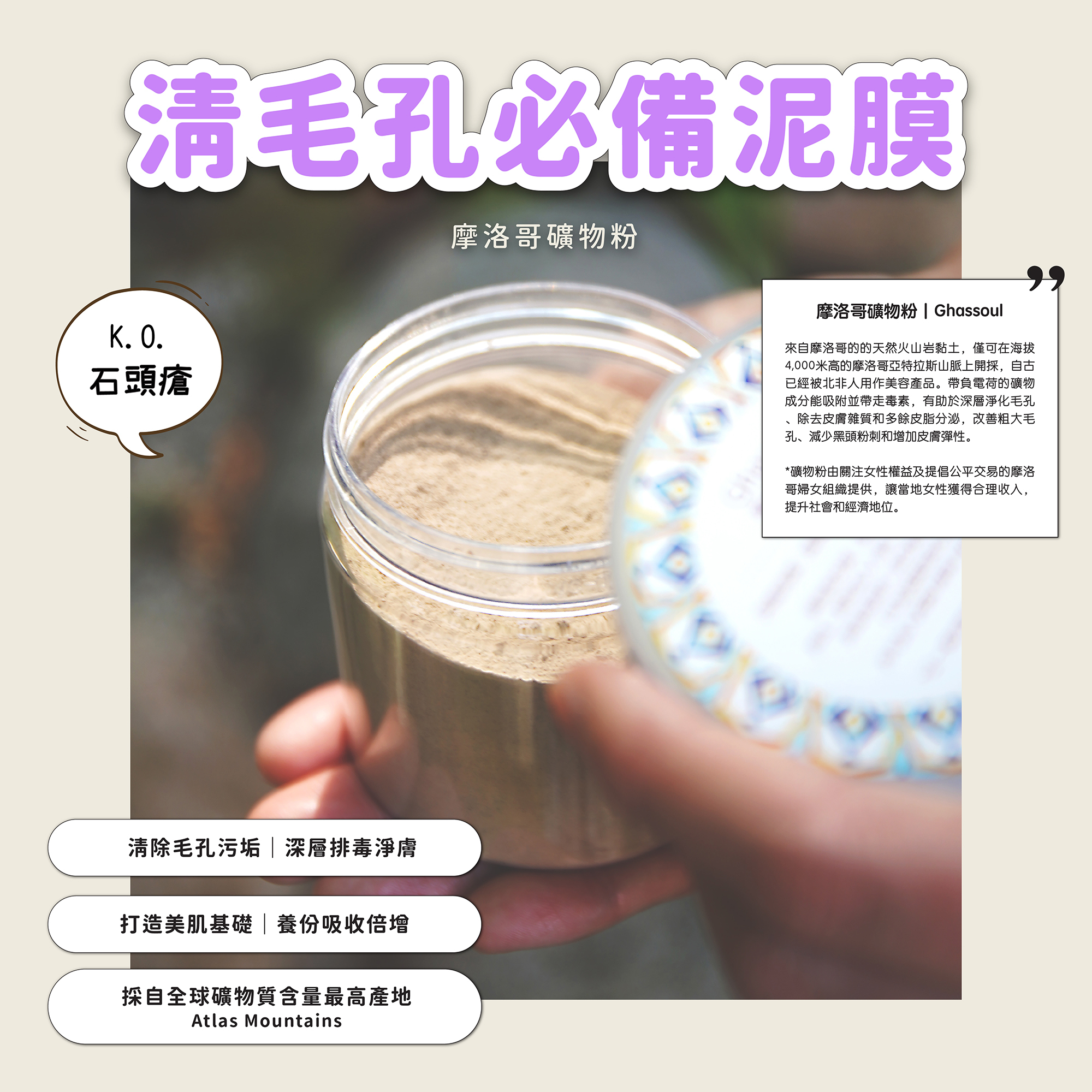 摩洛哥礦物粉蘊含豐富磺物質,有效帶走殘留在皮膚的毒素,潔淨多餘油脂及老化角質,清走日積月累的毛孔污垢,溶解同時預防粉刺形成,為肌膚打好基礎,提升肌膚對後續護膚品的吸收。單獨使用可重點為肌膚深層清潔及排毒,即時消炎祛腫,加速暗瘡凋謝,亦可因應皮膚狀態,彈性加入對美白保濕褪紅有加乘作用的秘魯紅眼淚修護膜、強力溶解黑頭的台灣水果茶面膜,或添加各種精華、純露、堅果油。每週持續使用,20分鐘打造健康細滑的肌膚基礎