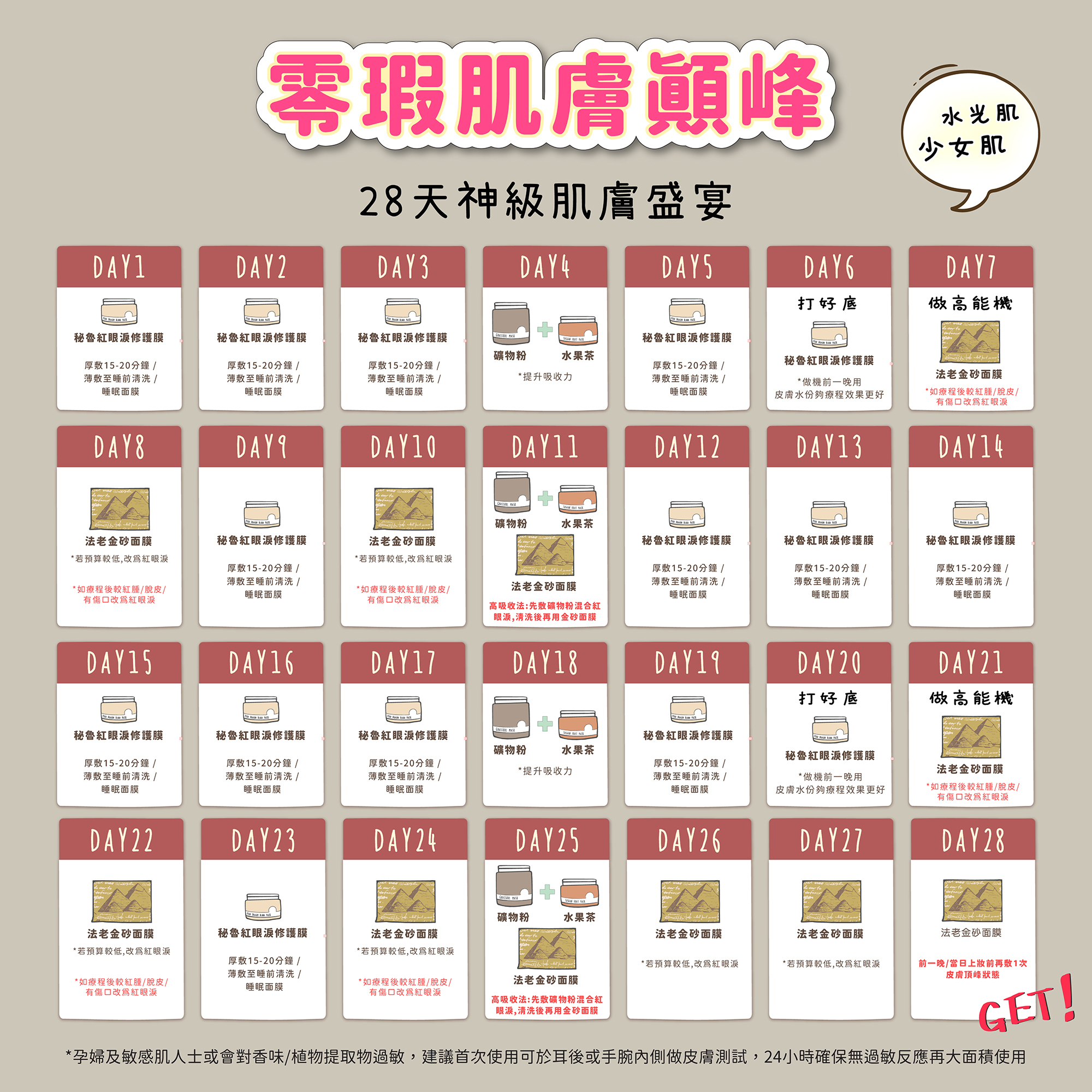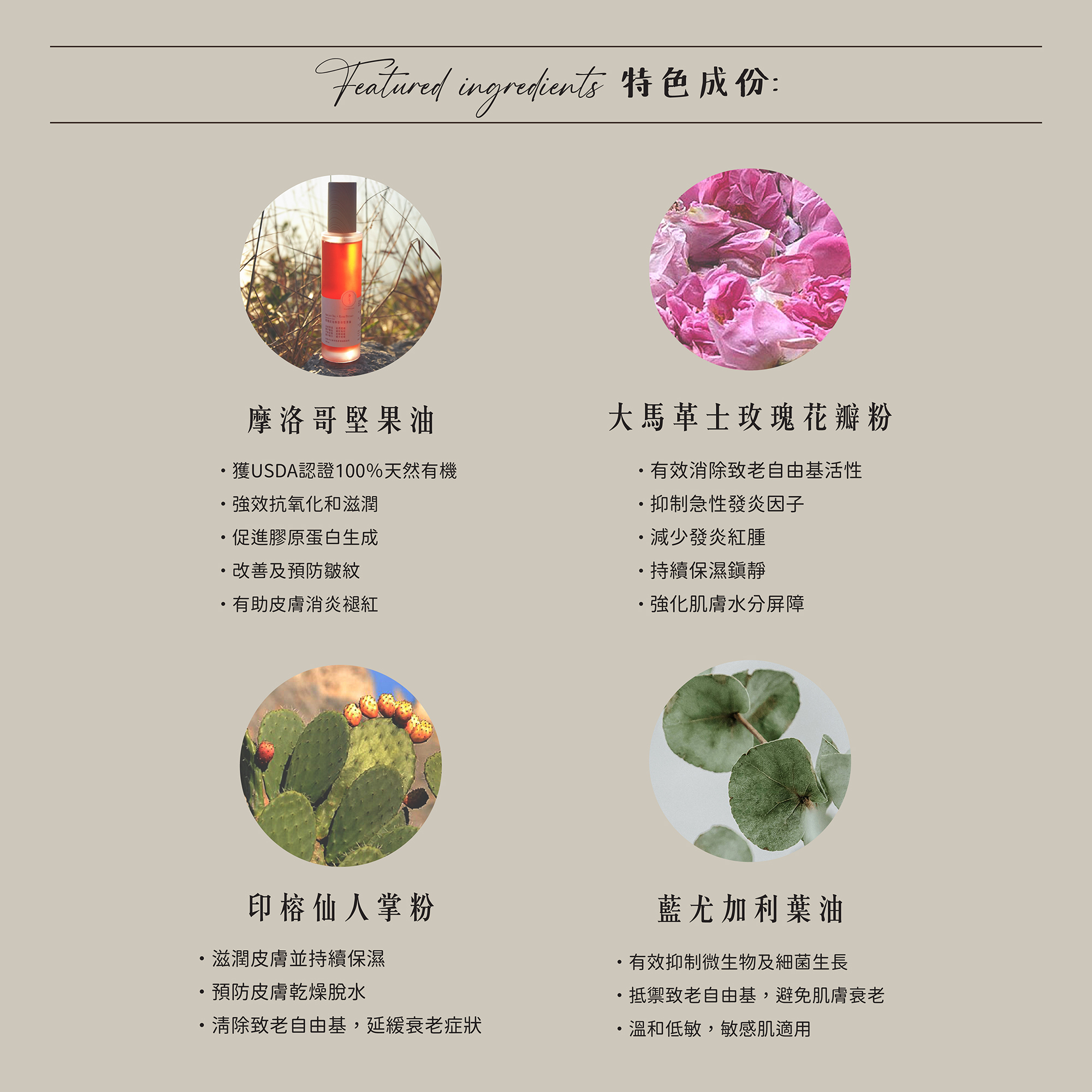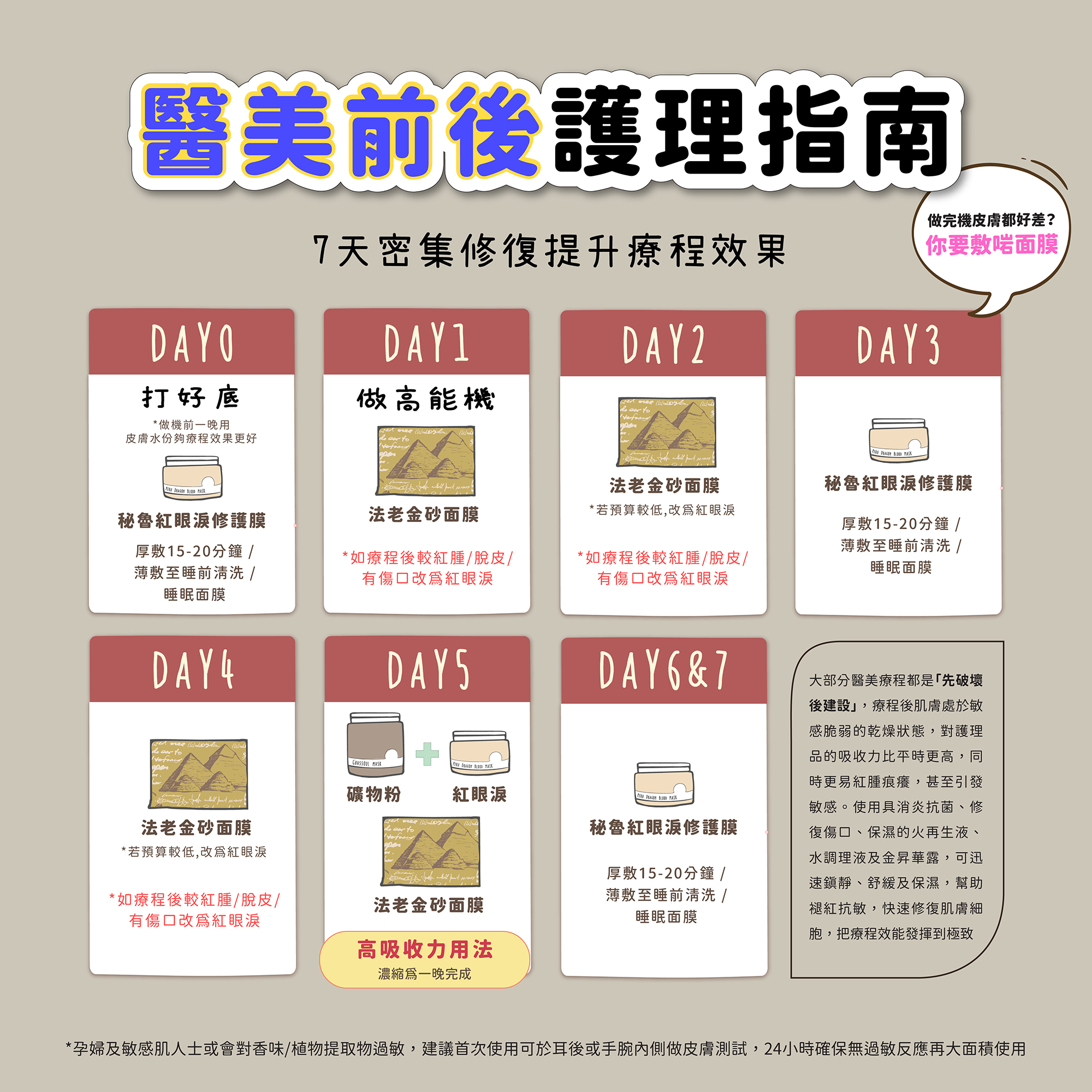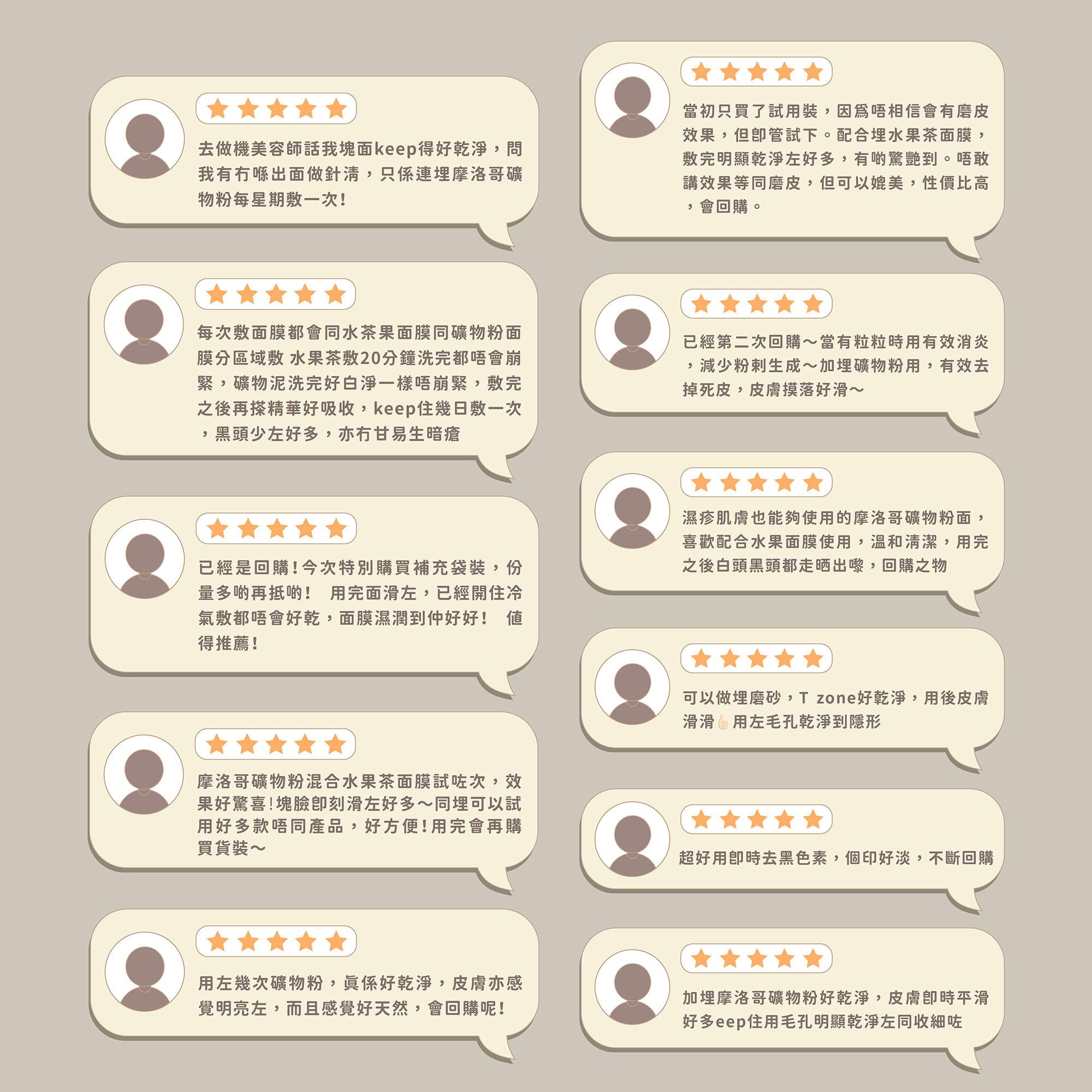 摩洛哥礦物粉蘊含豐富磺物質,有效帶走殘留在皮膚的毒素,潔淨多餘油脂及老化角質,清走日積月累的毛孔污垢,溶解同時預防粉刺形成,為肌膚打好基礎,提升肌膚對後續護膚品的吸收。單獨使用可重點為肌膚深層清潔及排毒,即時消炎祛腫,加速暗瘡凋謝,亦可因應皮膚狀態,彈性加入對美白保濕褪紅有加乘作用的秘魯紅眼淚修護膜、強力溶解黑頭的台灣水果茶面膜,或添加各種精華、純露、堅果油。每週持續使用,20分鐘打造健康細滑的肌膚基礎