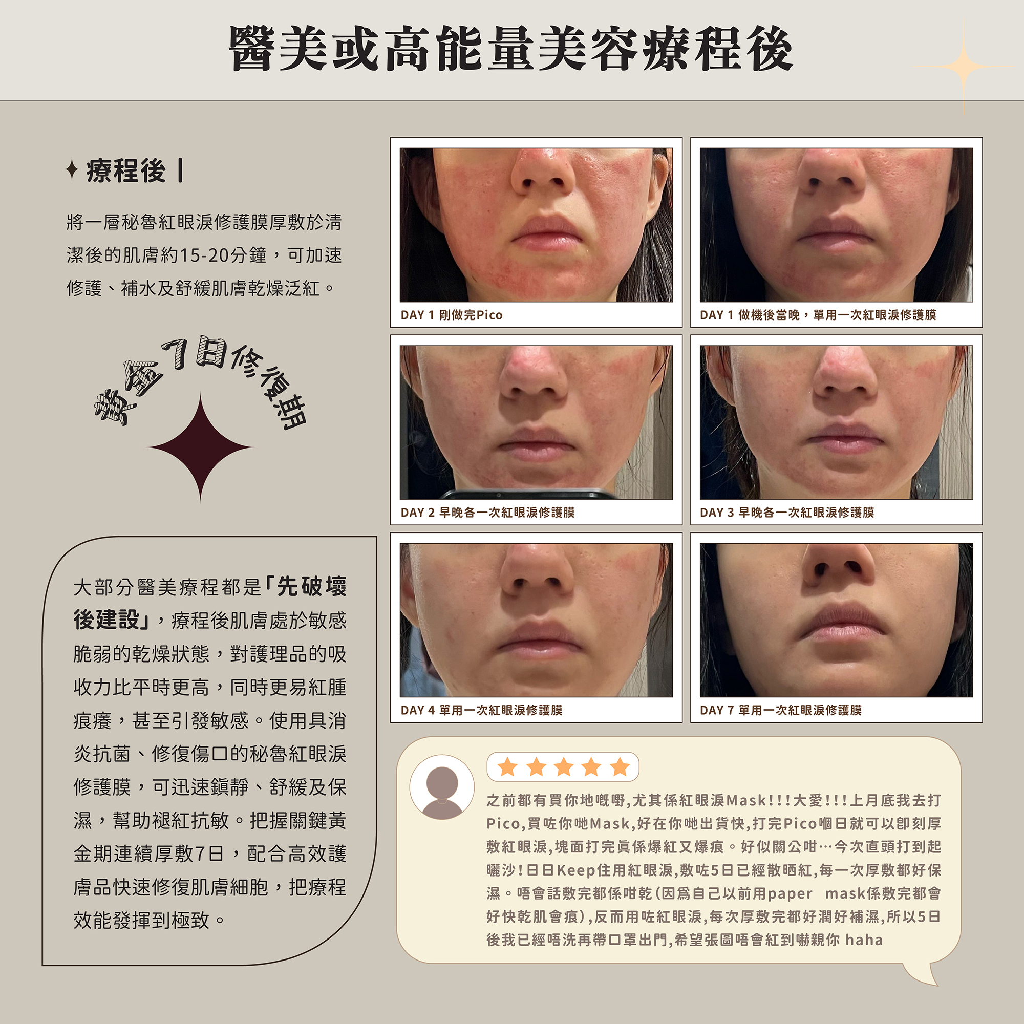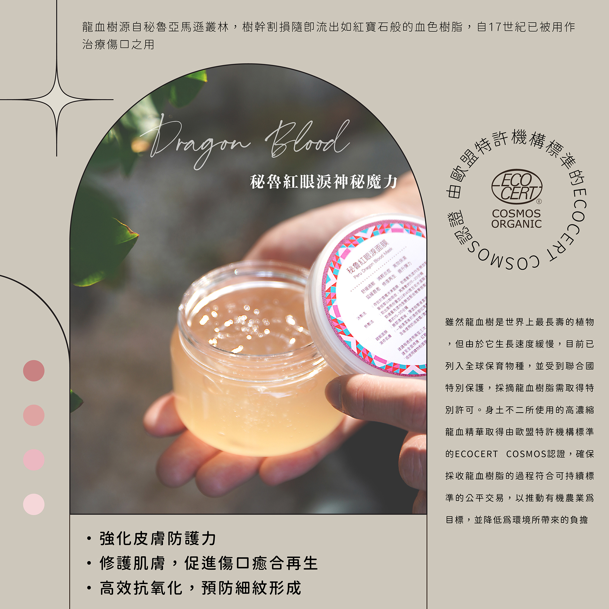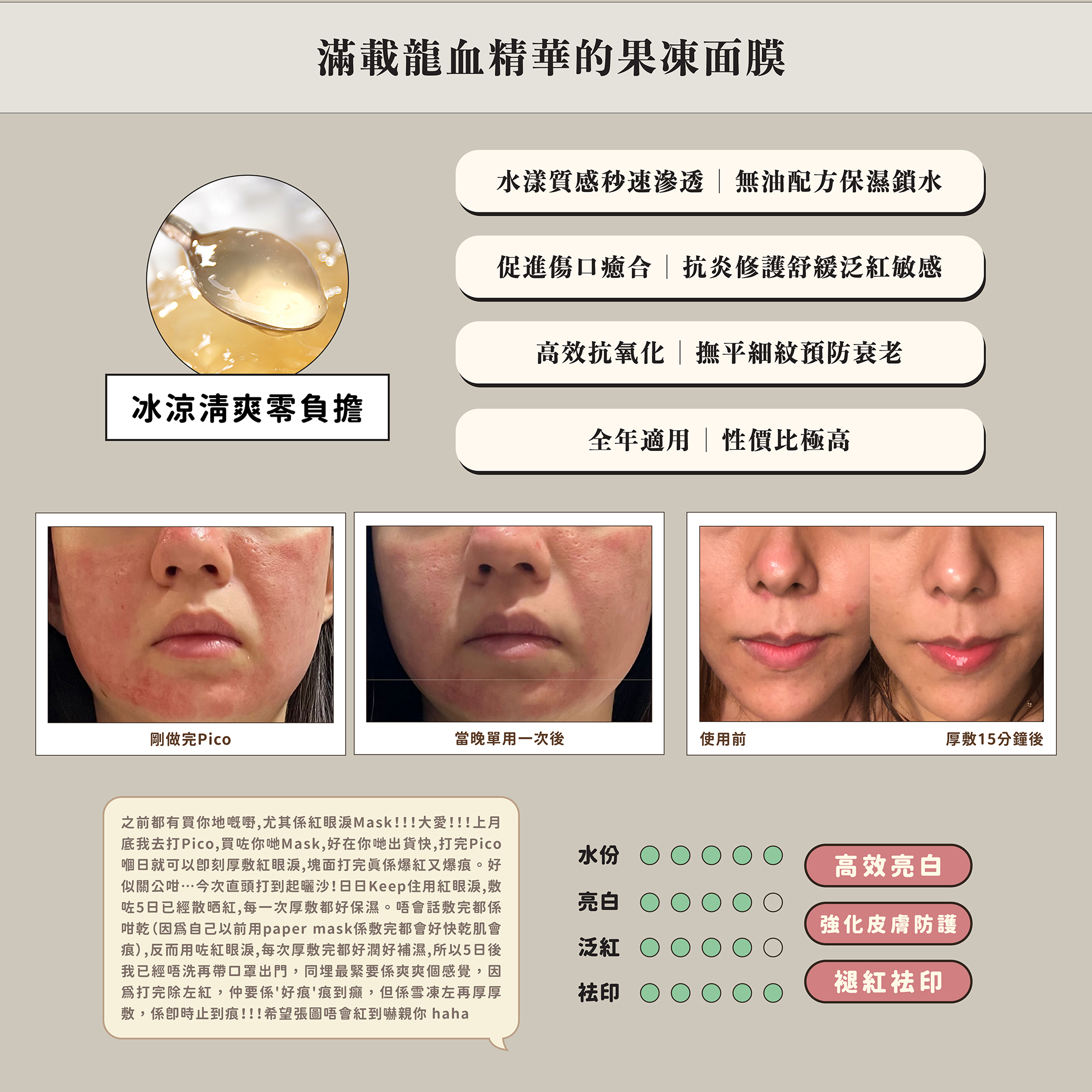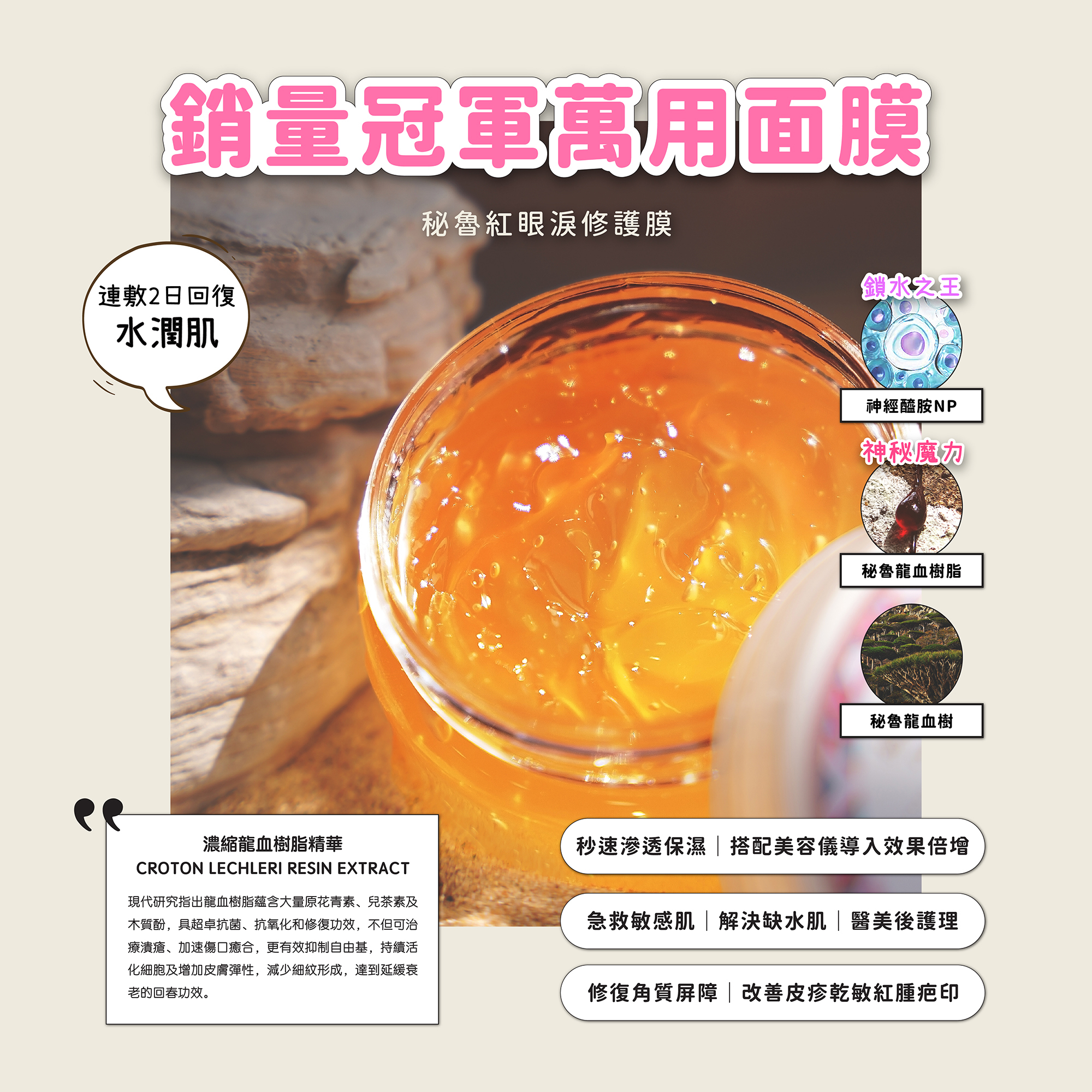 自推出以來一直是身土不二銷量冠軍的面膜,全新升級的第二代的紅眼淚修護膜繼續沿用擁具高度保濕和治癒能力的秘魯龍血樹脂,滋潤不黏溼的龍血精華秒速滲透肌底補充水份,即時消炎抗敏,舒緩肌膚泛紅不適,同時強化肌膚免疫系統,修復及促進傷口癒合。