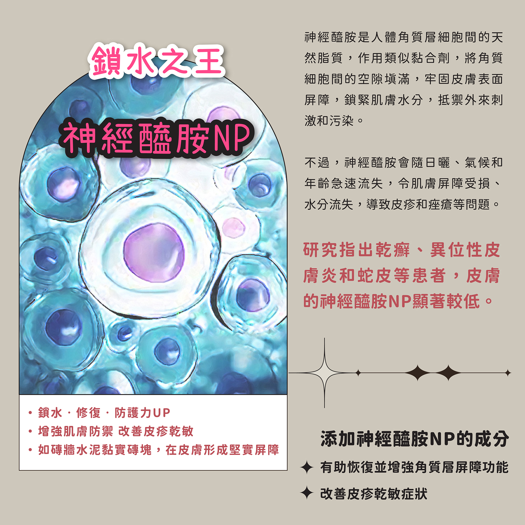 全新添加神經醯胺NP成分,修復並增強因日曬、氣候和年齡急速衰弱的角質屏障,鎖緊水分並減少肌膚水分流失,抵禦外來刺激和污染,改善皮疹和乾敏症狀。神經醯胺NP經研究證實,有效改善因角質受損而引起的乾癬、異位性皮膚炎和蛇皮等皮膚問題,持續修護和強化肌膚屏障