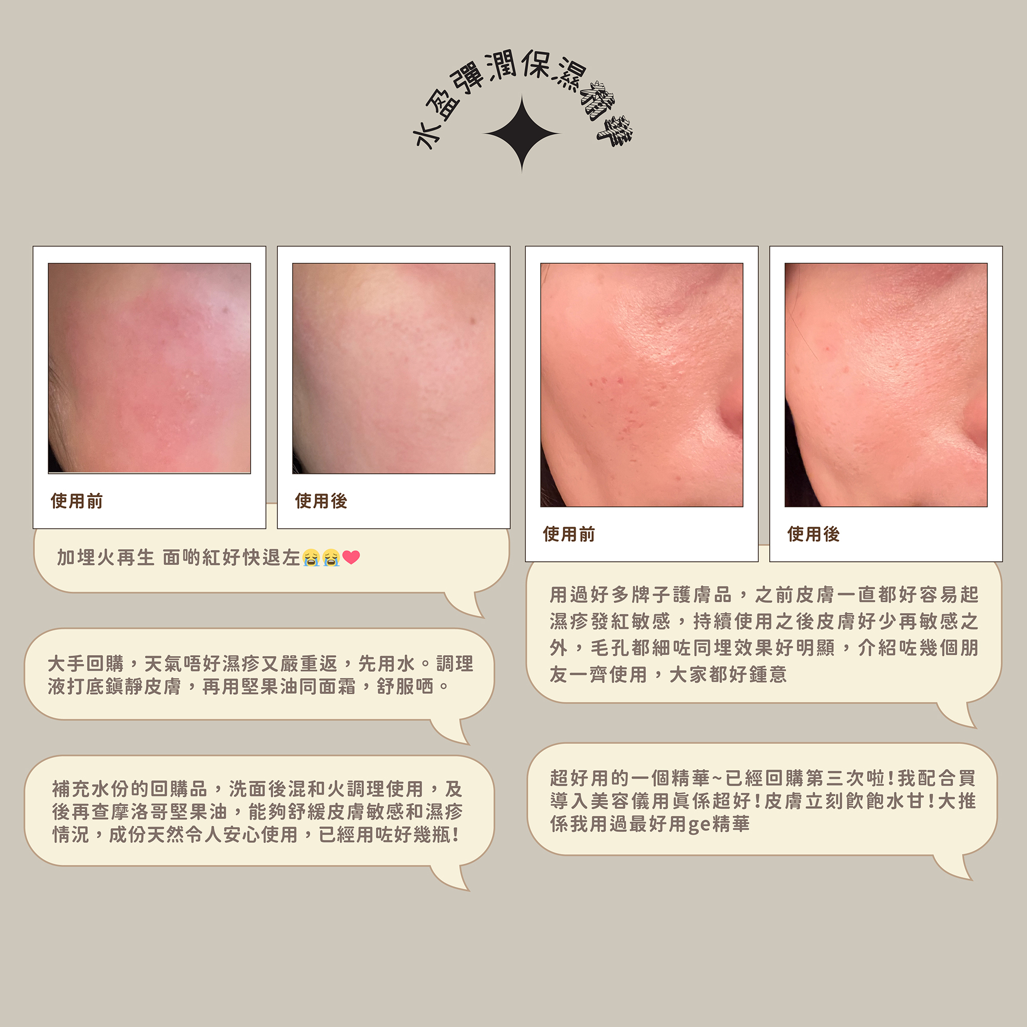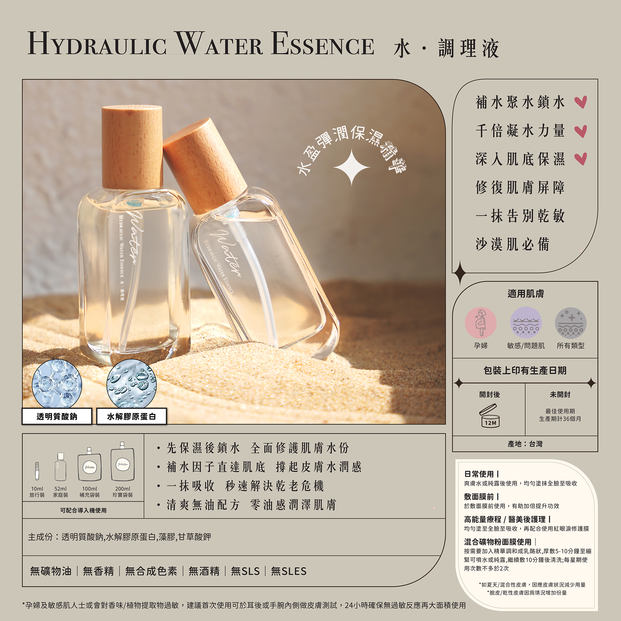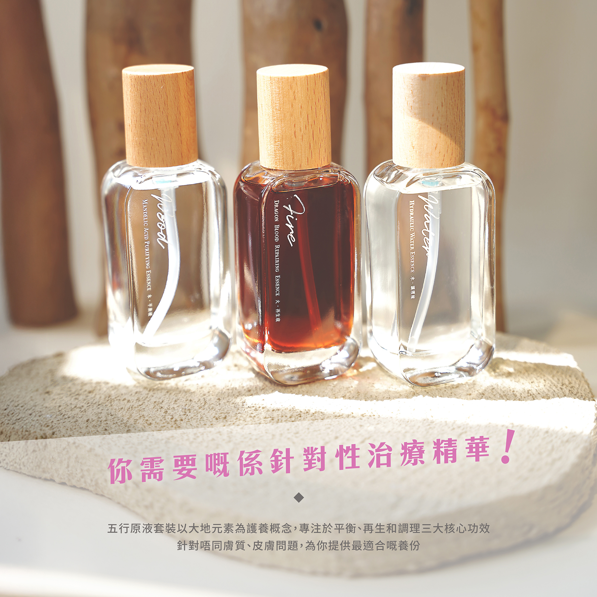 以五行概念研發的調理精華液系列,水.調理液含高濃度膠原蛋白、玻尿酸原液和藻膠精華,可提升皮膚吸收水分的能力,強化真皮層的網狀纖維,令皮膚更緊密有彈性,縮小毛孔,增加角質層持水力高達1000倍,持續為肌膚保濕鎖水,修復皮膚表面屏障並防止水分流失,集補水、聚水、鎖水三重修護,一抹解決肌膚乾敏繃緊,打造水盈飽滿彈潤肌。