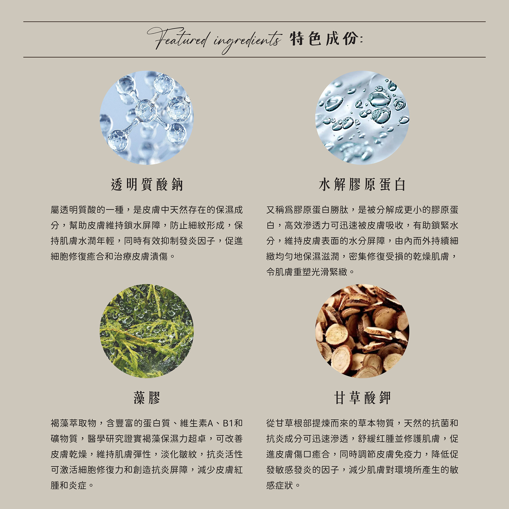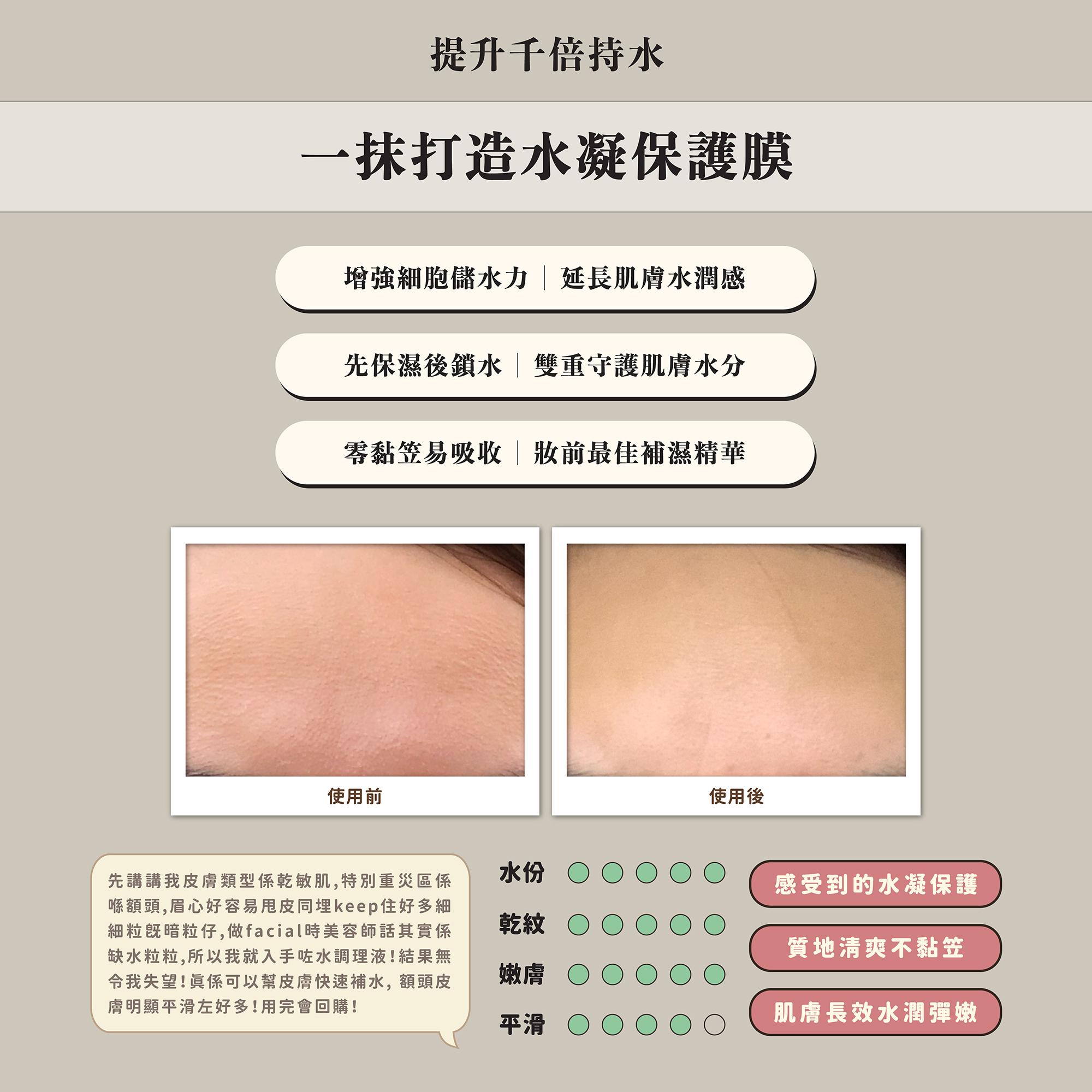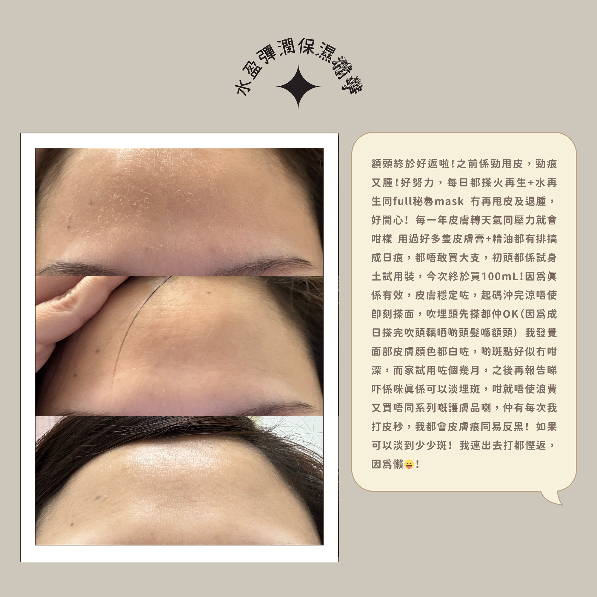以五行概念研發的調理精華液系列,水.調理液含高濃度膠原蛋白、玻尿酸原液和藻膠精華,可提升皮膚吸收水分的能力,強化真皮層的網狀纖維,令皮膚更緊密有彈性,縮小毛孔,增加角質層持水力高達1000倍,持續為肌膚保濕鎖水,修復皮膚表面屏障並防止水分流失,集補水、聚水、鎖水三重修護,一抹解決肌膚乾敏繃緊,打造水盈飽滿彈潤肌。