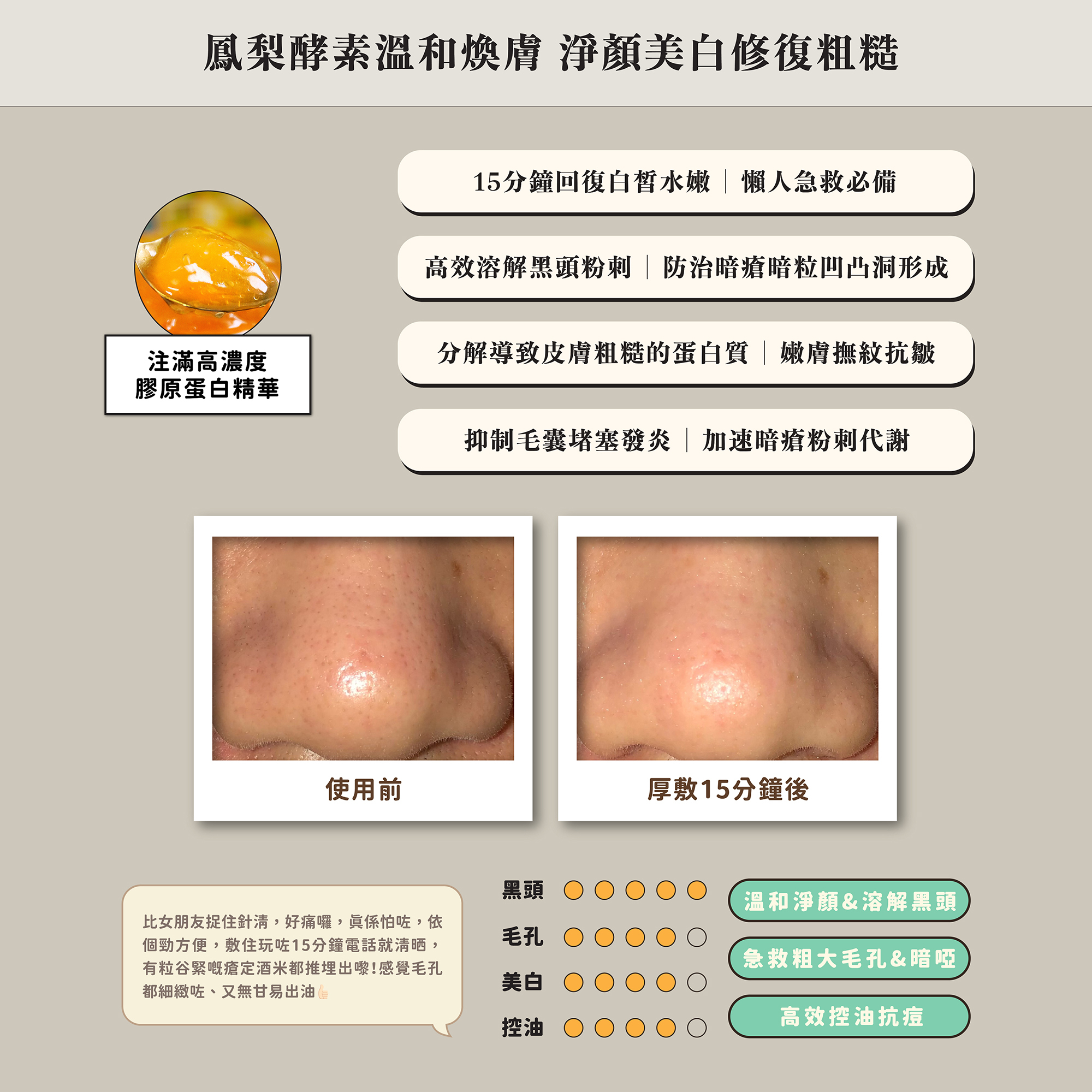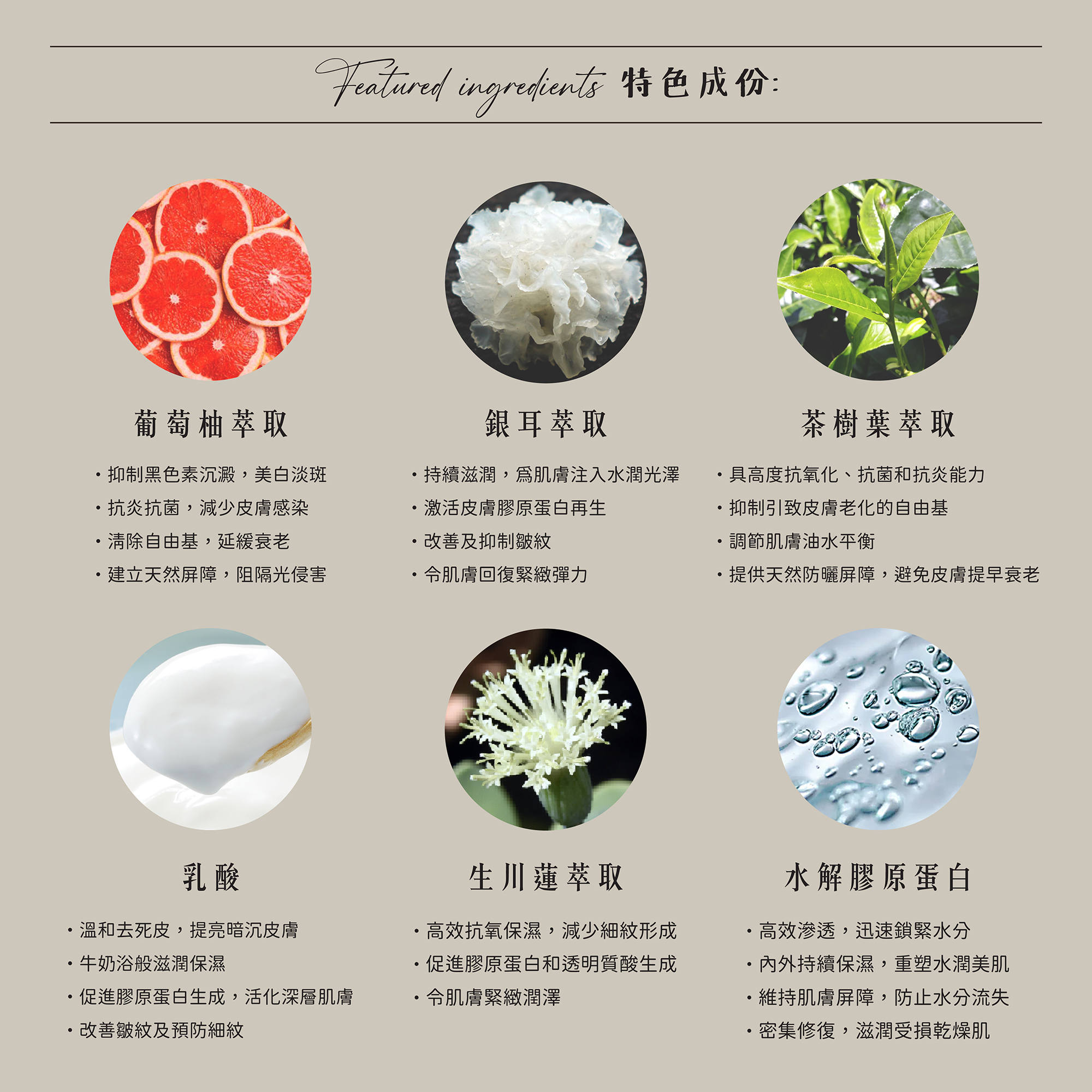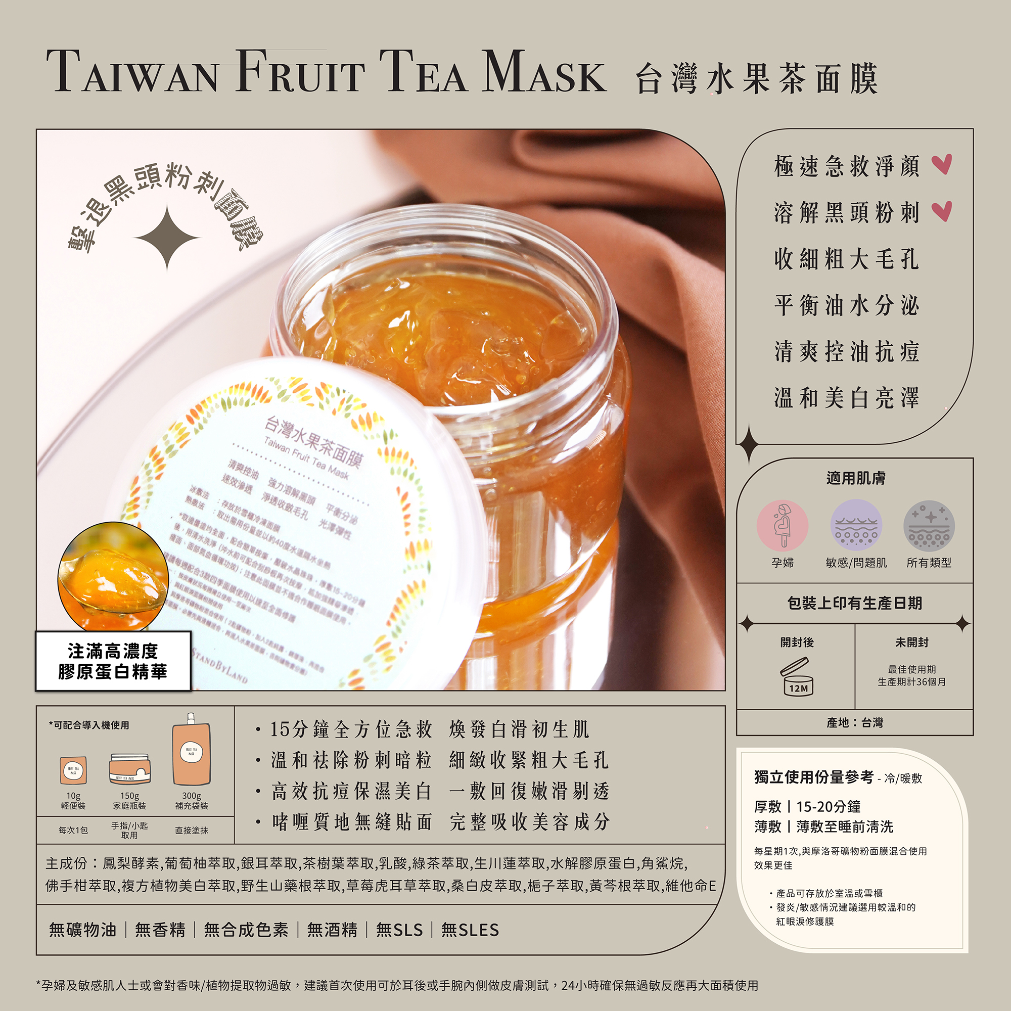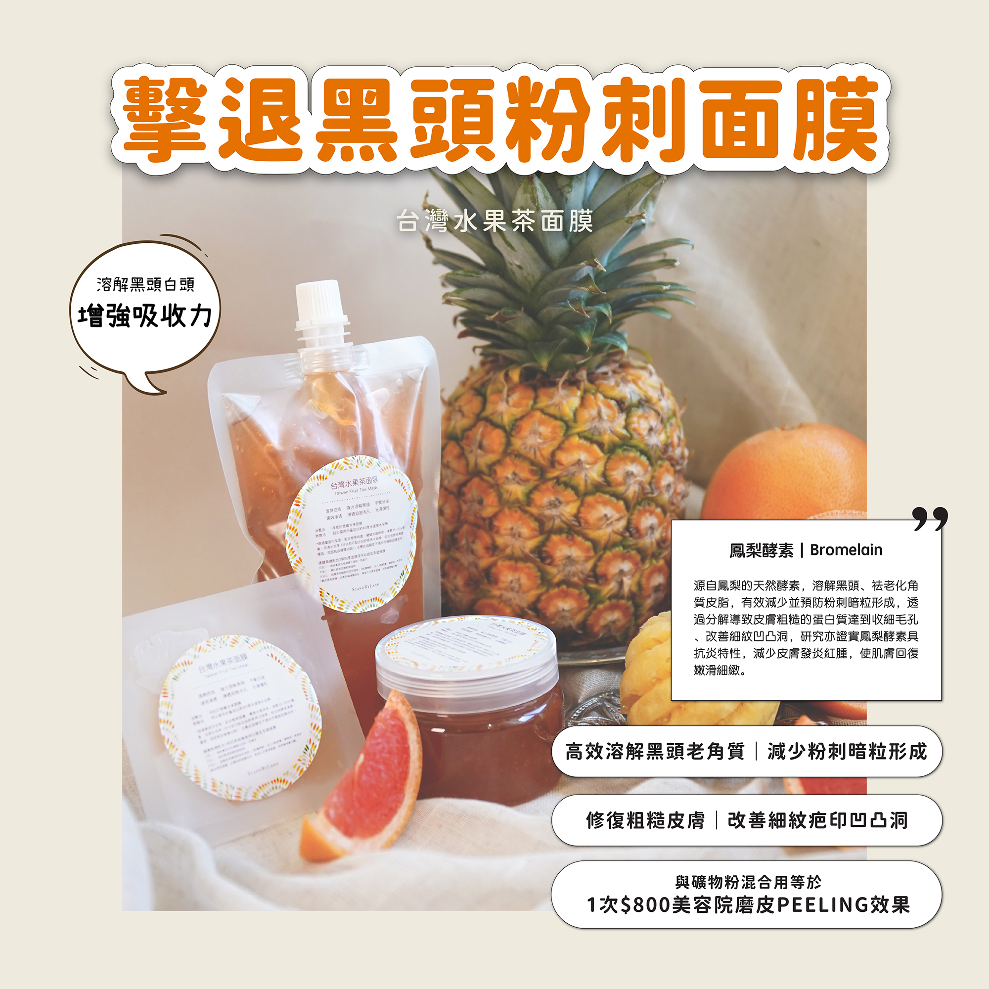 台灣水果茶面膜蘊含豐富的鳳梨酵素,有效溫和去除多餘皮脂及老化角質,溶解黑頭、縮小毛孔,分解導致皮膚粗糙的蛋白質,令肌膚重塑無瑕細嫩,搭配有效抵禦光侵害和抑制衰老,淡化黑斑、改善膚色不均與暗沉的銀耳、山茶花和葡萄萃取,全方位解決各種肌膚問題。凝膠質地的面膜可無縫緊貼肌膚,配合身土不二特研的高濃度水解膠原蛋白珠珠,輕輕按摩即形成強效保濕鎖水的護膚屏障,同時使其他營養成分更高效和完整地被吸收,15分鐘回復白滑剔透的初生肌