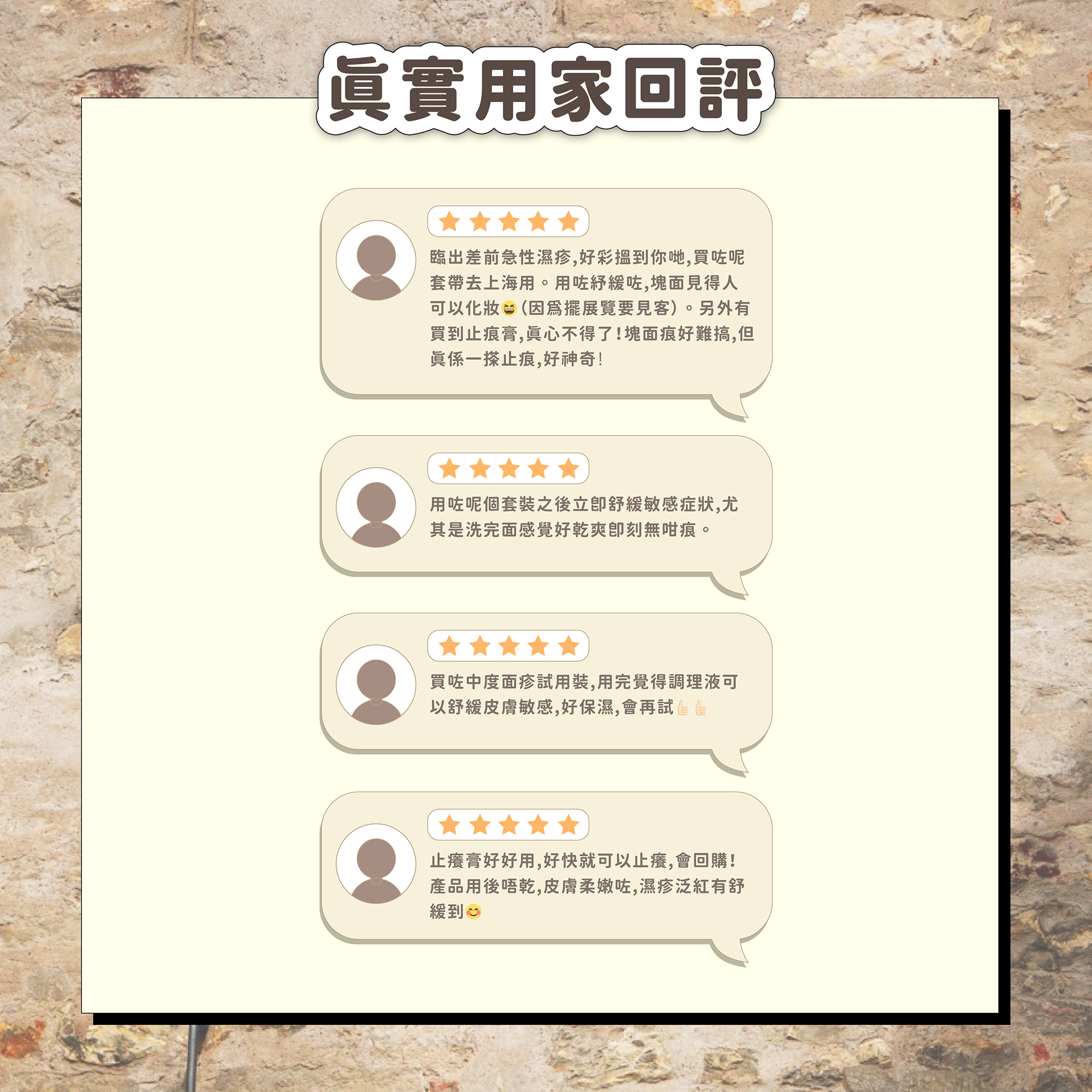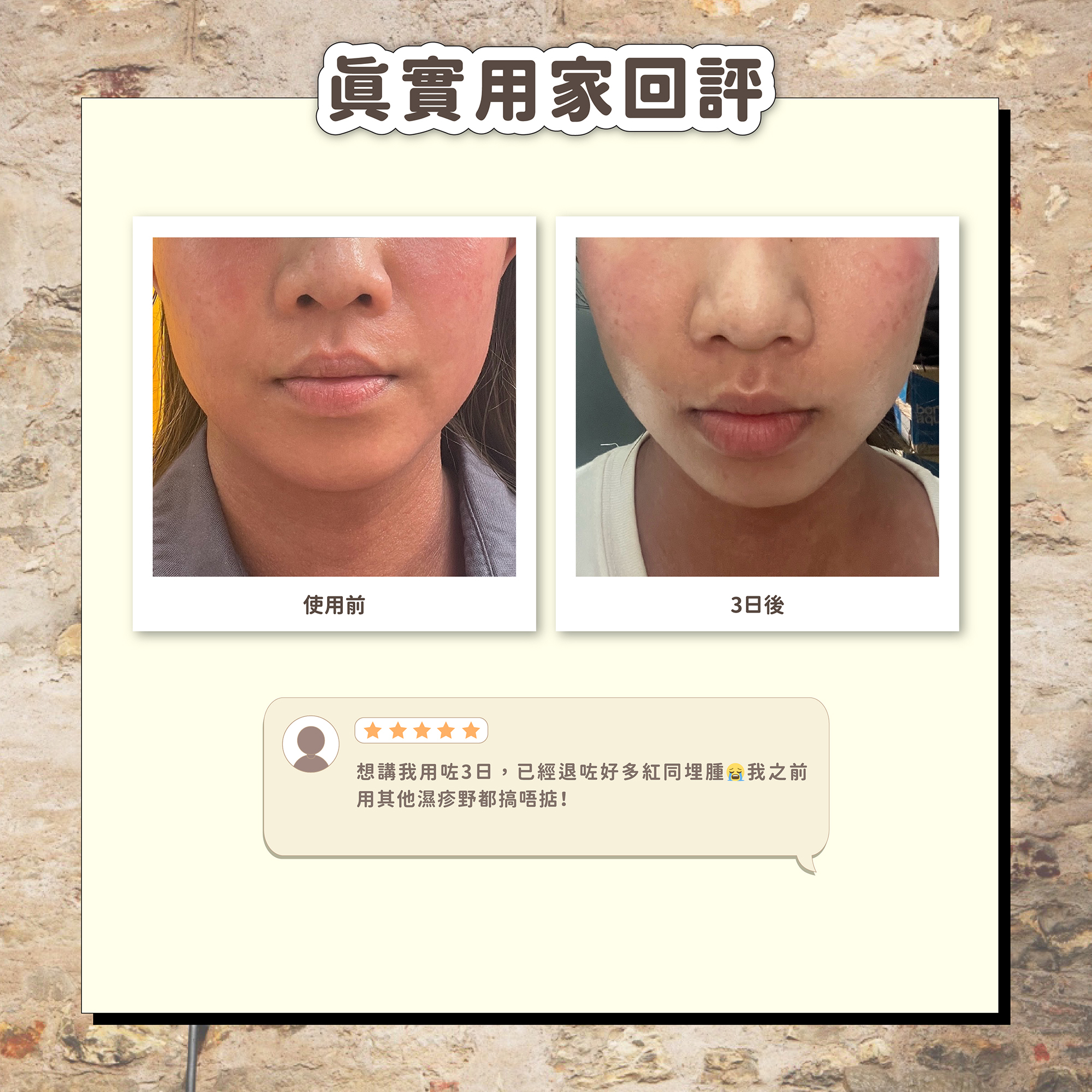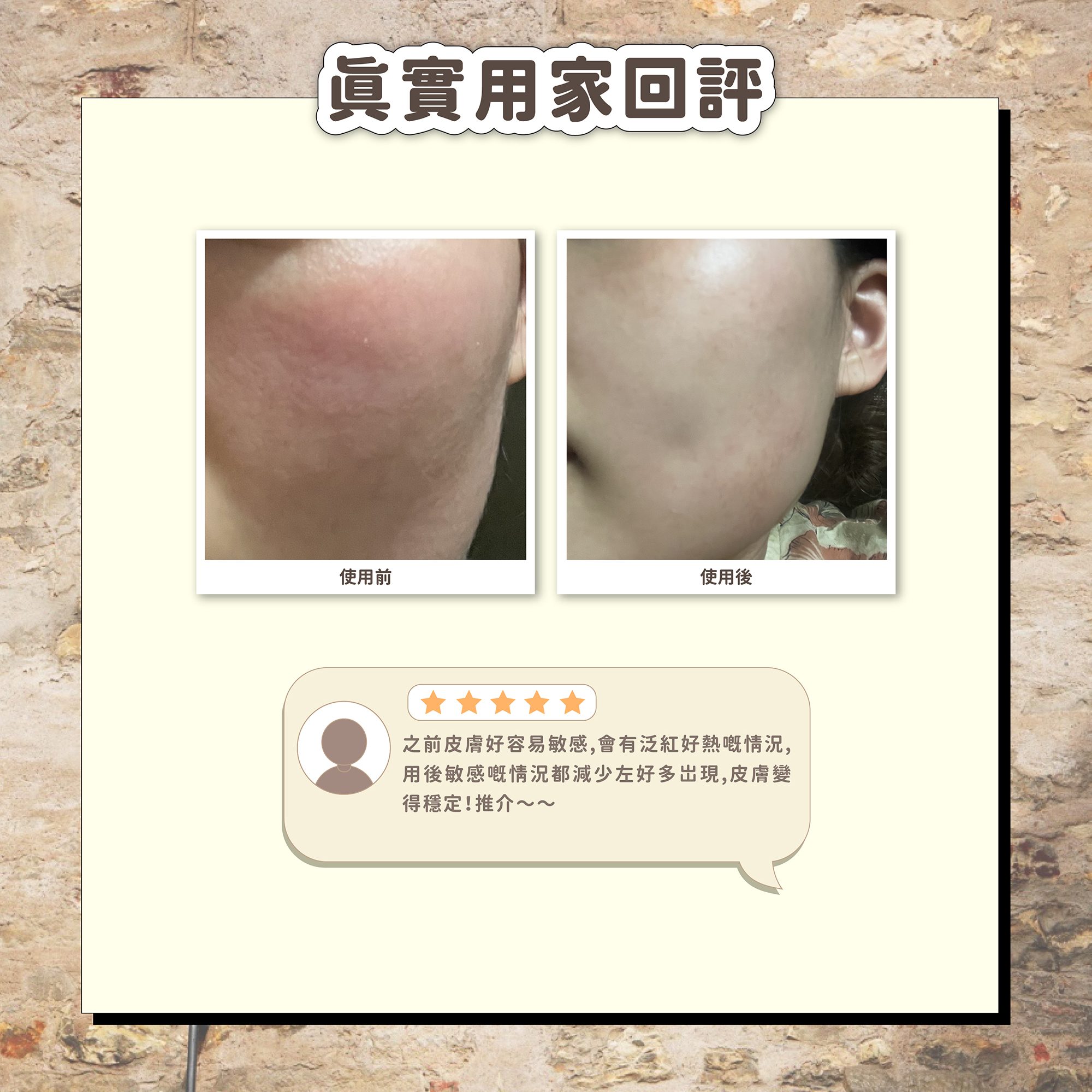*客人請於面部無疹/較少皮疹位置小面積試用並觀察24小時, 確認沒有過敏反應才於全面使用,建議分開幾天試用1-2樣產品,減少對皮膚做成負擔