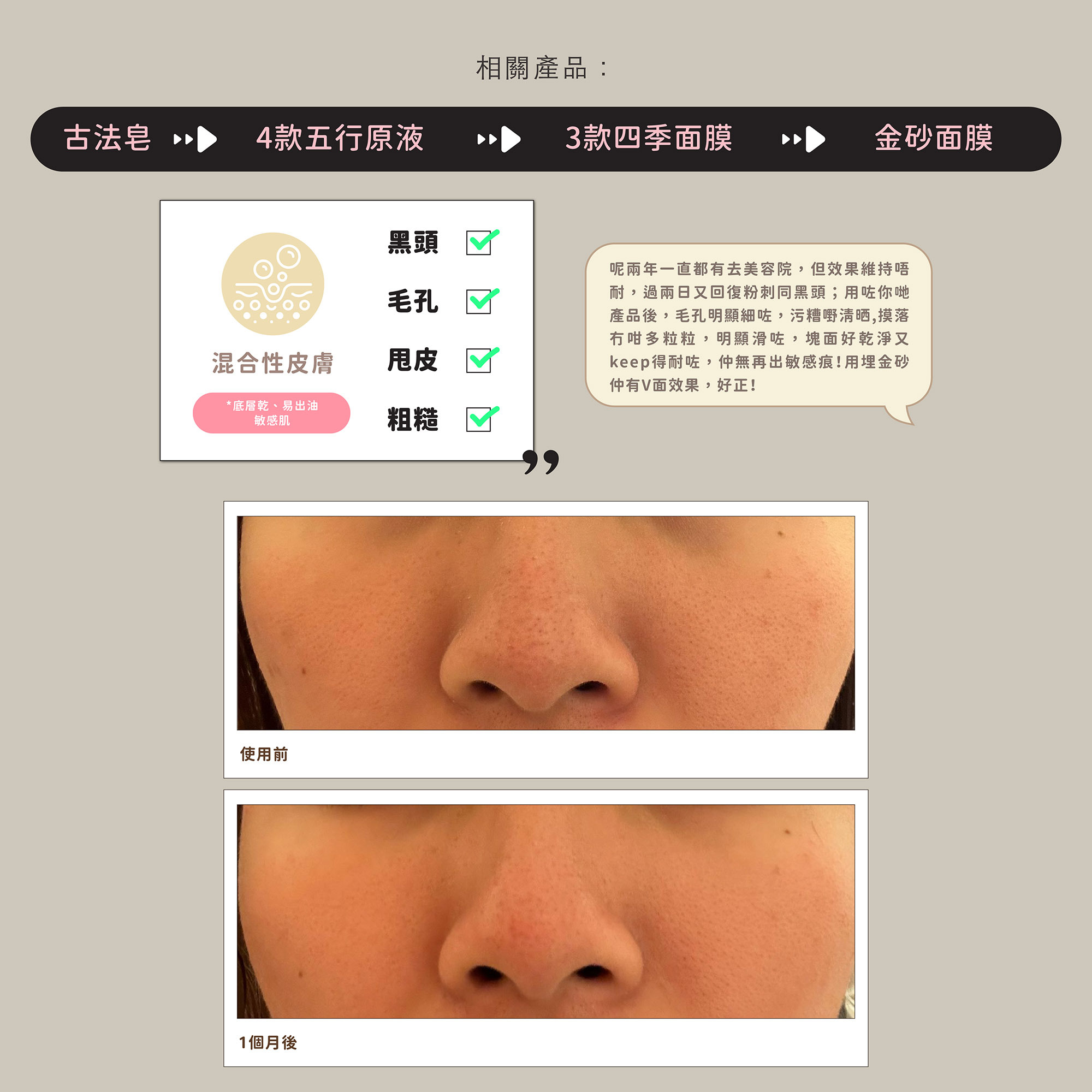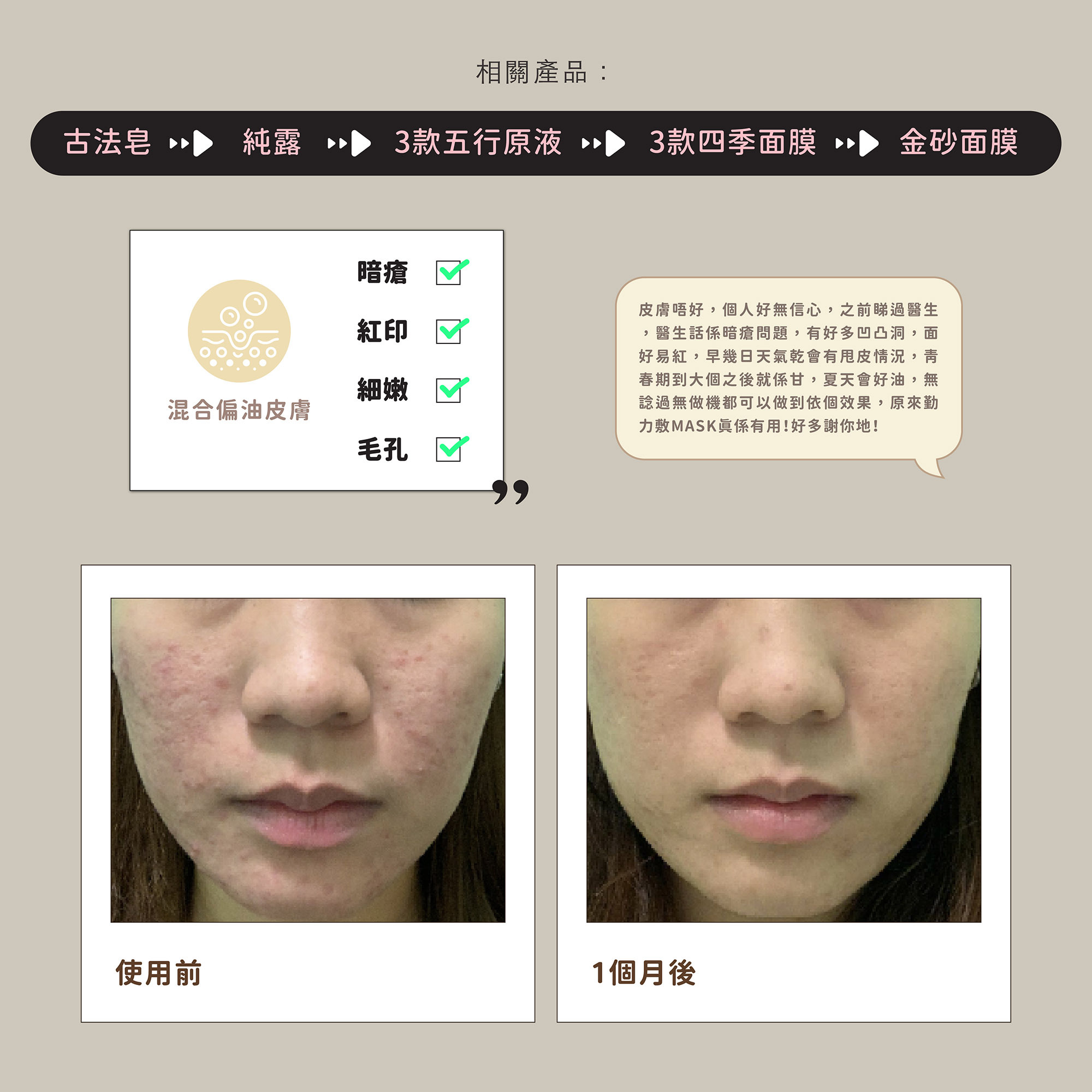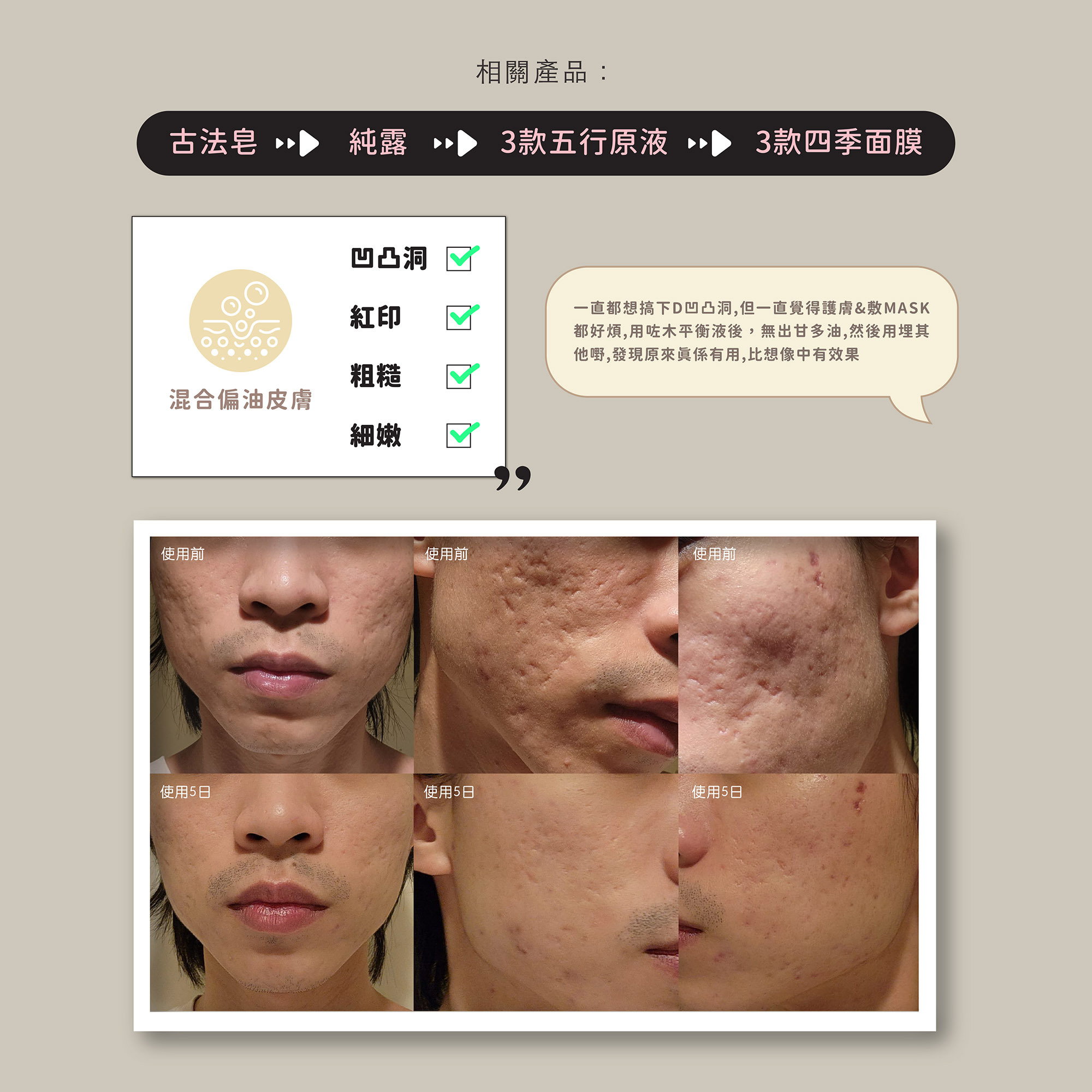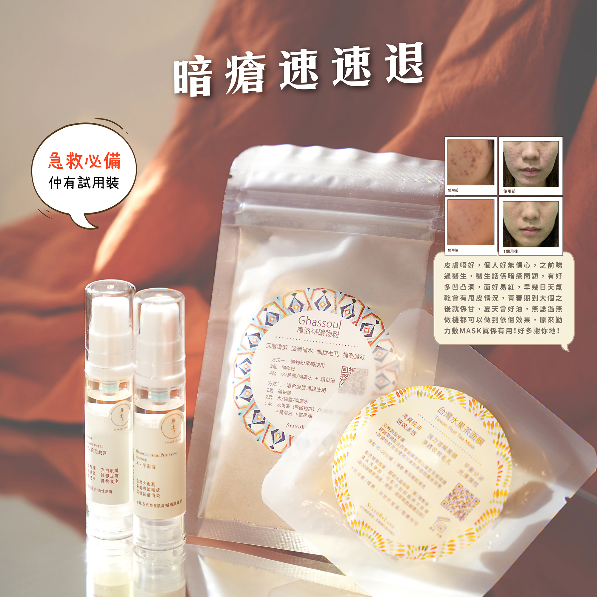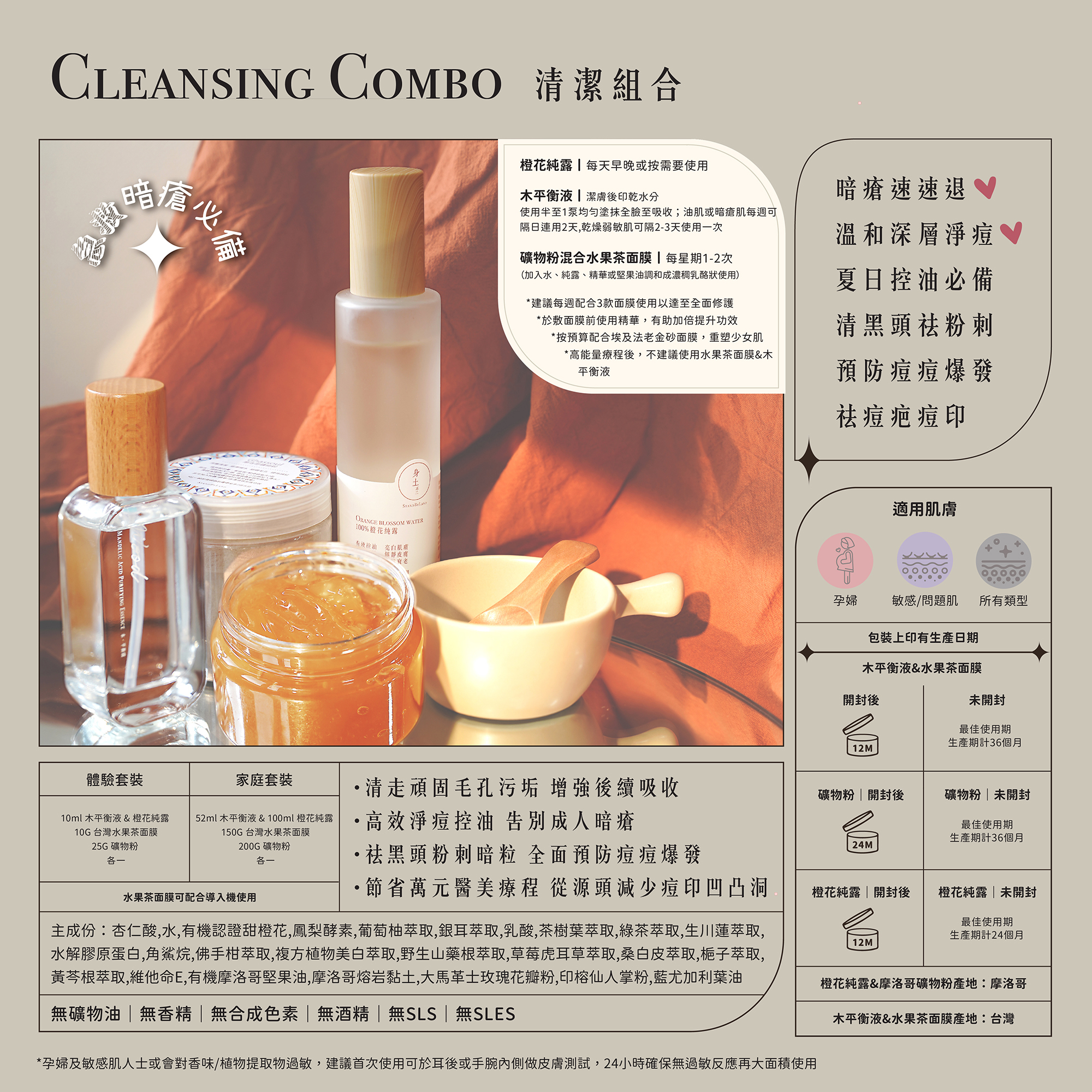 身土的清潔組合以溫和高效的酸性成分溶解頑固污垢和老化角質,配合礦物泥吸走皮膚深層毒素,建立有效直擊暗瘡根源的潔膚系統