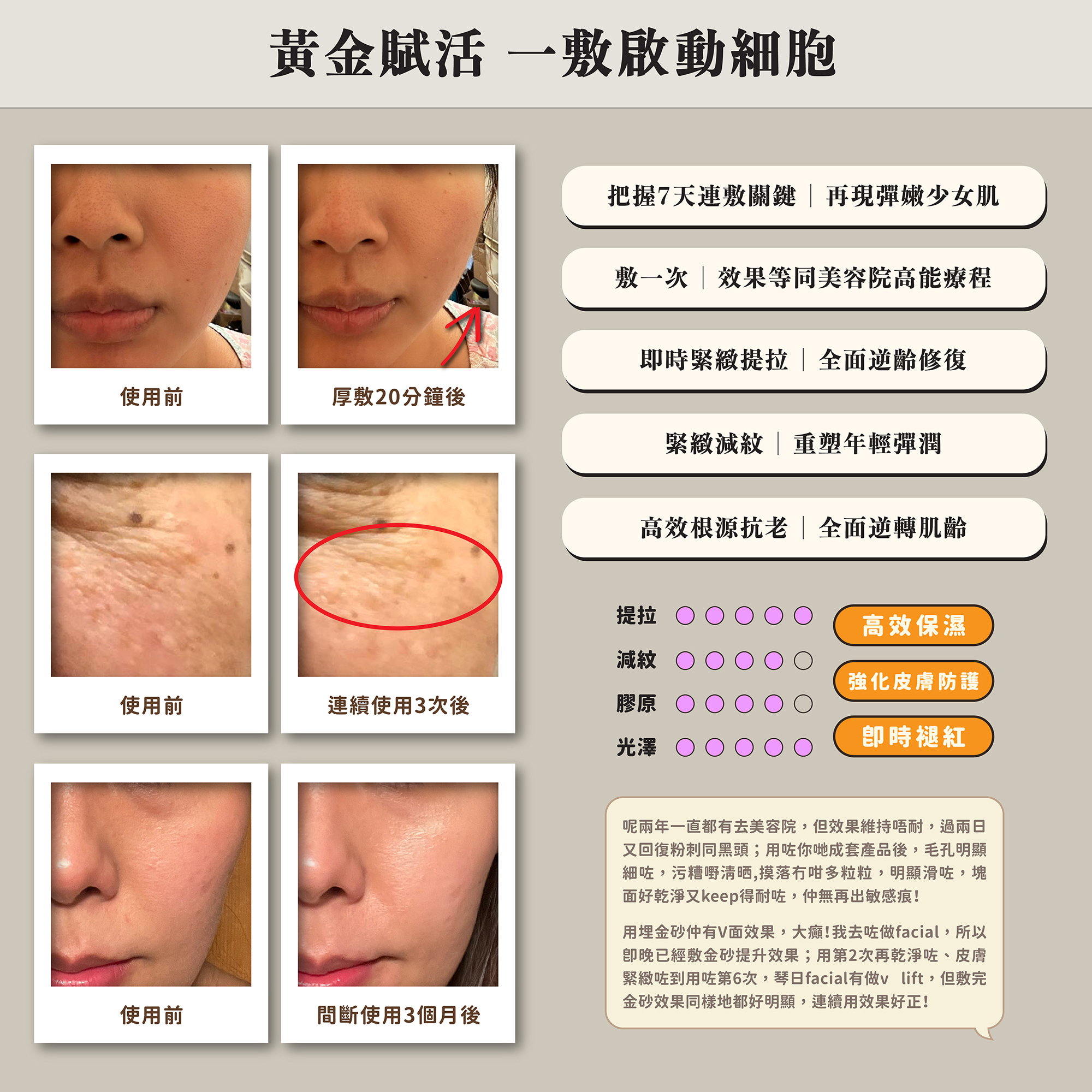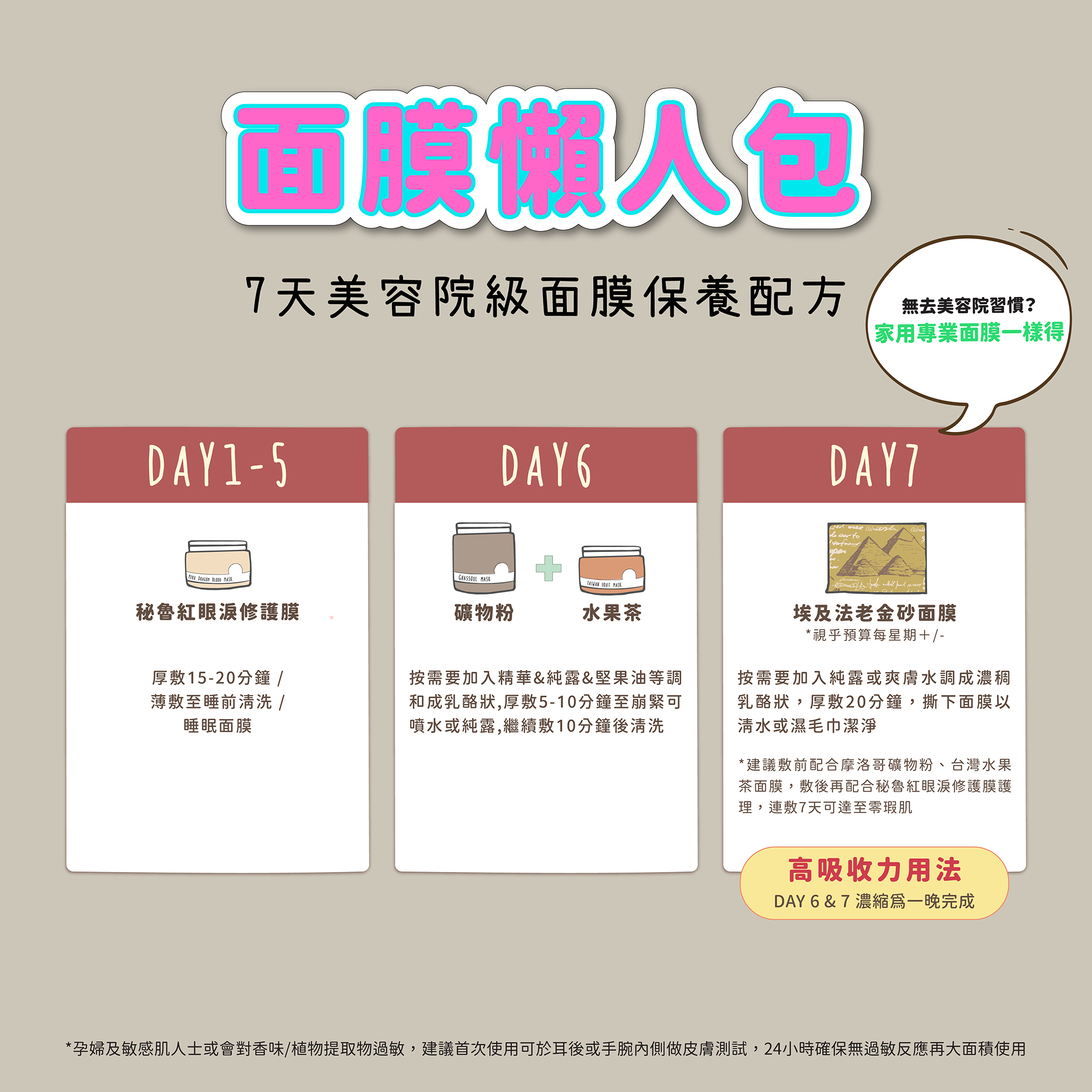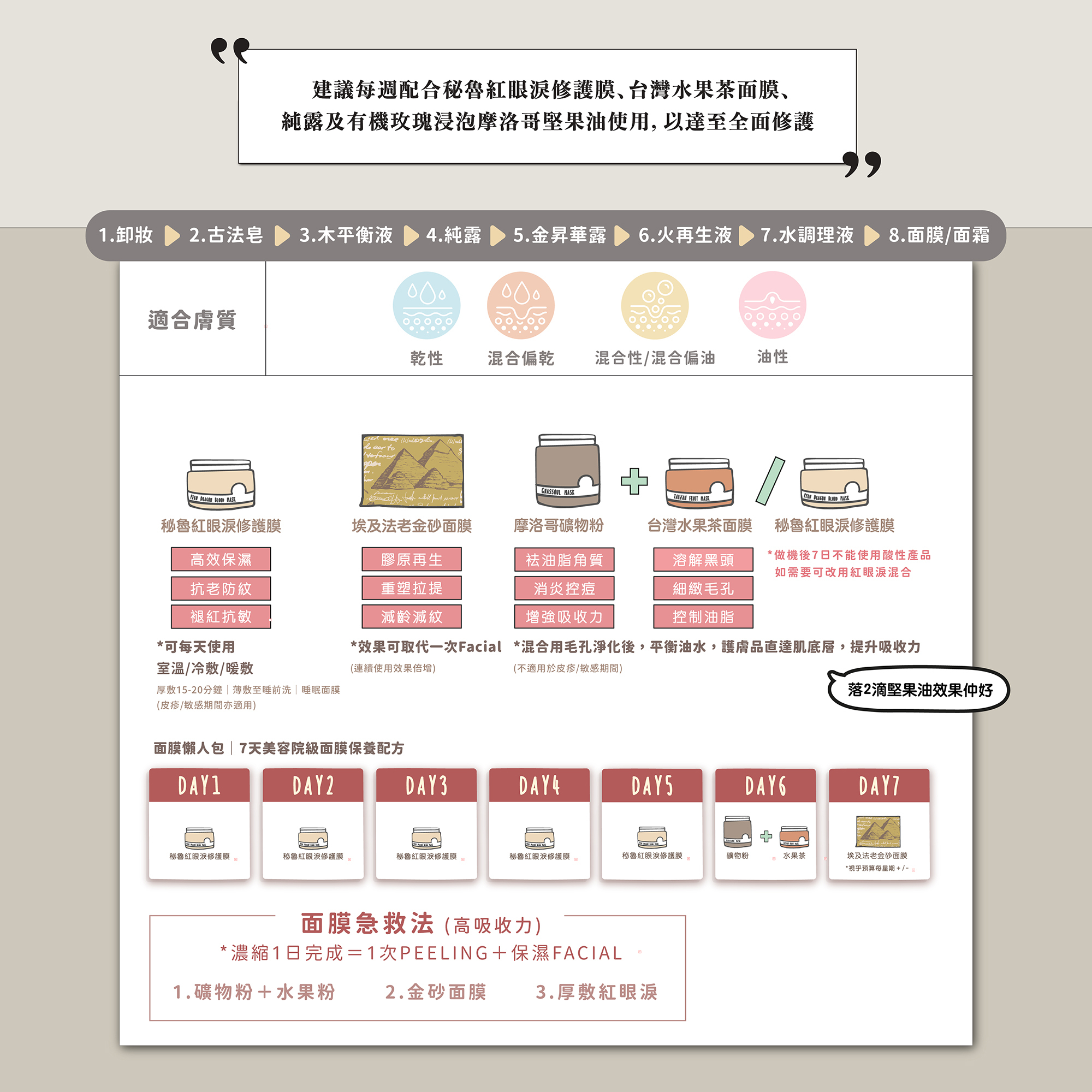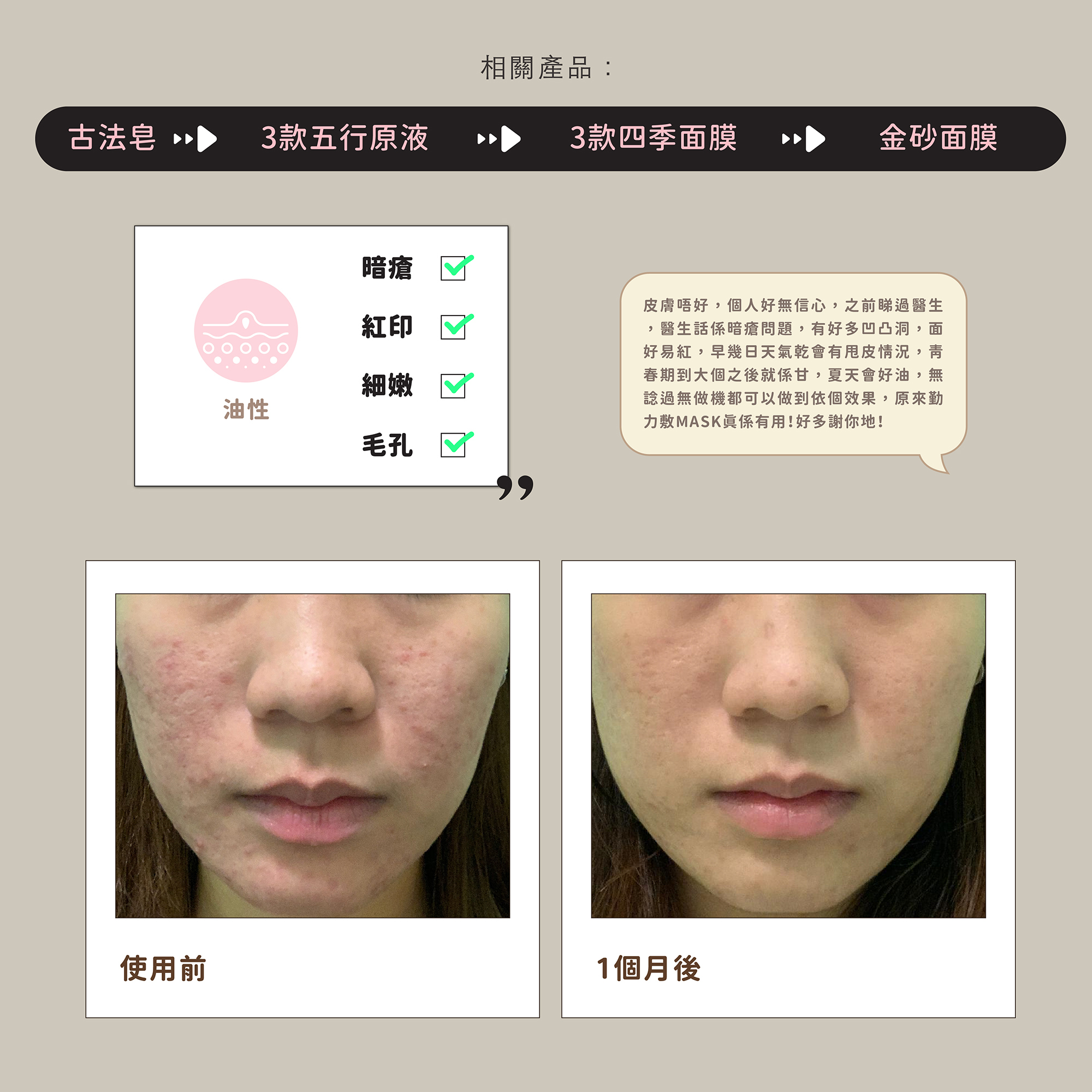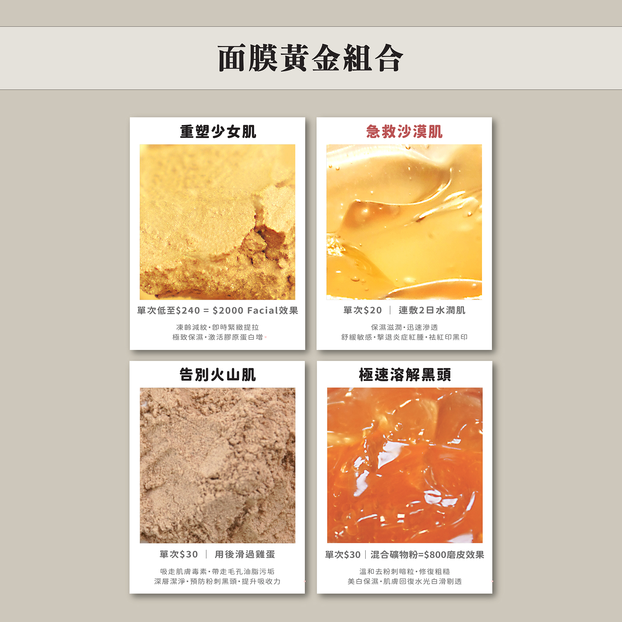 想護膚品用得其所,關鍵在於先潔淨後保養,先清乾淨毛孔內的老廢角質和黑頭粉刺,開啟肌膚吸收力,令護膚精華完整滲入肌底發揮效用。身土的全方位面膜提供潔膚保養2+2組合:第一步,先使用摩洛哥礦物粉+台灣水果茶面膜深層潔淨排毒,溶解黑頭及老廢角質,疏通毛孔吸收後續養分;第二步,以埃及法老金砂面膜注入黃金精華,從肌底激活肌膚再生力,即時緊緻逆齡;最後一步,敷上秘魯紅眼淚修護膜極致保濕修復,強化肌膚屏障鎖緊水分及養分