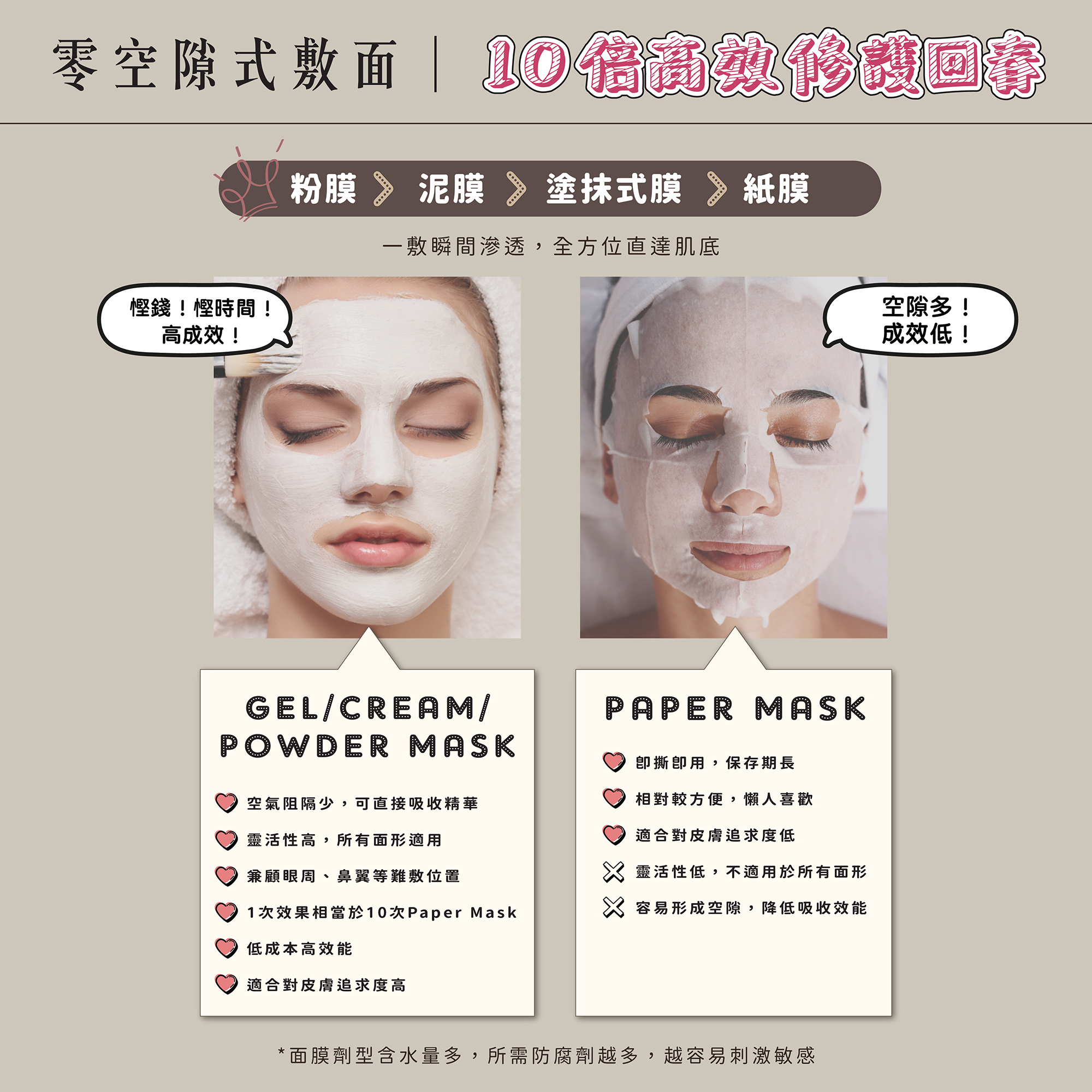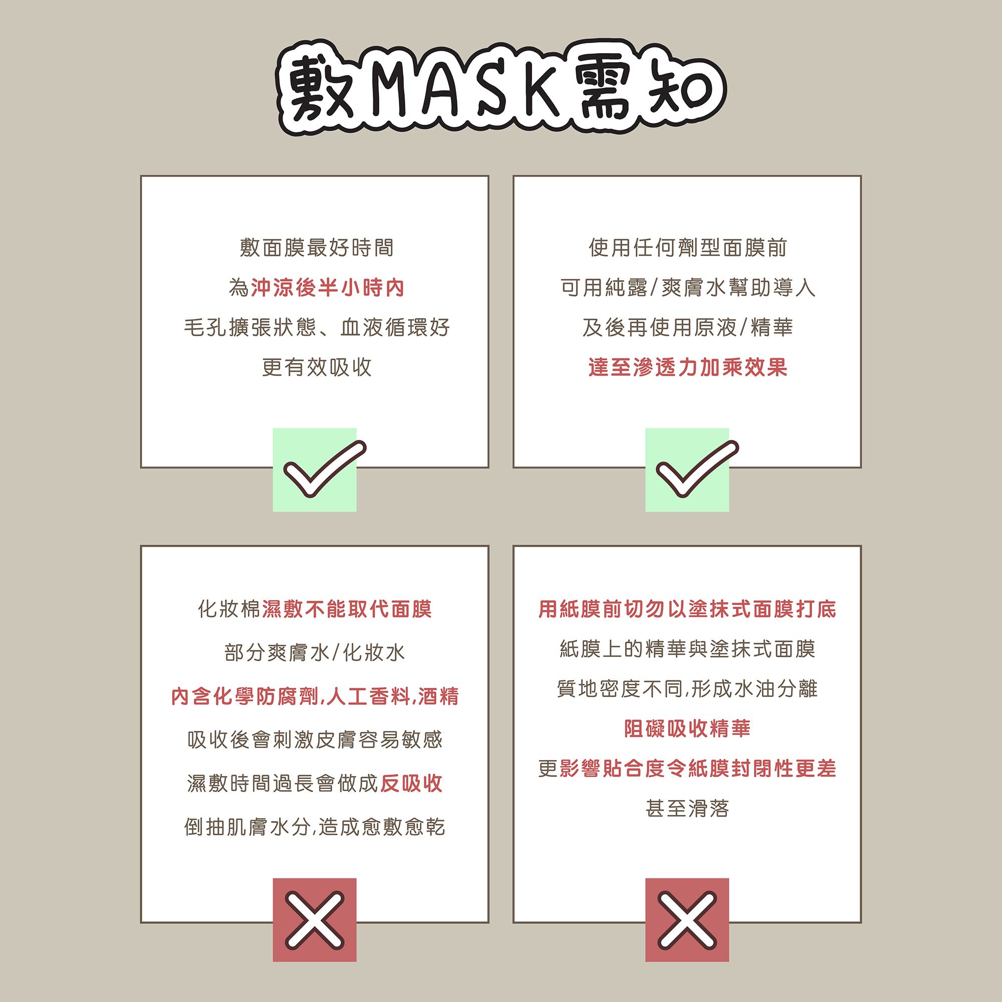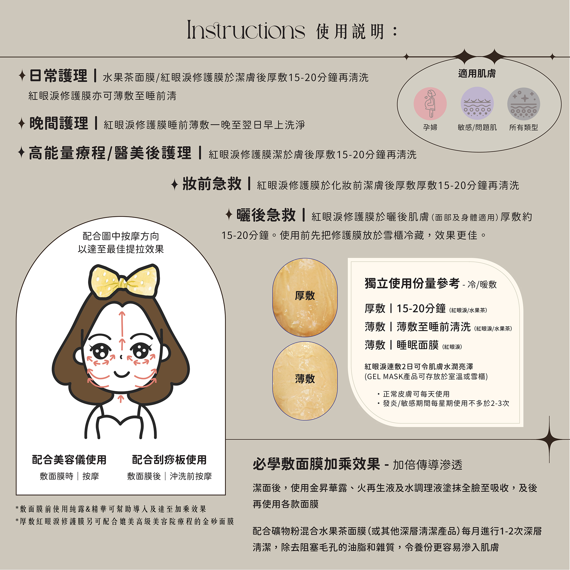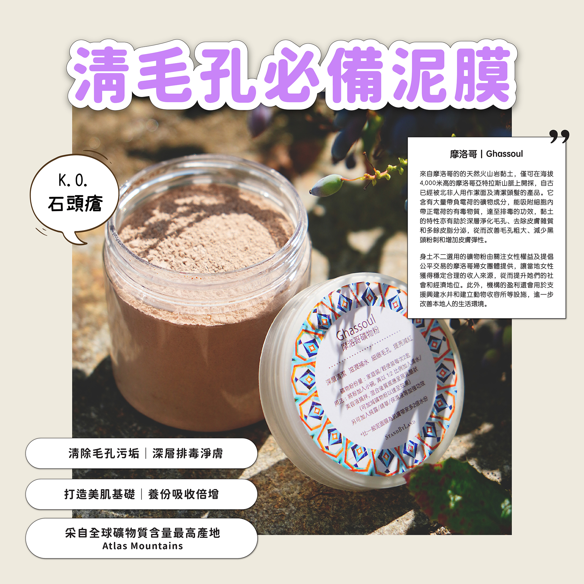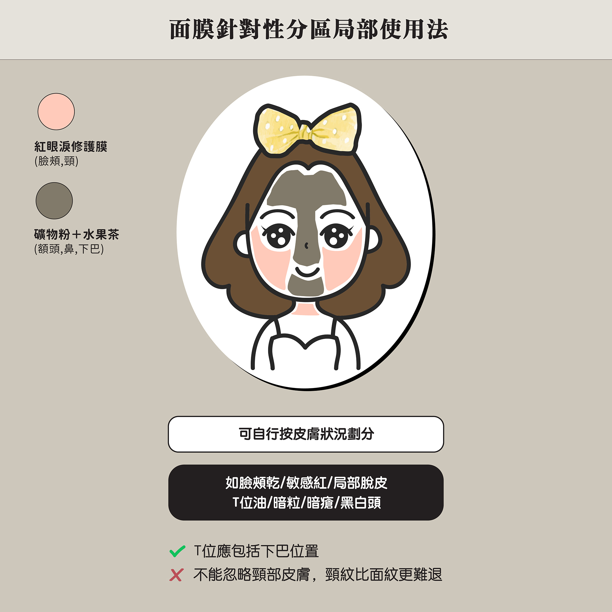 想護膚品用得其所,關鍵在於先潔淨後保養,先清乾淨毛孔內的老廢角質和黑頭粉刺,開啟肌膚吸收力,令護膚精華完整滲入肌底發揮效用。身土的全方位面膜提供潔膚保養2+2組合:第一步,先使用摩洛哥礦物粉+台灣水果茶面膜深層潔淨排毒,溶解黑頭及老廢角質,疏通毛孔吸收後續養分;第二步,以埃及法老金砂面膜注入黃金精華,從肌底激活肌膚再生力,即時緊緻逆齡;最後一步,敷上秘魯紅眼淚修護膜極致保濕修復,強化肌膚屏障鎖緊水分及養分
