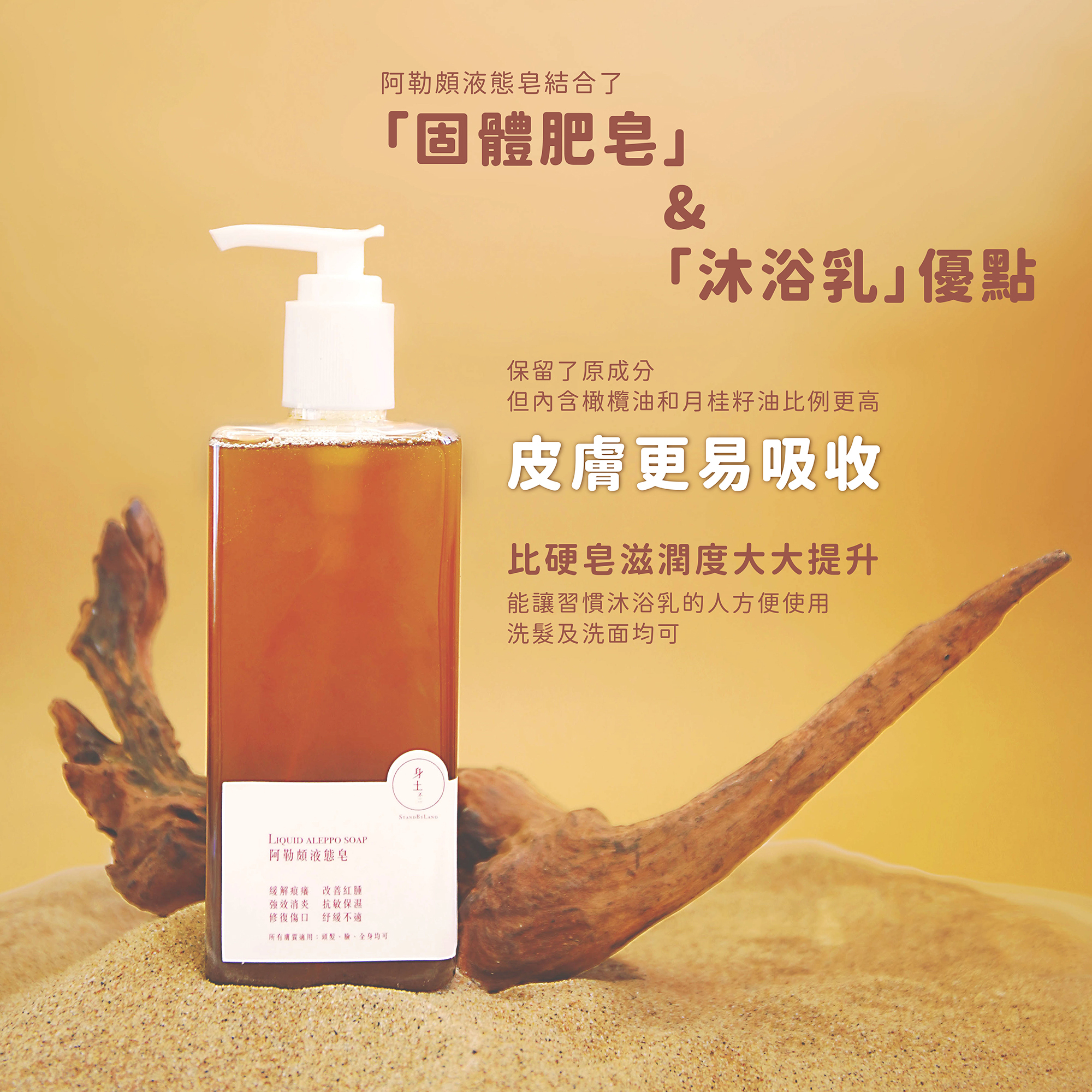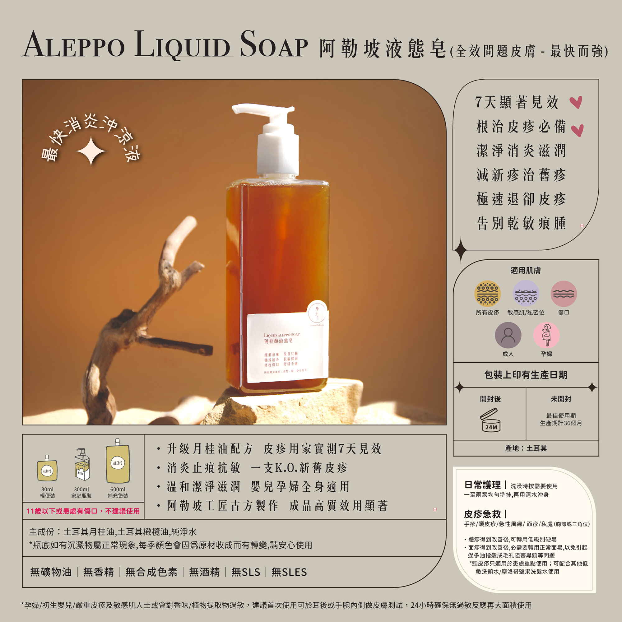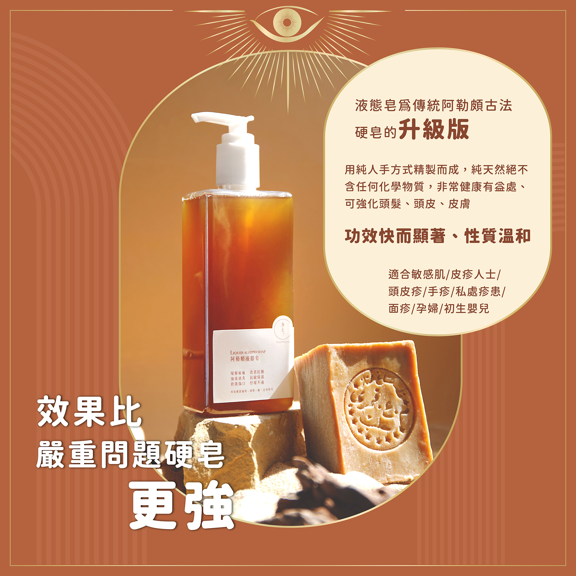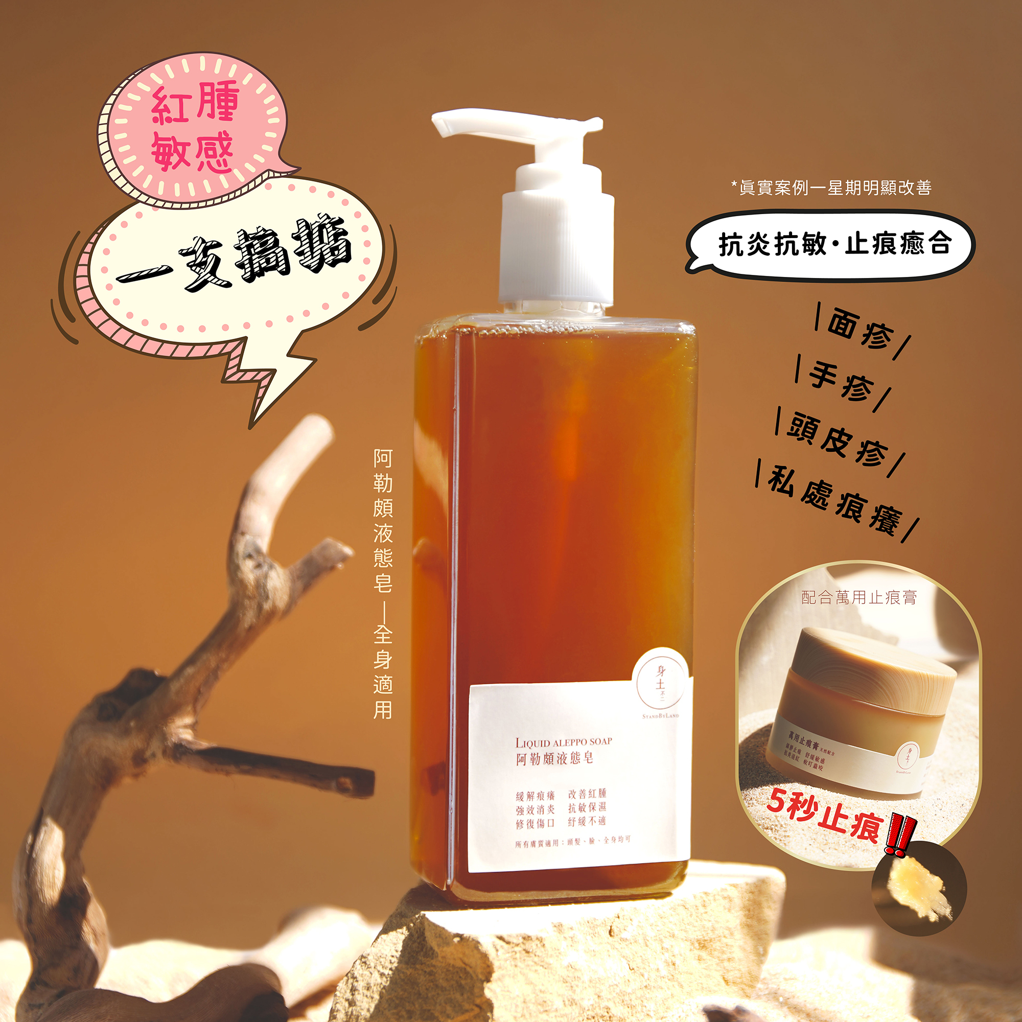 皮疹皂當中,從阿勒坡古法硬皂升級研發的液態皂功效最快最強,升級高濃度月桂油配方經嚴重皮疹的闆娘及其他皮疹用家人體實測,1至2星期即可顯著退卻紅腫敏感,身土的所有阿勒坡皂均由逃離戰火的阿勒坡皂工匠,於風土氣溫近似敘利亞的土耳其製作,只含橄欖油、月桂油和鹼液,配方溫和,面部、身體、頭皮和私處等全身適用