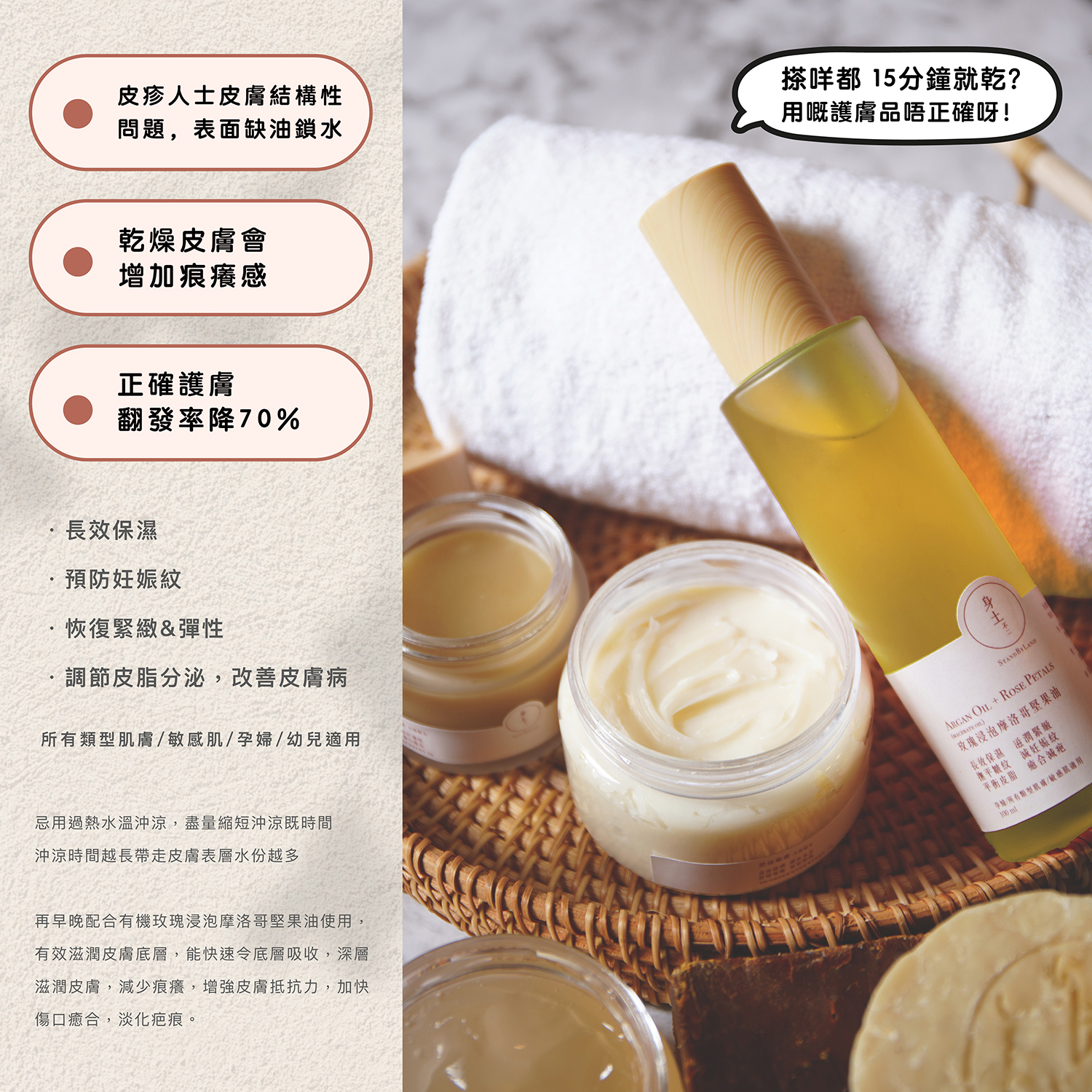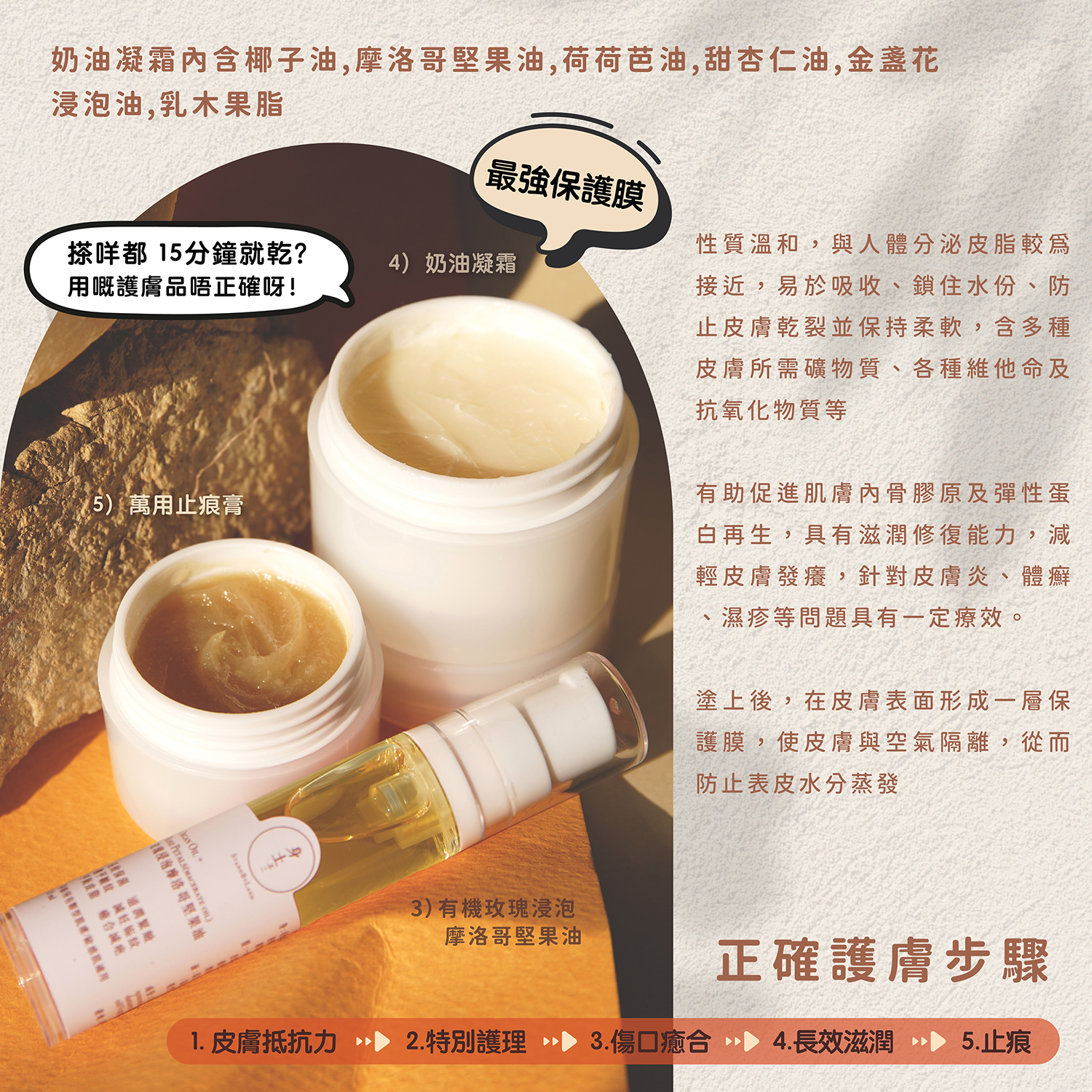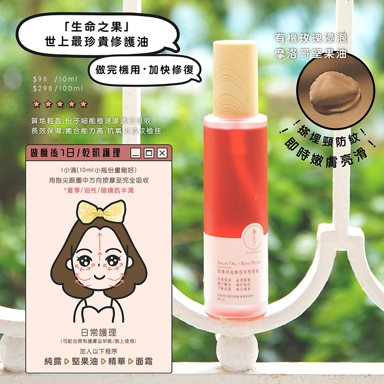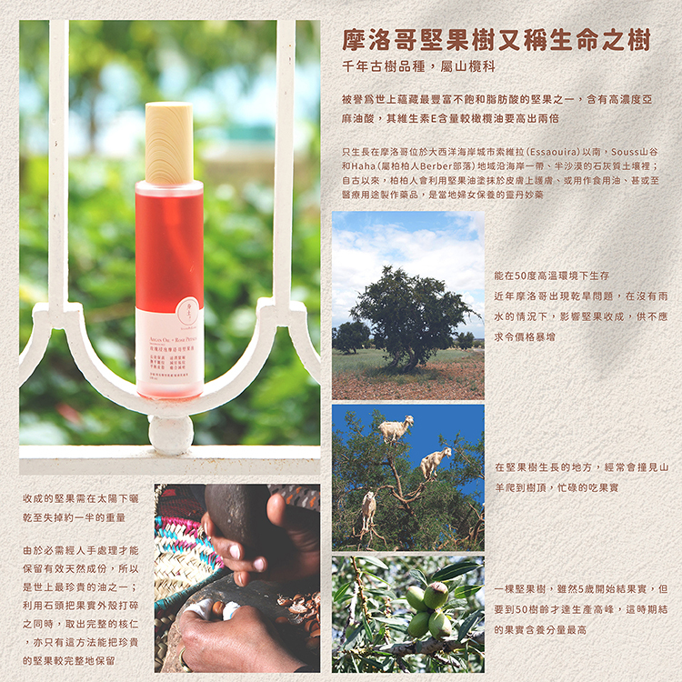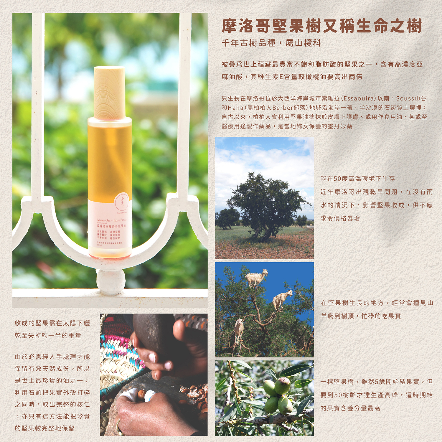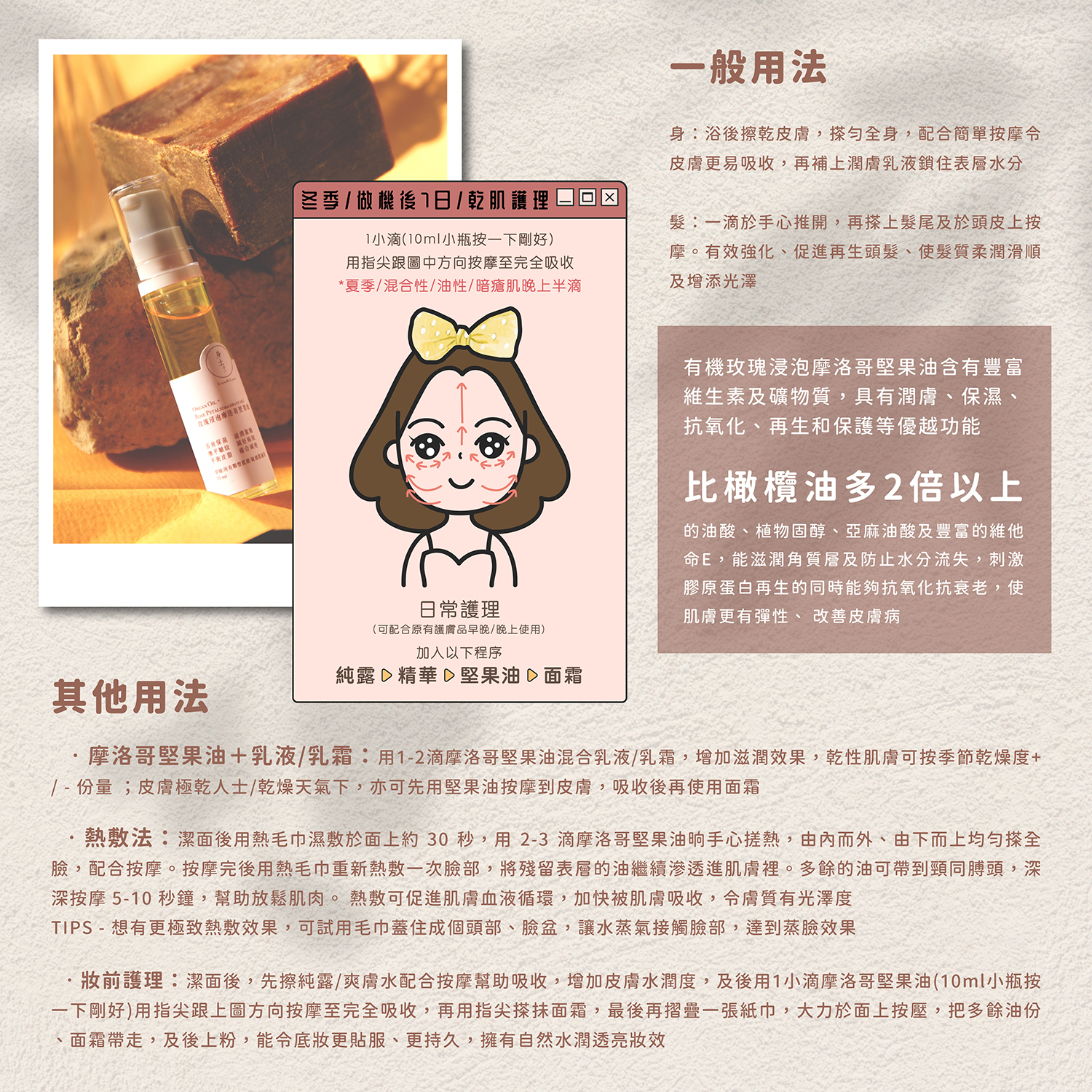 摩洛哥堅果油蘊含豐富的脂肪酸、維生素 A和E、Omega-6和亞麻油酸等抗氧化成分,潤而不油的輕盈油質易於被皮膚吸收,不會堵塞毛孔引起粉刺,它的滋潤成分有助維持乾燥肌的水分屏障,同時平衡油性肌的皮脂分泌,提升肌膚防禦力,舒緩敏感泛紅和炎症,對抗致老的自由基損傷,改善肌膚彈性、淡化疤痕紅印、撫平細紋和預防妊娠紋