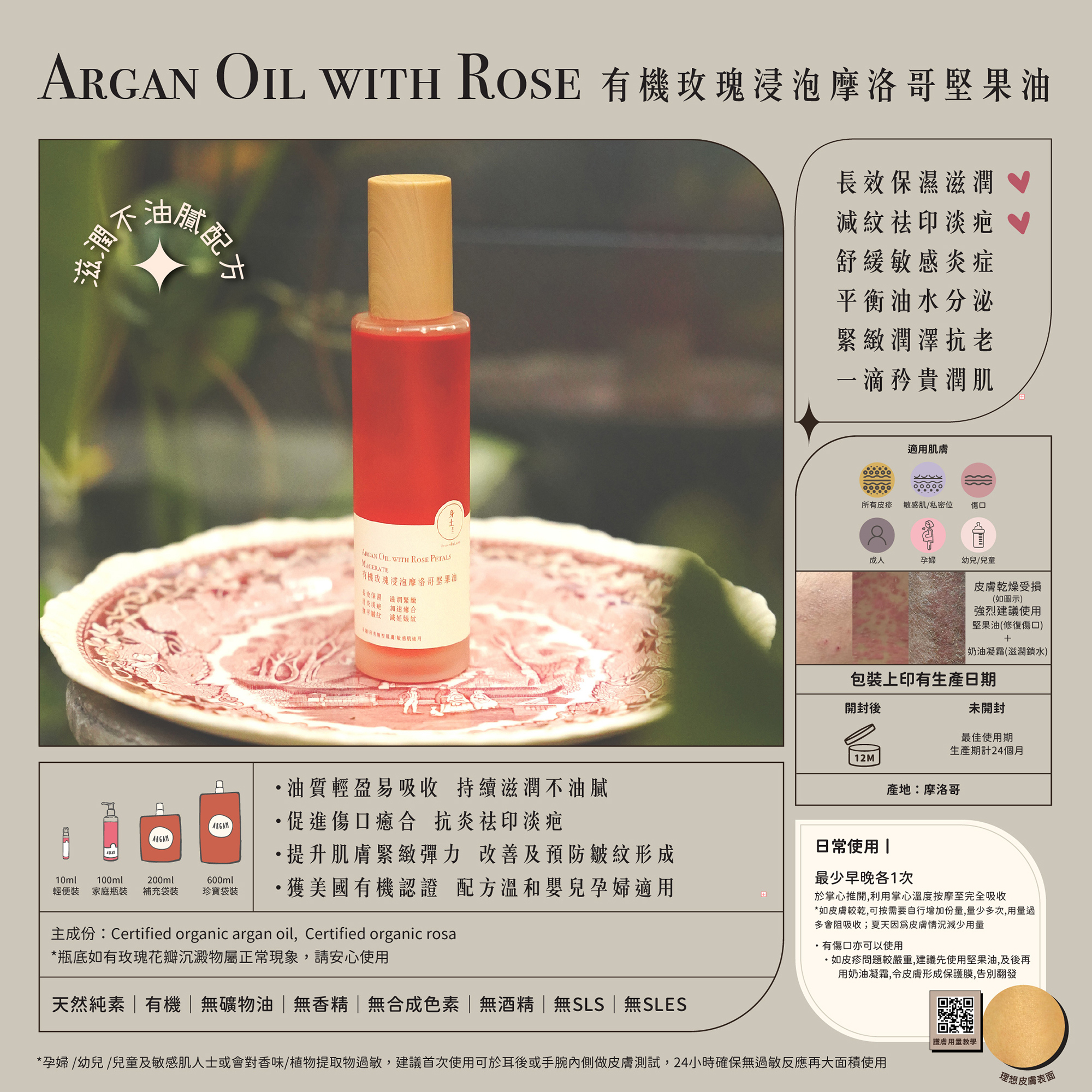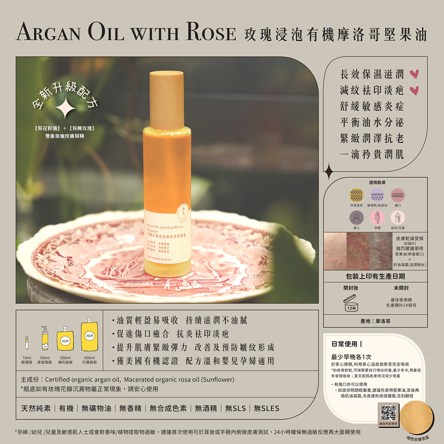 本產品獲USDA ORGANIC有機認證,不含人工色素或香料,淡淡的天然花香和瑰紅色澤源自向日葵籽油浸泡的有機玫瑰花瓣,成分溫和,嬰幼兒和孕婦均可使用,同時適用於臉部、身體和頭髮護理,建議與面霜、粉膜或潤膚露等護膚品混合使用以達至最佳效果