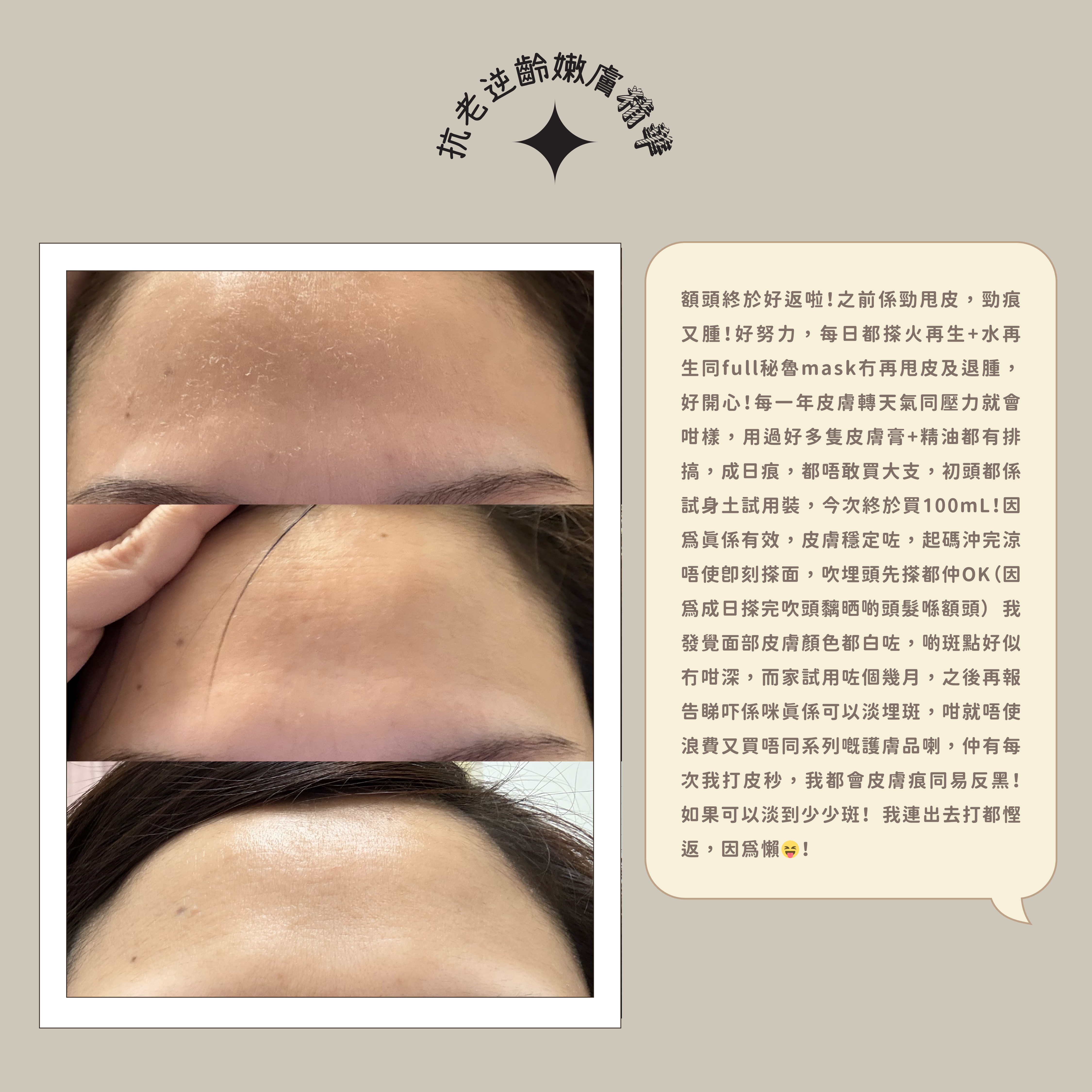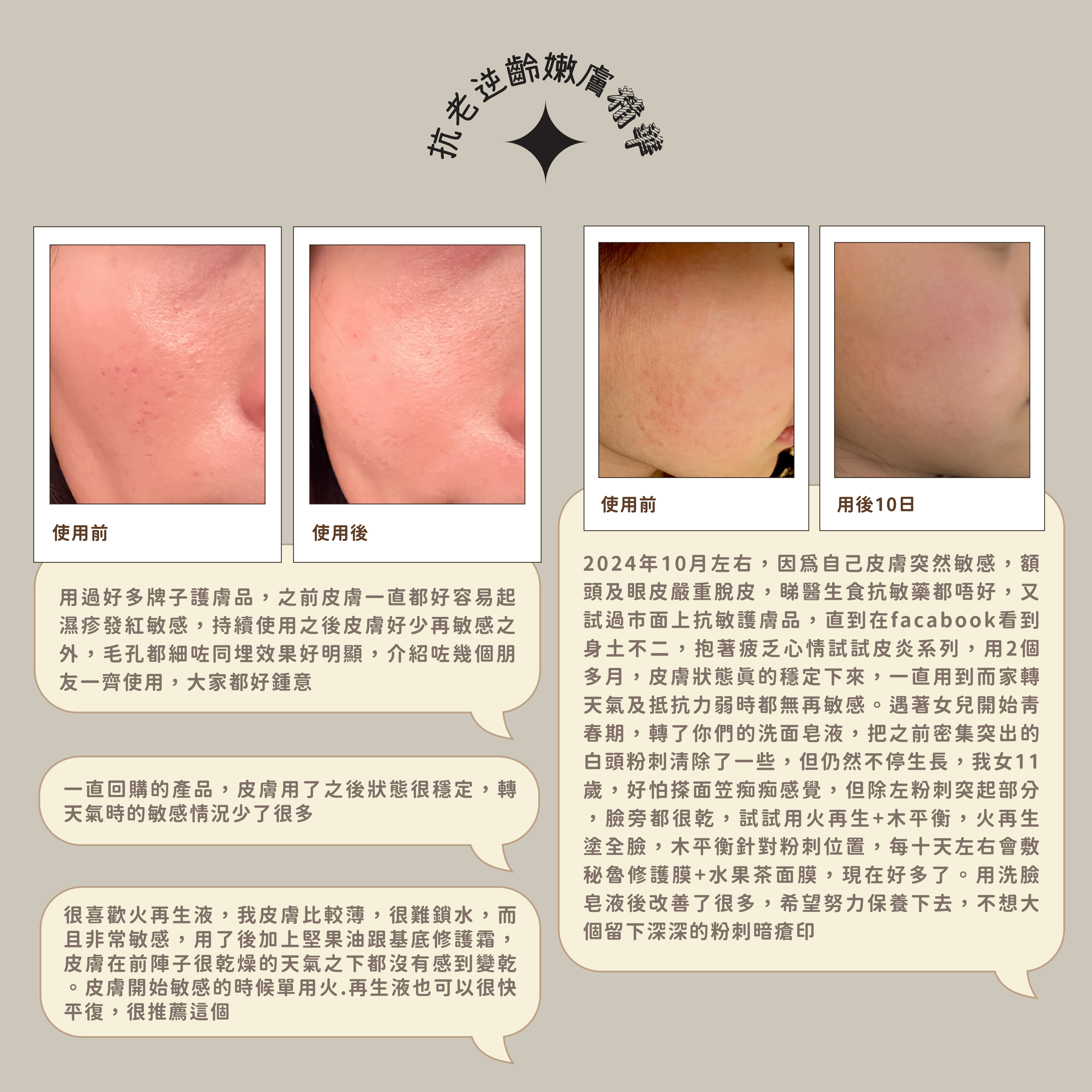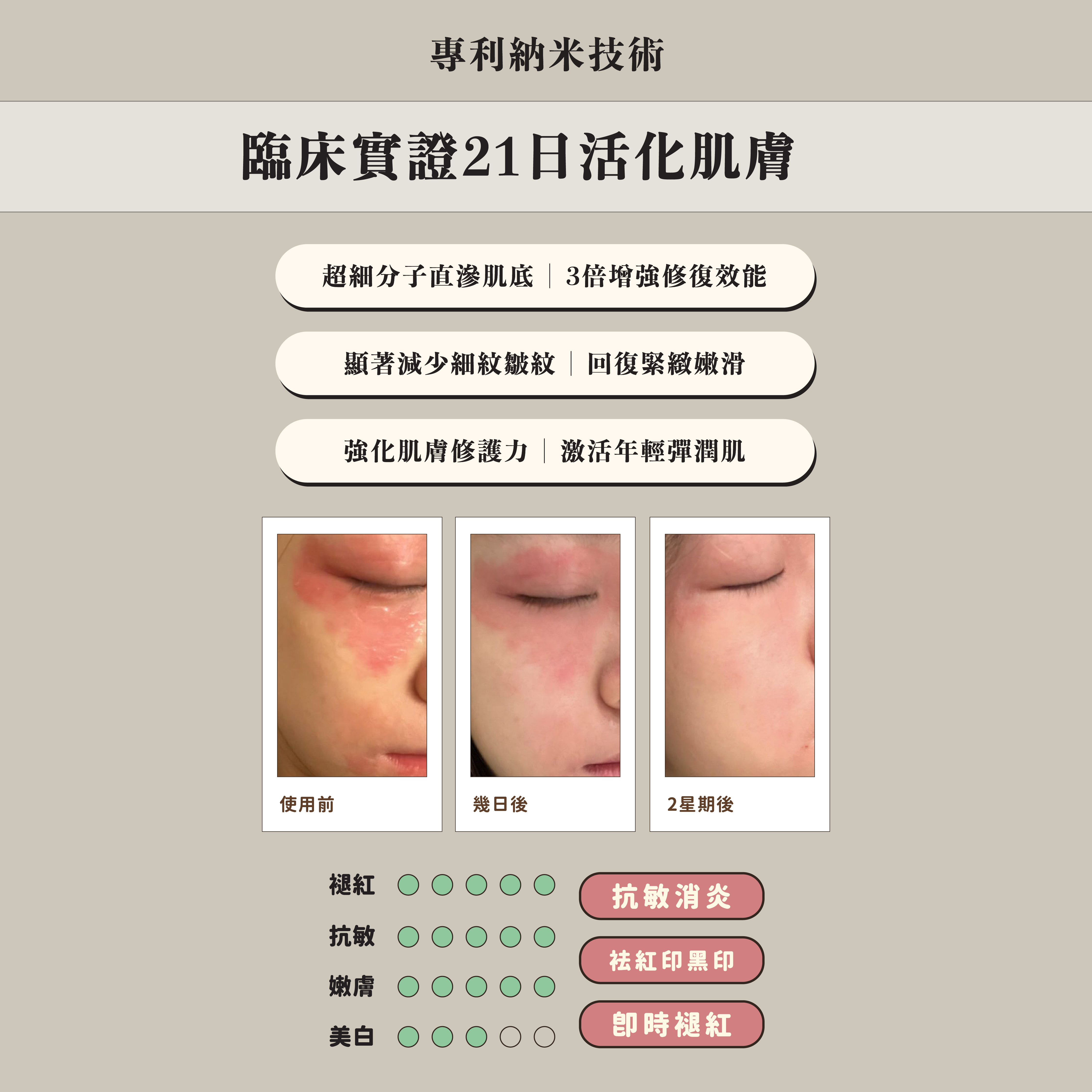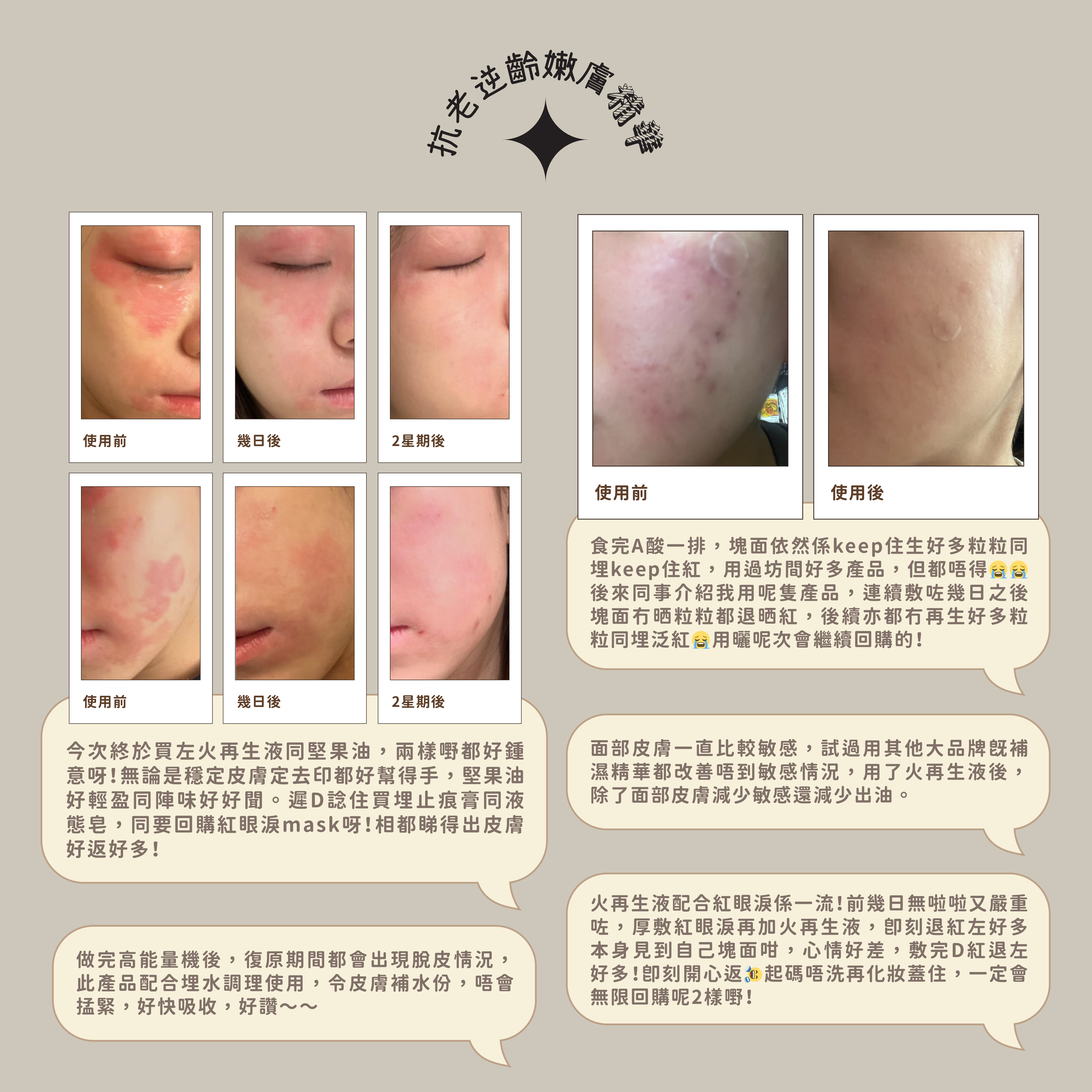 新一代火再生液蘊含秘魯龍血樹脂萃取、深海海藻萃取、玫瑰純露3種超級護膚成分,配合升級納米化專利技術,每滴精華濃縮3倍滲透力、修復力、抗紋力,深入修復肌膚屏障,發揮抗老活膚的功效,經臨床測試證實持續使用21天,有效改善皺紋、鬆弛、色斑、黑印、缺水、毛孔粗大和泛紅等七大肌膚問題,讓肌膚回復緊緻彈潤。