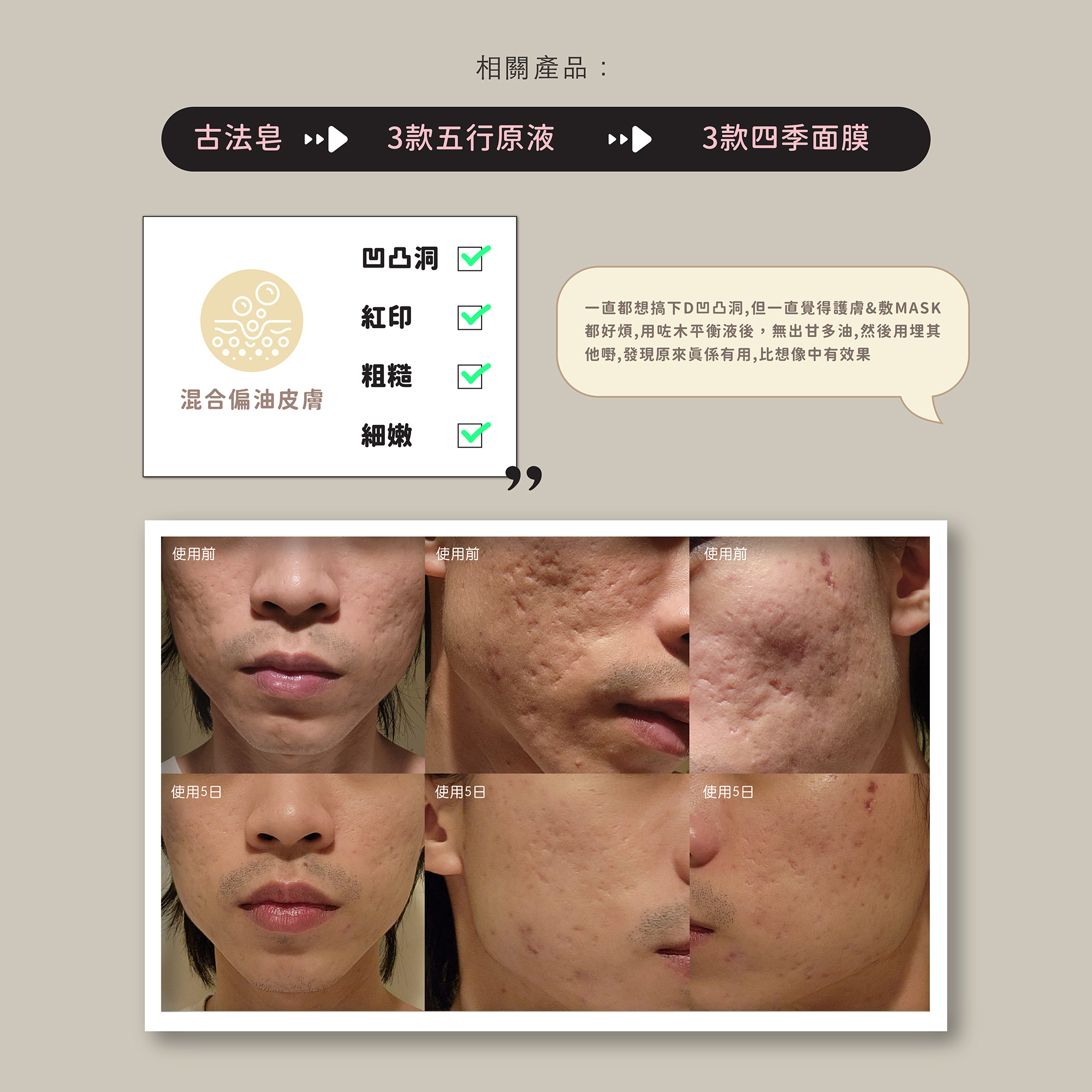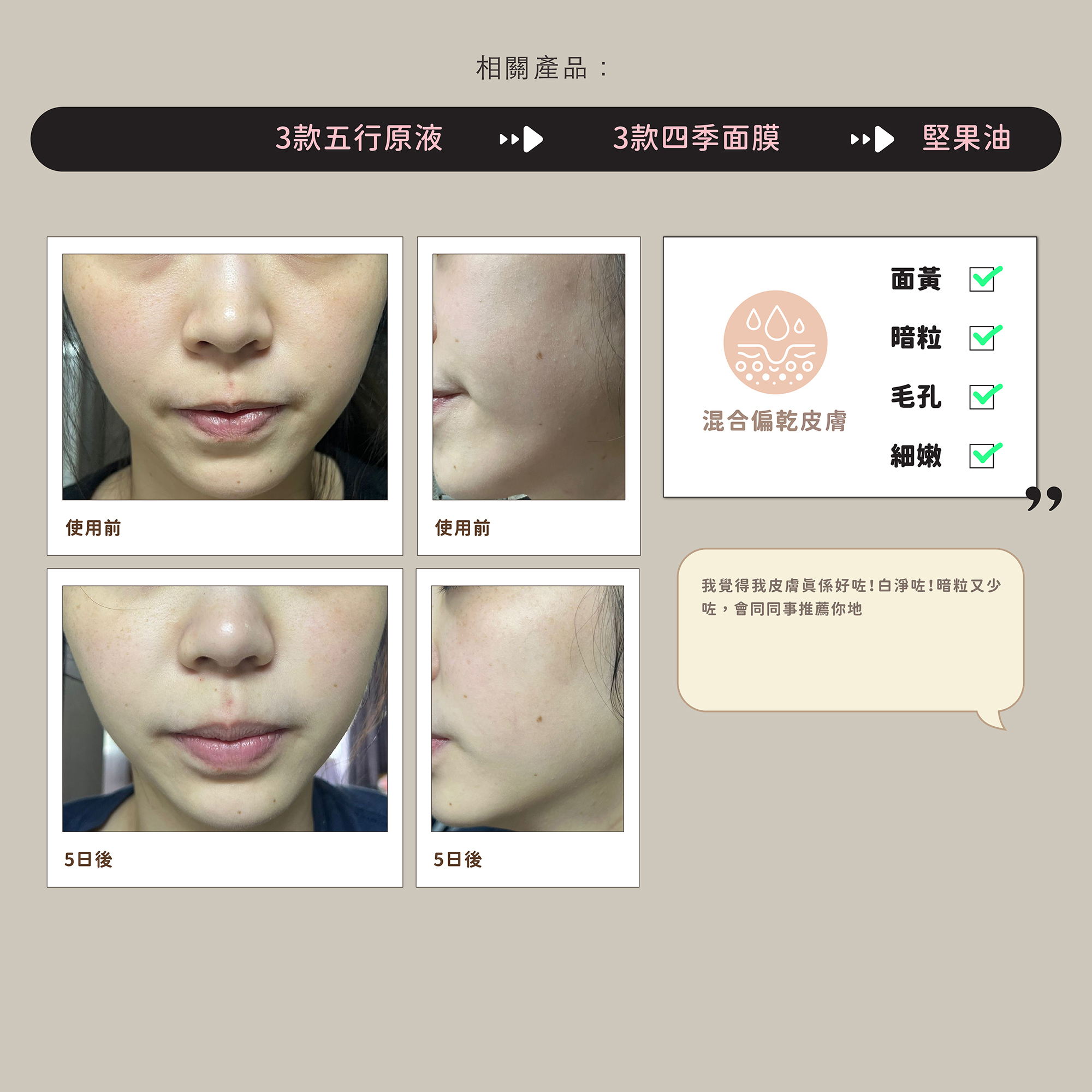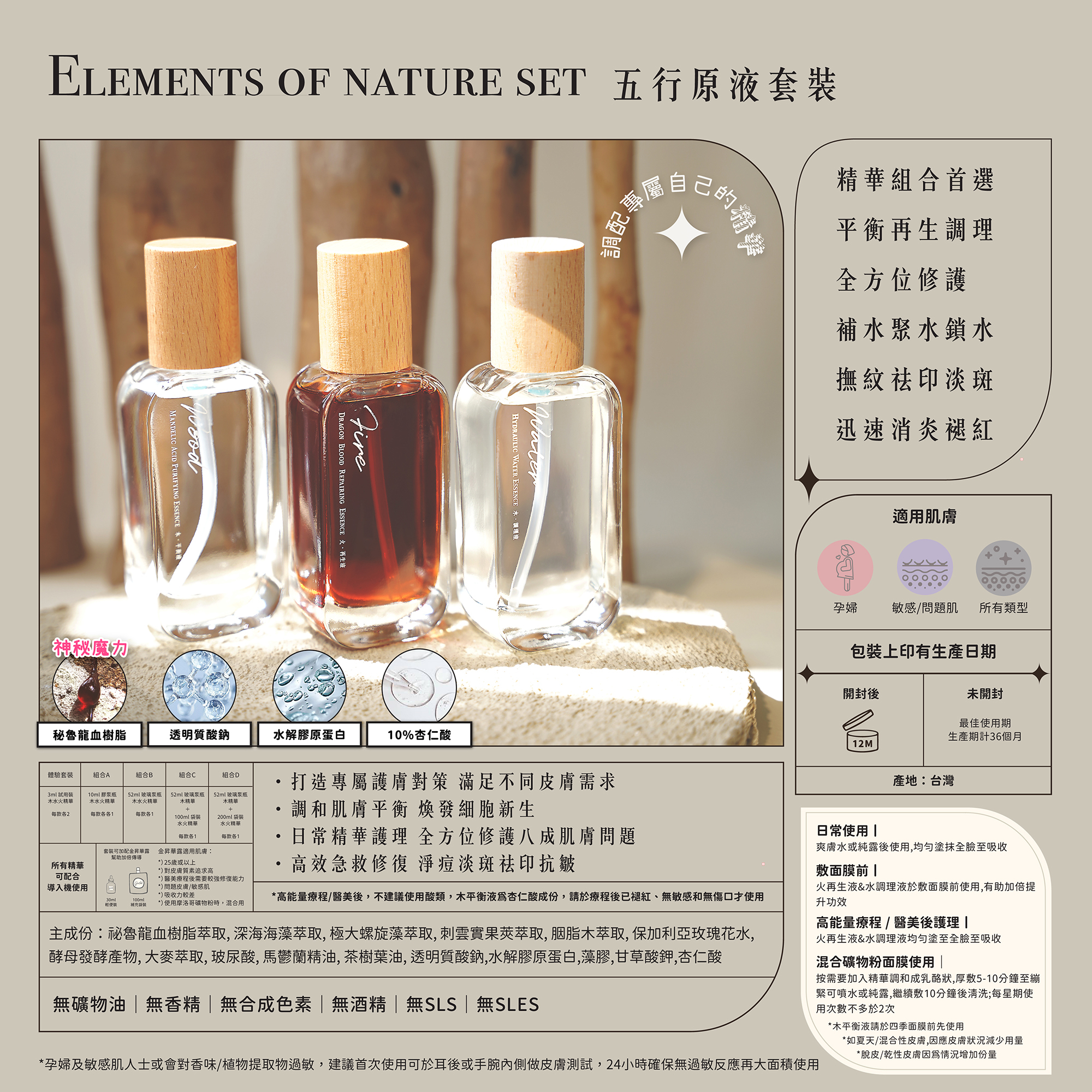 五行原液套裝以大地元素為護養概念,專注於平衡、再生和調理三大核心功效,讓你的肌膚從內而外煥發新生: