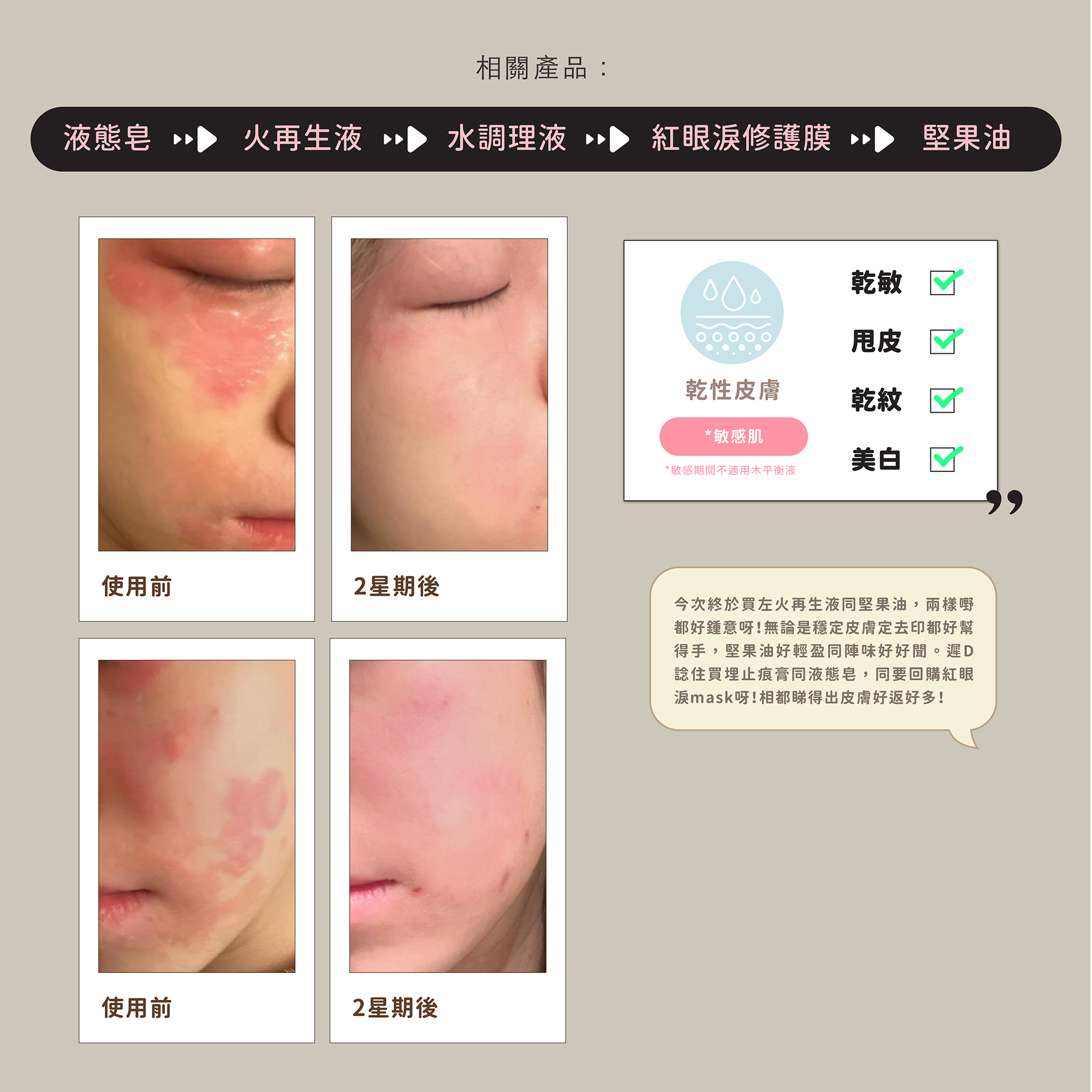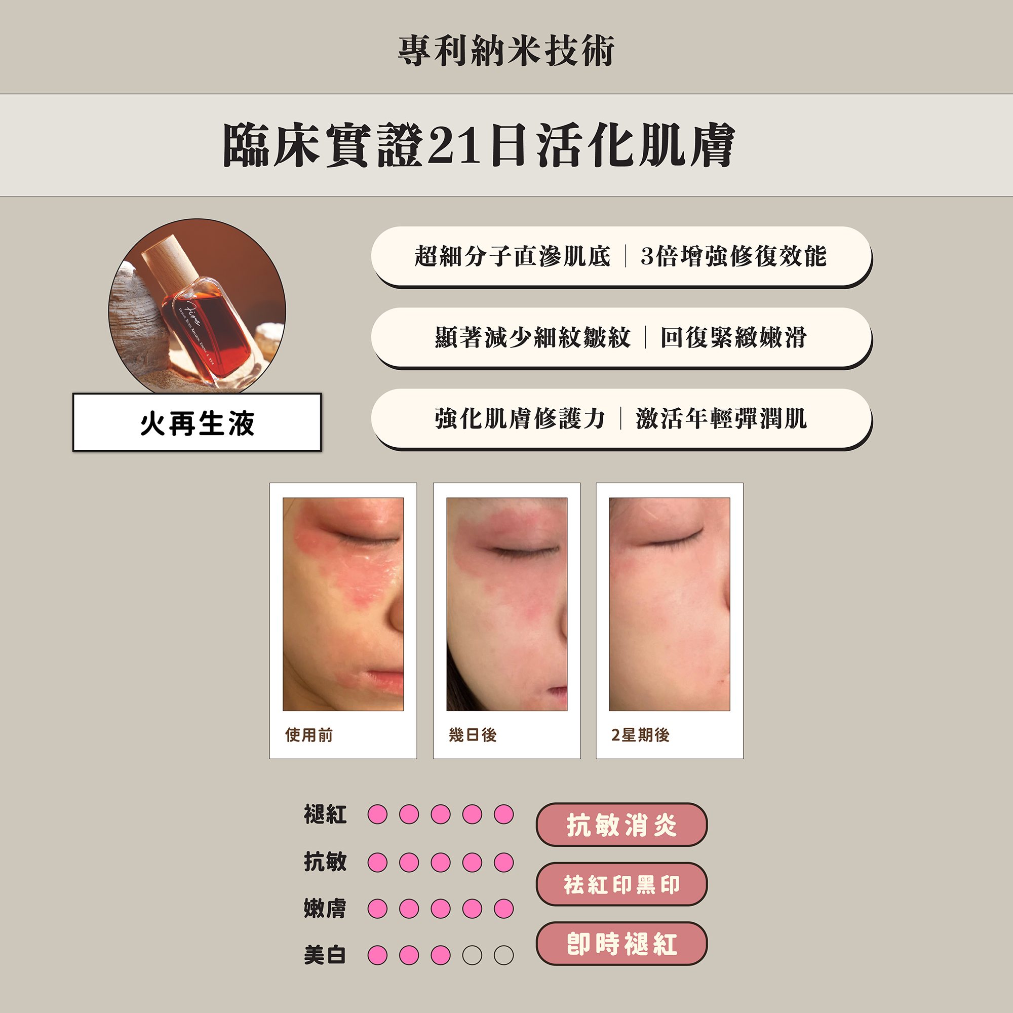 火.再生液|每滴精華濃縮3倍滲透力,深入修復肌膚屏障,促進細胞更新,淡斑祛紋,幫助修復受損、敏感泛紅及衰老肌膚,經臨床測試證實持續使用21天,有效改善皺紋、鬆弛、色斑、黑印、缺水、毛孔粗大和泛紅等七大肌膚問題,讓肌膚回復彈潤年輕