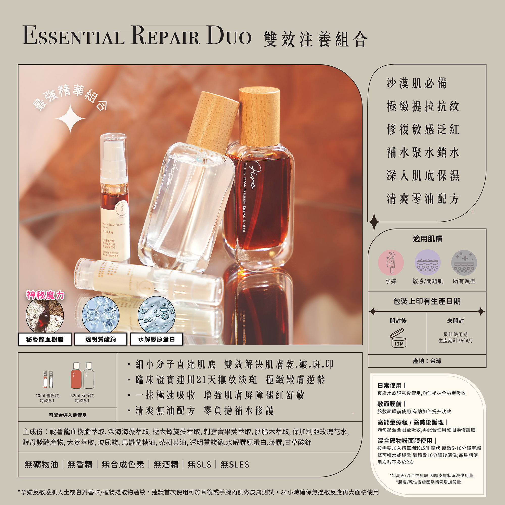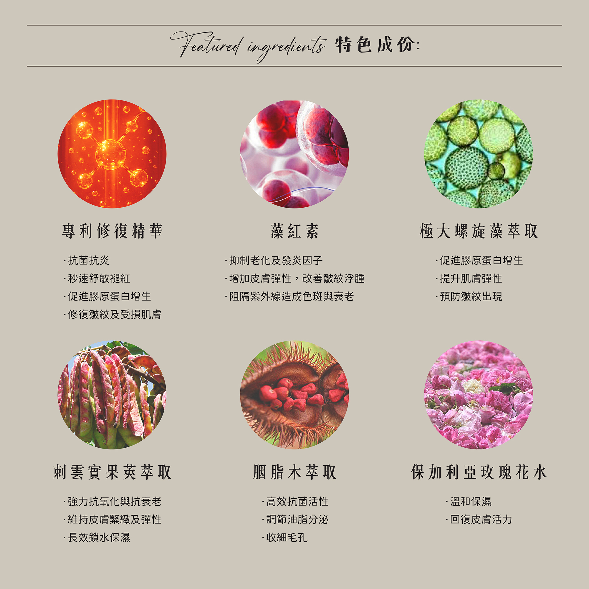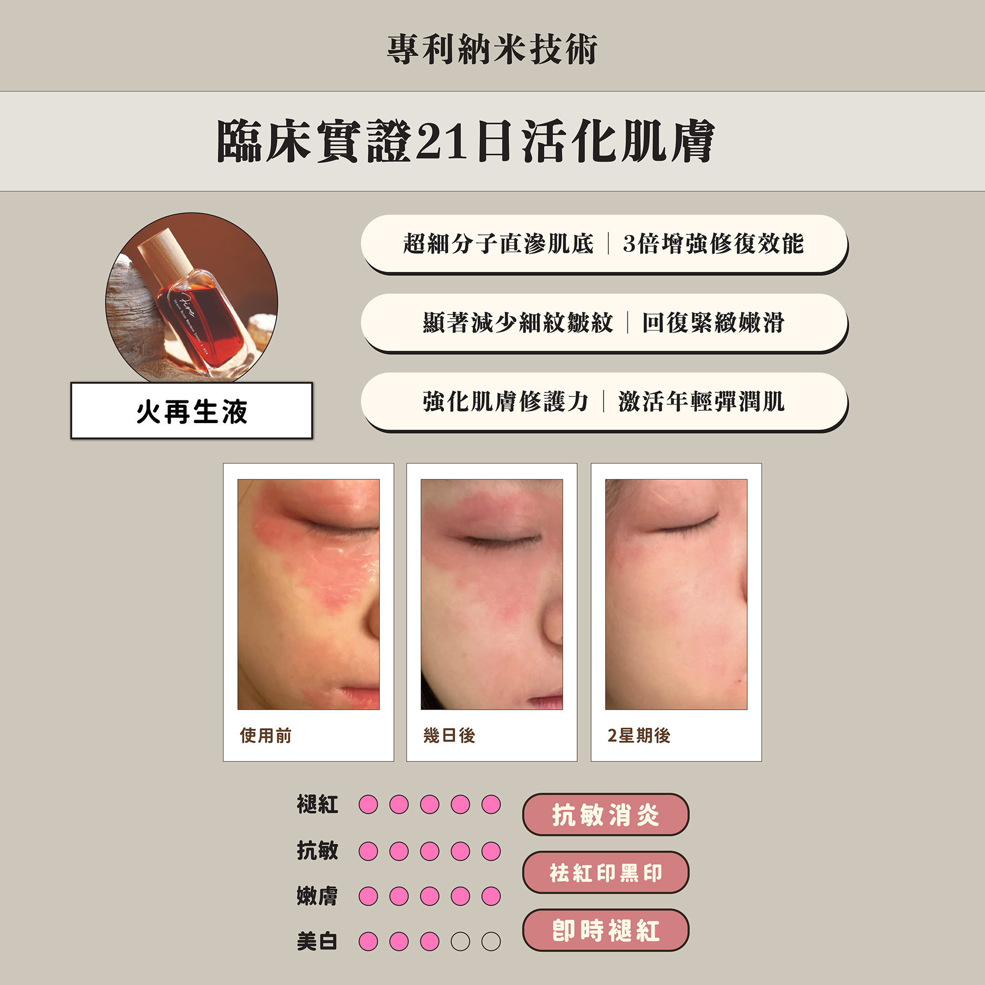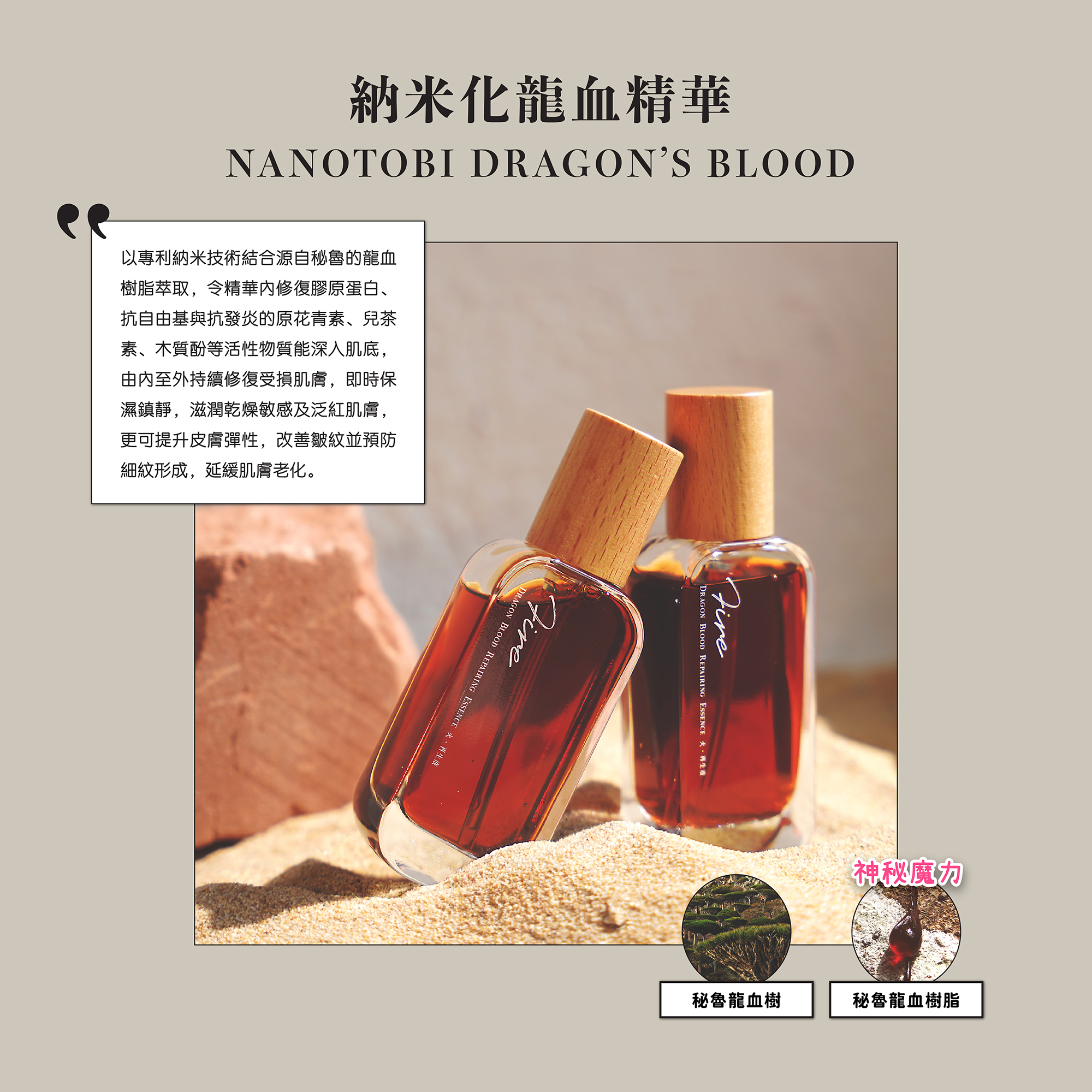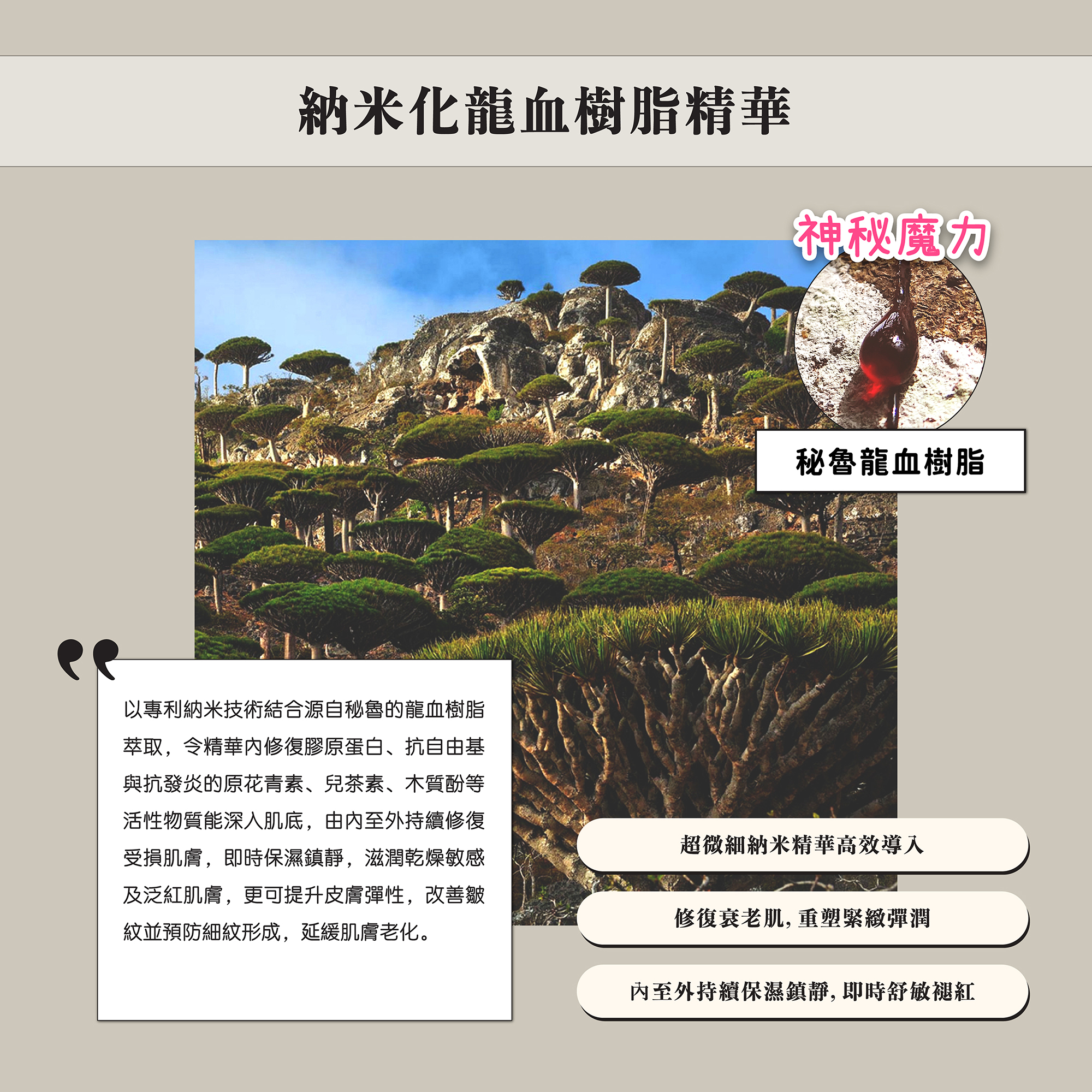 蘊含秘魯龍血樹脂萃取、深海海藻萃取、玫瑰純露3種超級護膚成分,配合升級納米化專利技術,每滴精華濃縮3倍滲透力、修復力、抗紋力,深入修復肌膚屏障,發揮抗老活膚功效,經臨床實測持續使用21天,有效改善皺紋、鬆弛、色斑、黑印、缺水、毛孔粗大和泛紅等七大肌膚問題
