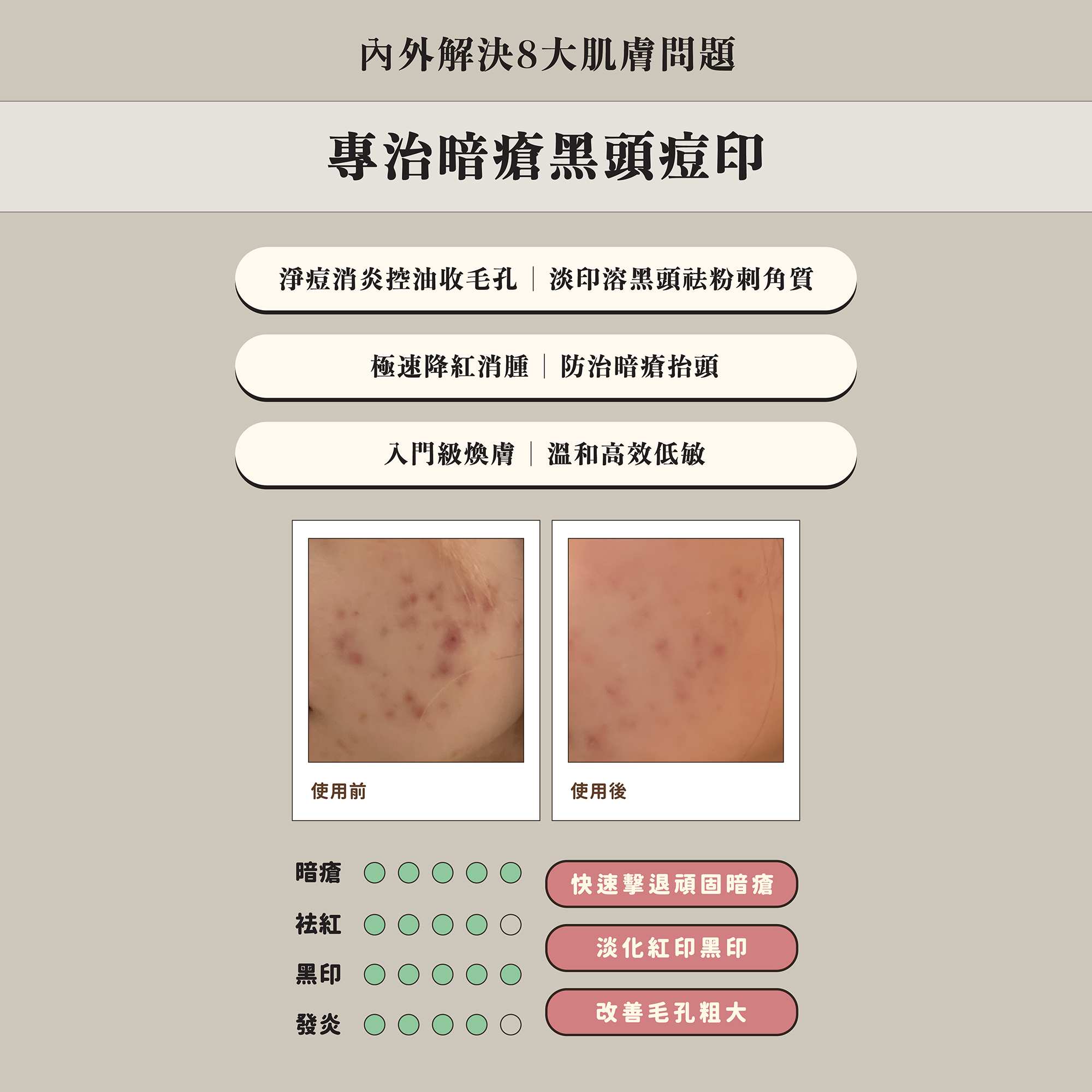專為暗瘡肌設計的抗炎修護精華,針對反覆暗瘡、紅腫發炎、暗粒等問題肌膚,提供即時舒緩功效。核心成份為溫和低敏的杏仁酸,有效代謝老廢角質、改善堵塞毛孔,從源頭改善暗瘡形成。加入複合成分,迅速針對膿包、紅腫進行降炎處理,減低感染。